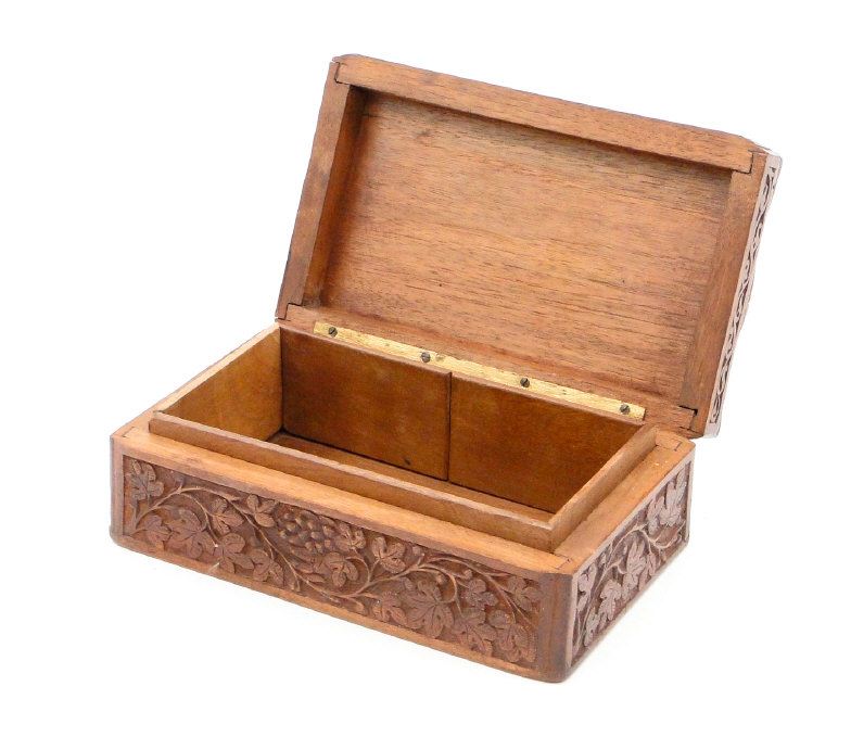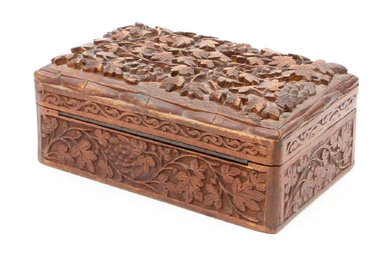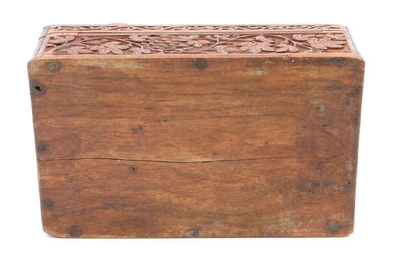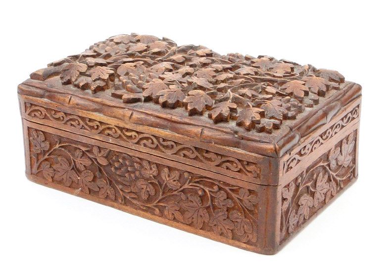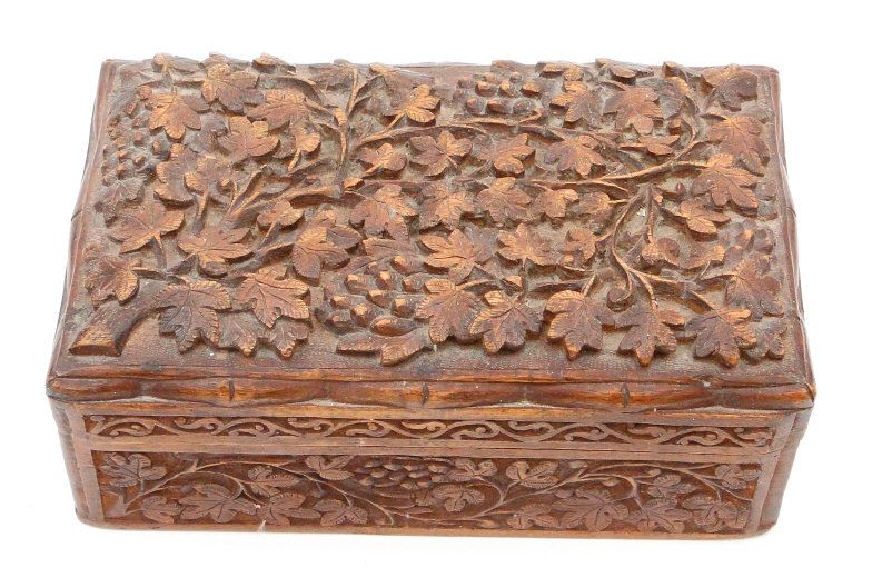 Indian hardwood box carved in relief with grapevine, 19cm in length