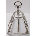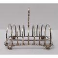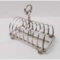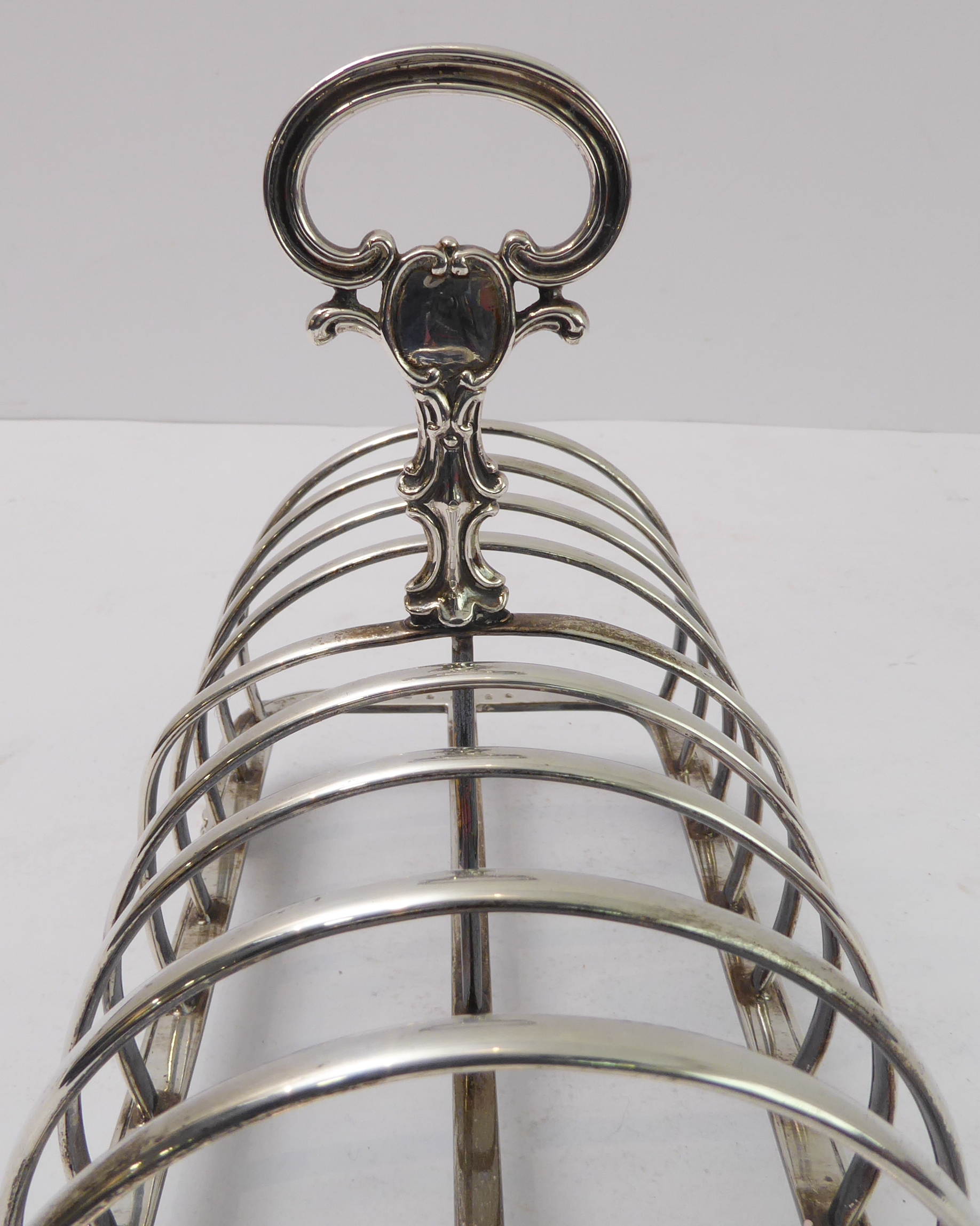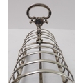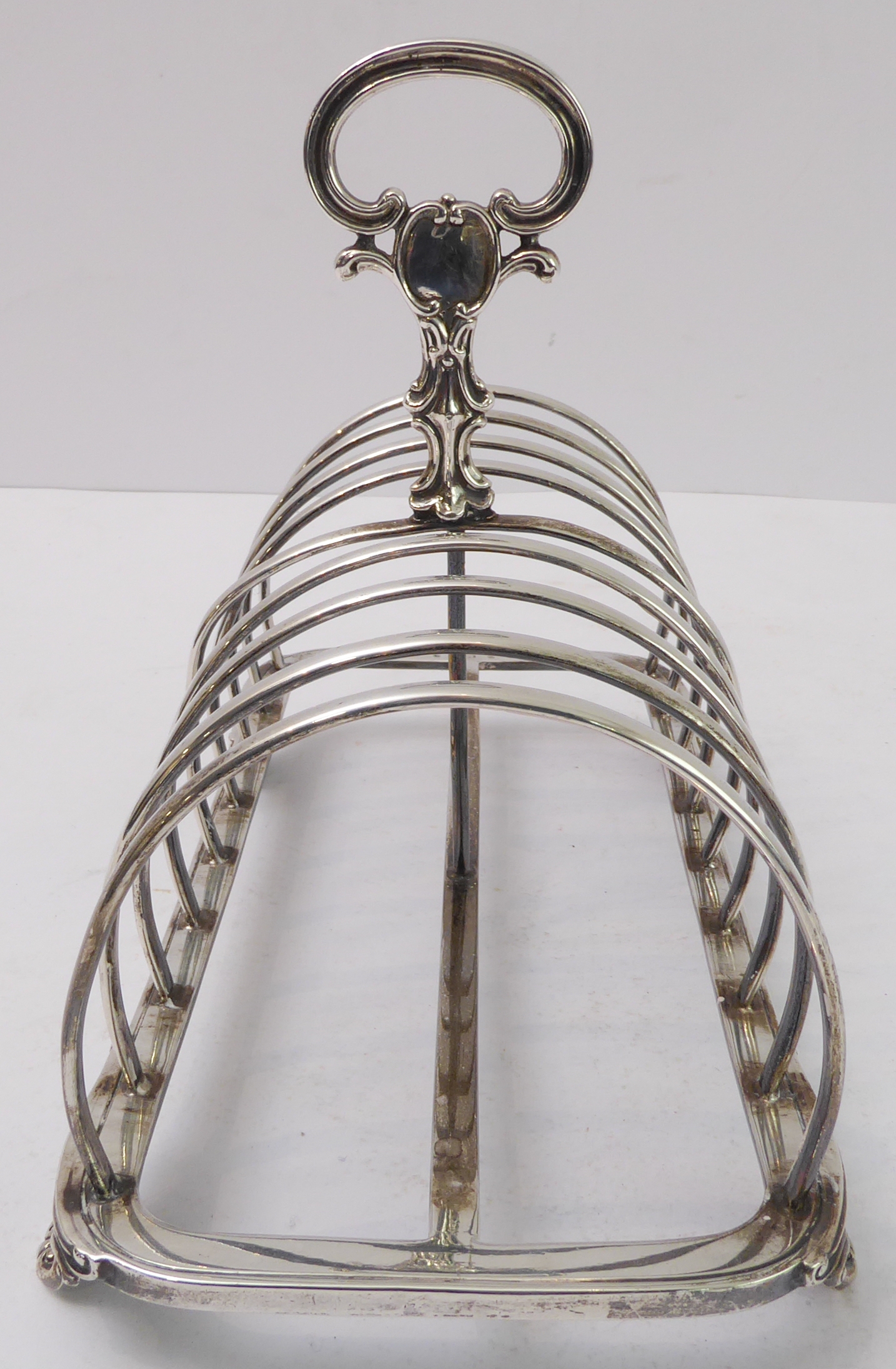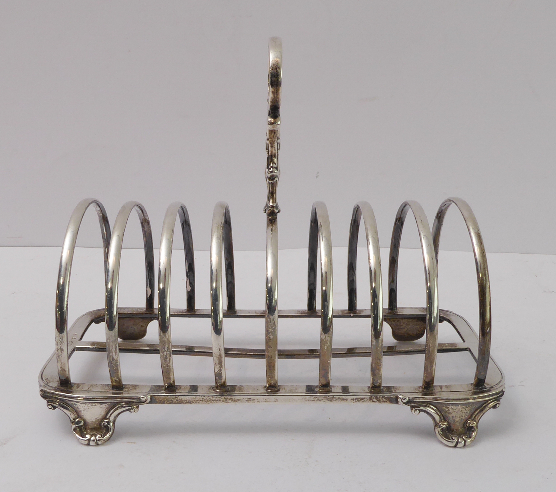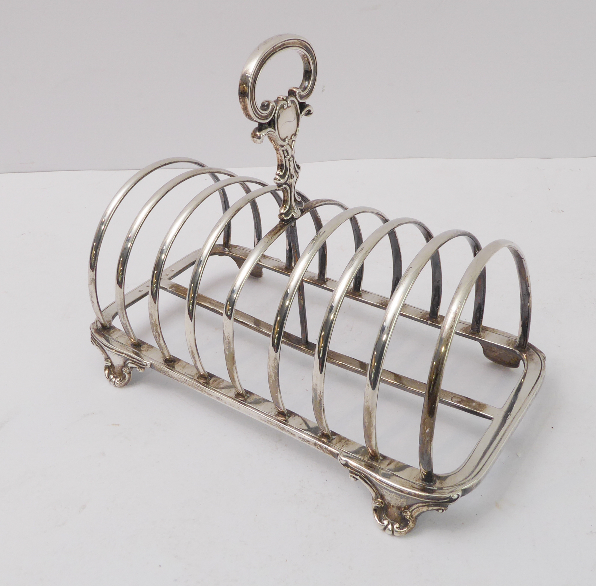 A large early Victorian hallmarked silver eight-division toast-rack: the cast scrolling handle with vacant cartouches above arches, four feet cast with C-scrolls. Edinburgh assay marks (probably 1844). (20 cm wide x 15.5 cm to tip of handle). (Approx. 453g).