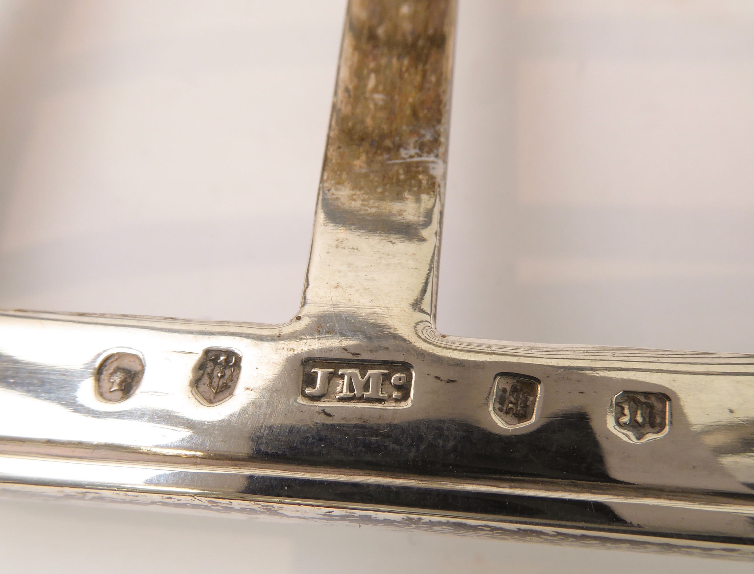 Minor surface scratches commensurate with age and use, one division with slight bend, over all with minor tarnish. Good clear assay marks and good cast handle.