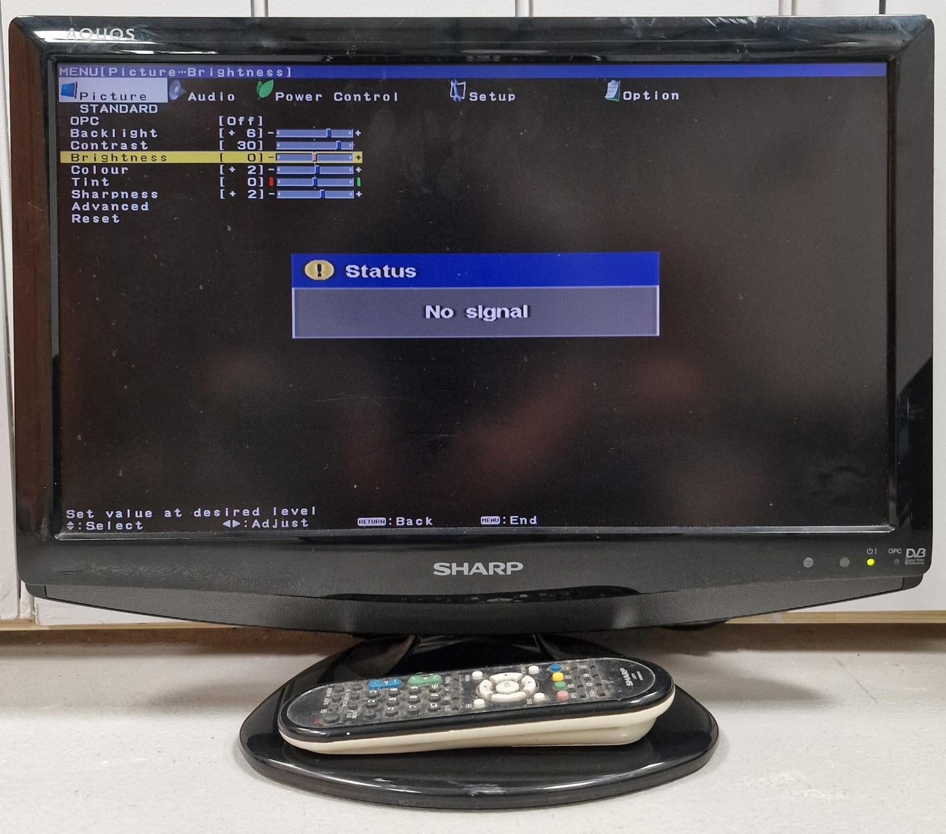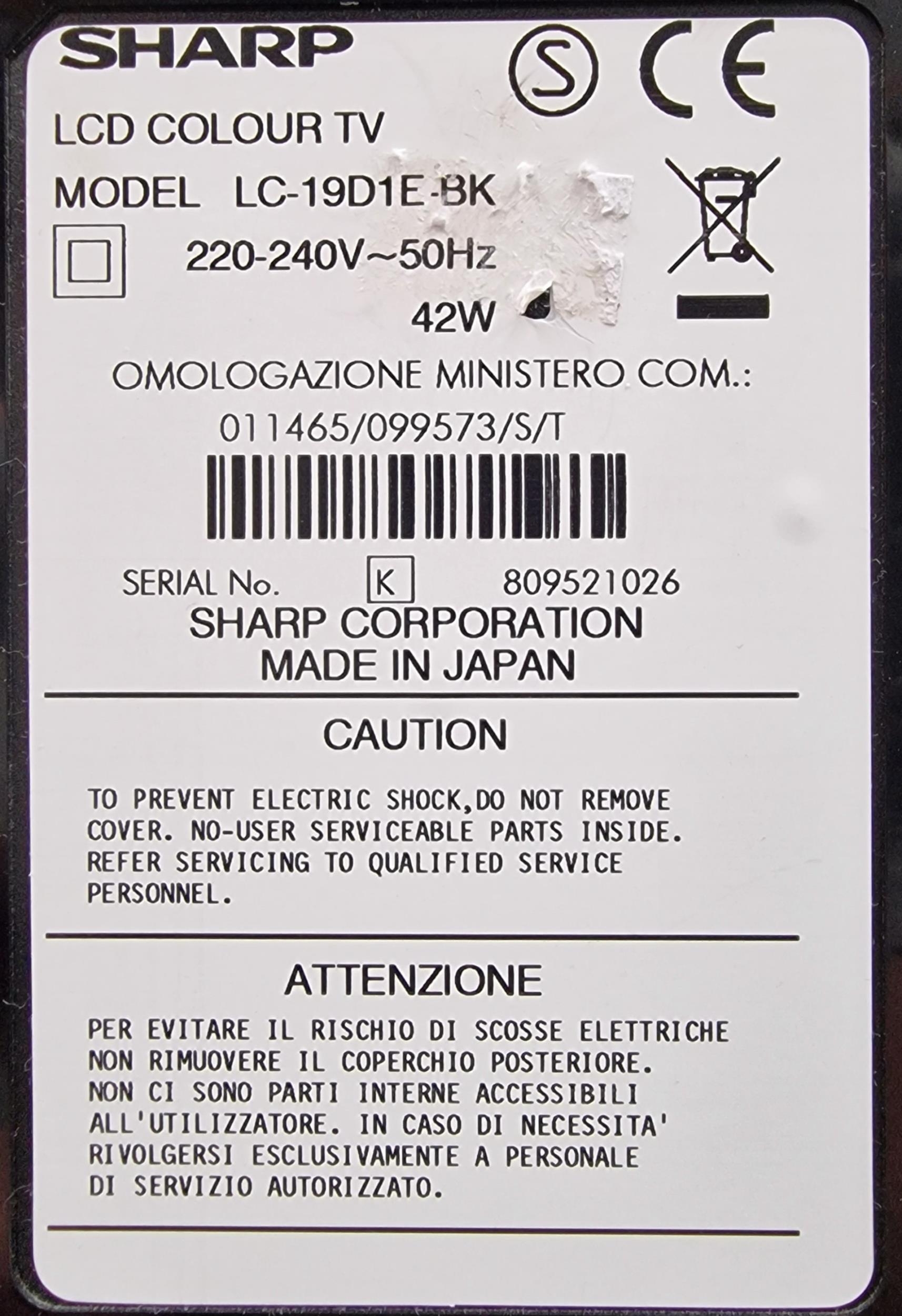 A 'Sharp Aquos' 19" LCD/Freeview TV, model no. LC-19D1E-BK. Complete with remote control. PAT test pass & functionality test indicates in working order.