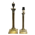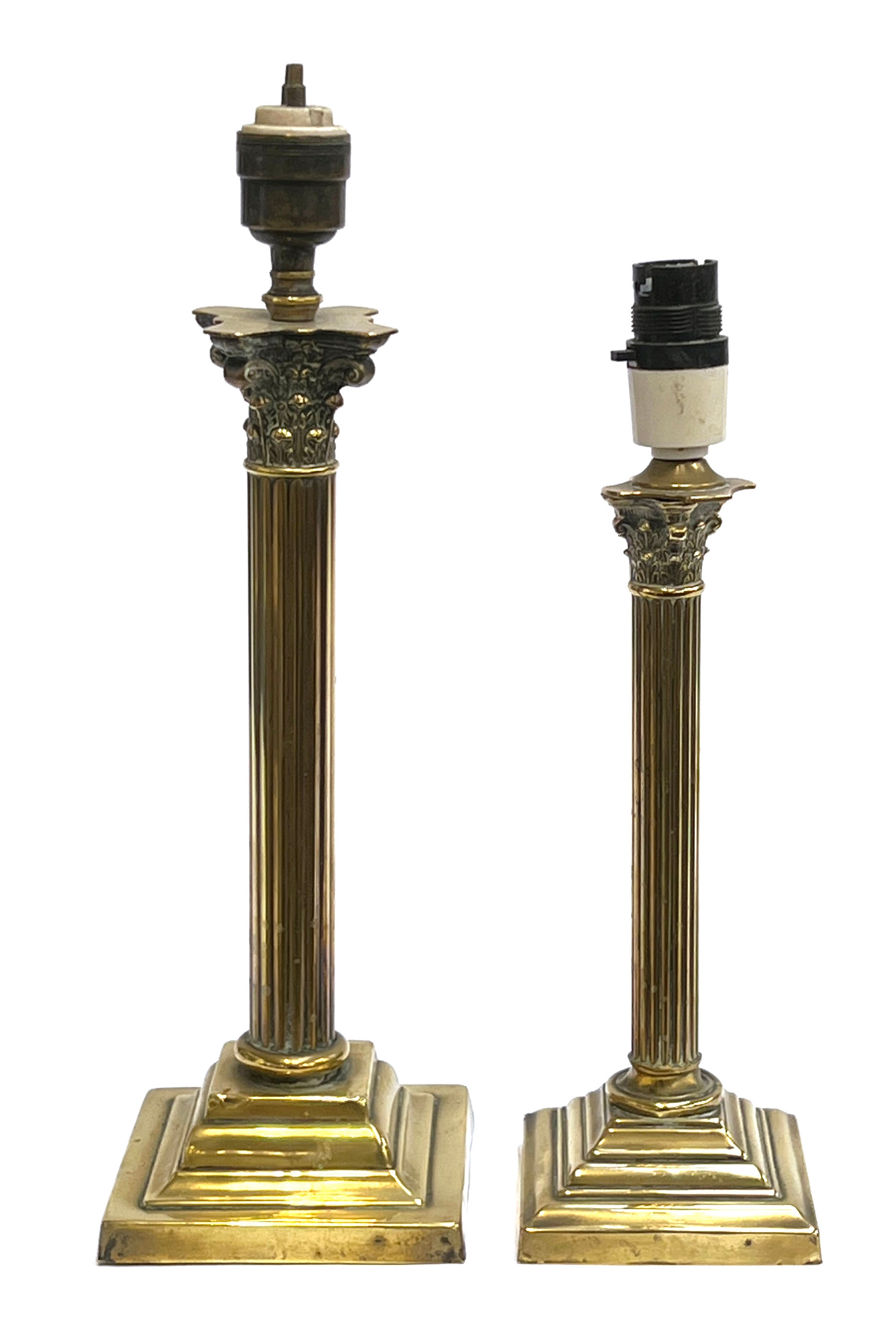 Two brass corinthian column table lamps, 29cmH and 24cmH to base of fitting