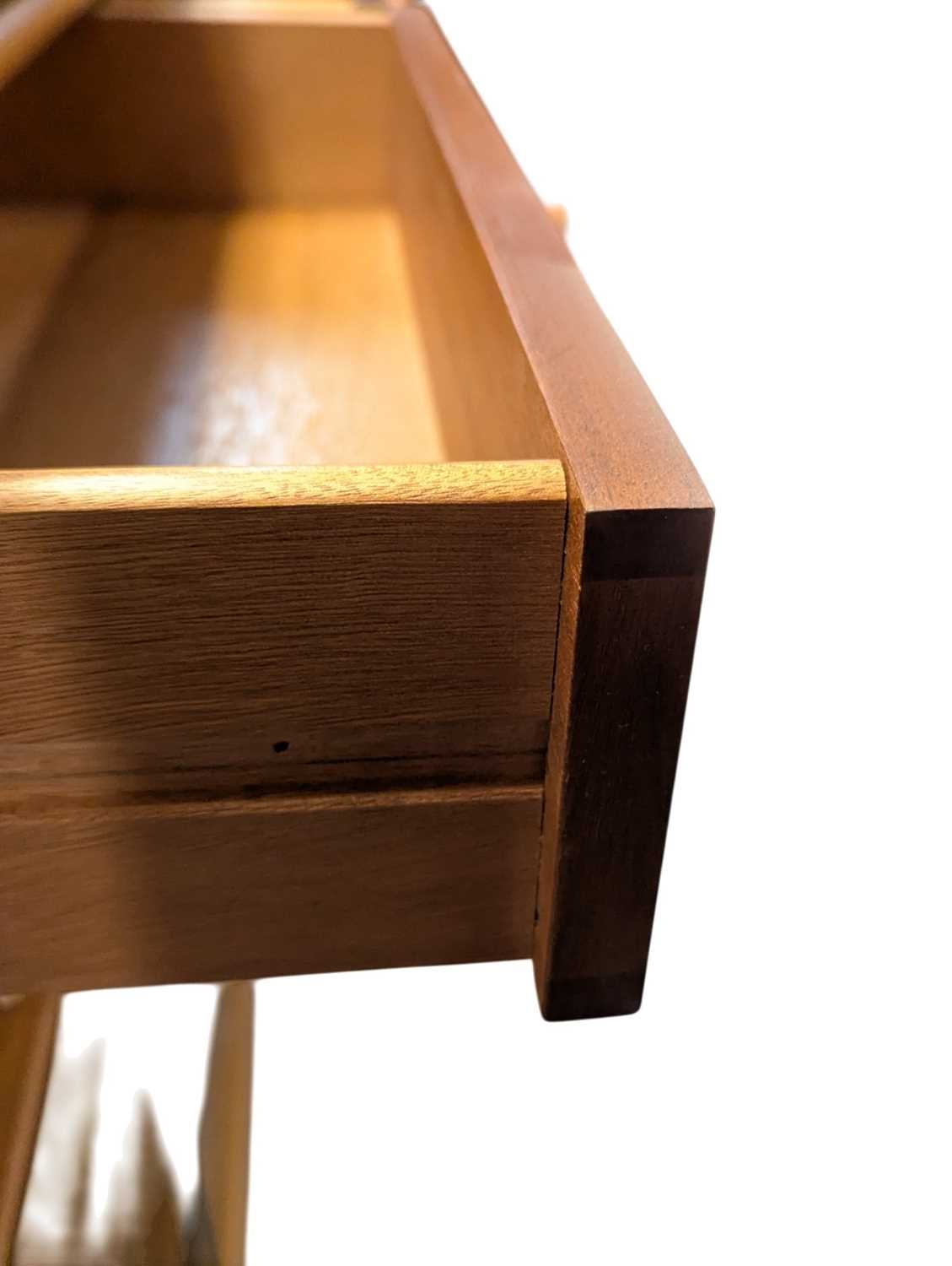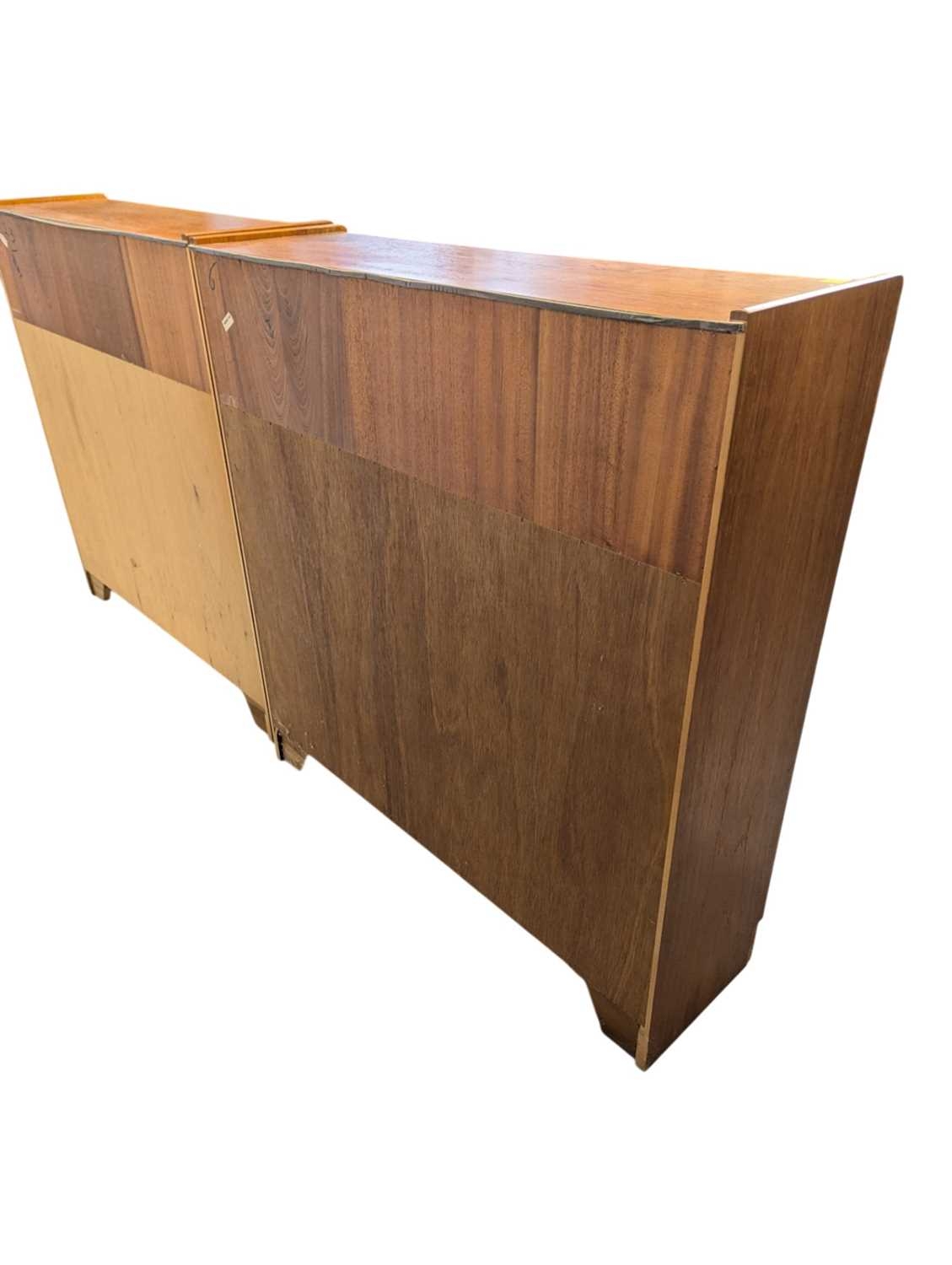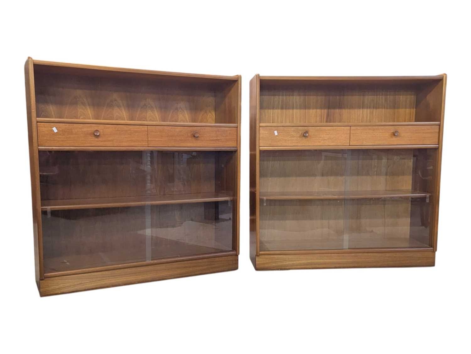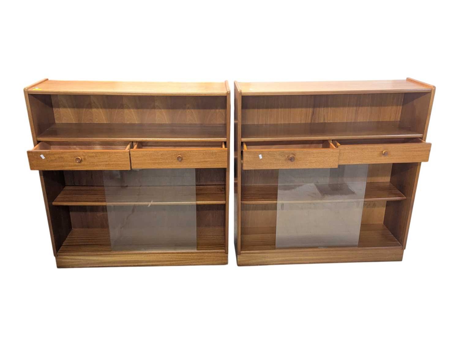 Two Nathan (now Parker Knoll) teak bookcases, each having two central drawers adding to the appeal of these units, raised on plinth bases. Measures approx: 107x103x32cm