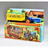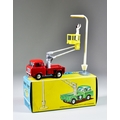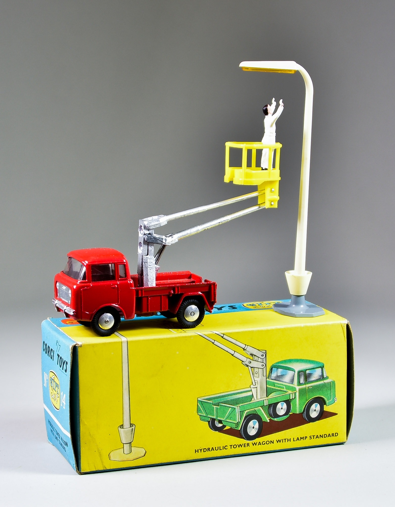 A Corgi Toys Diecast Model Car No. 14 "Hydraulic Tower Wagon with Lamp Standard Gift Set", with red truck body, spun hubs, chrome metal hydraulics, yellow plastic basket, white lamp, grey stand and figure, in original box with protective card sleeve and paper insert