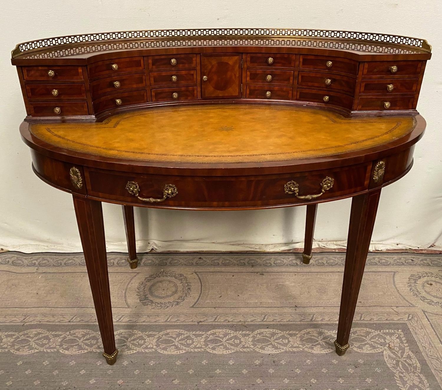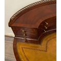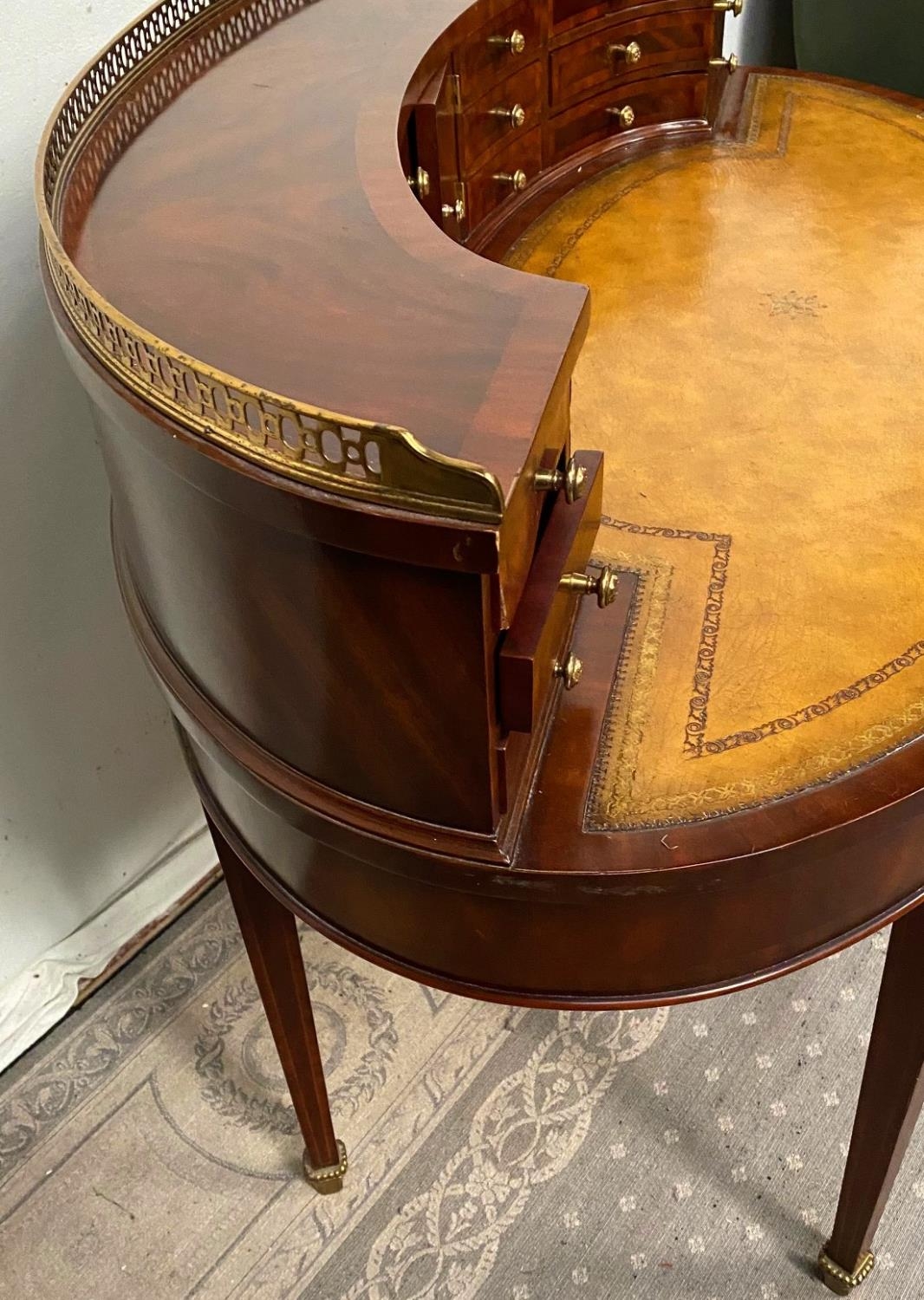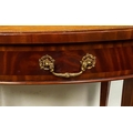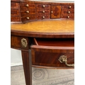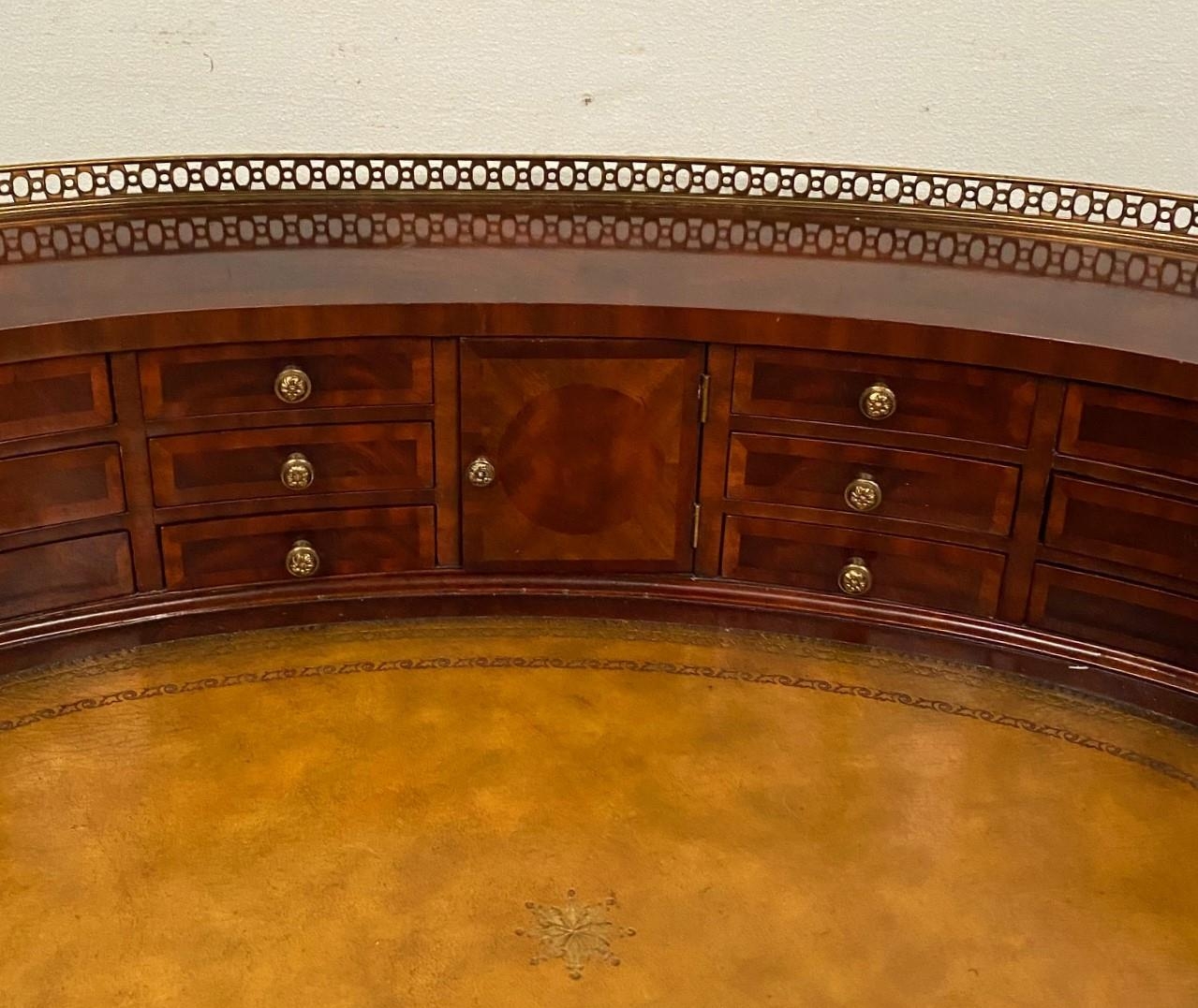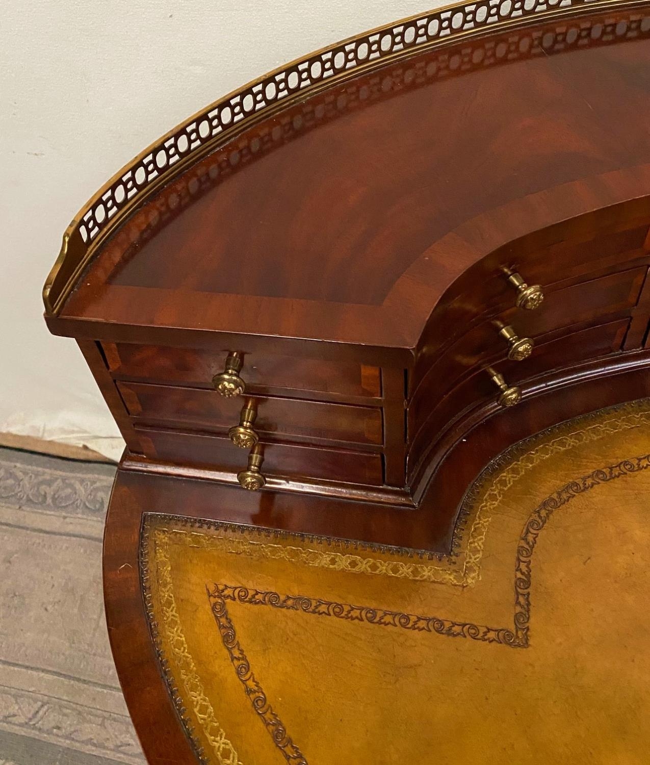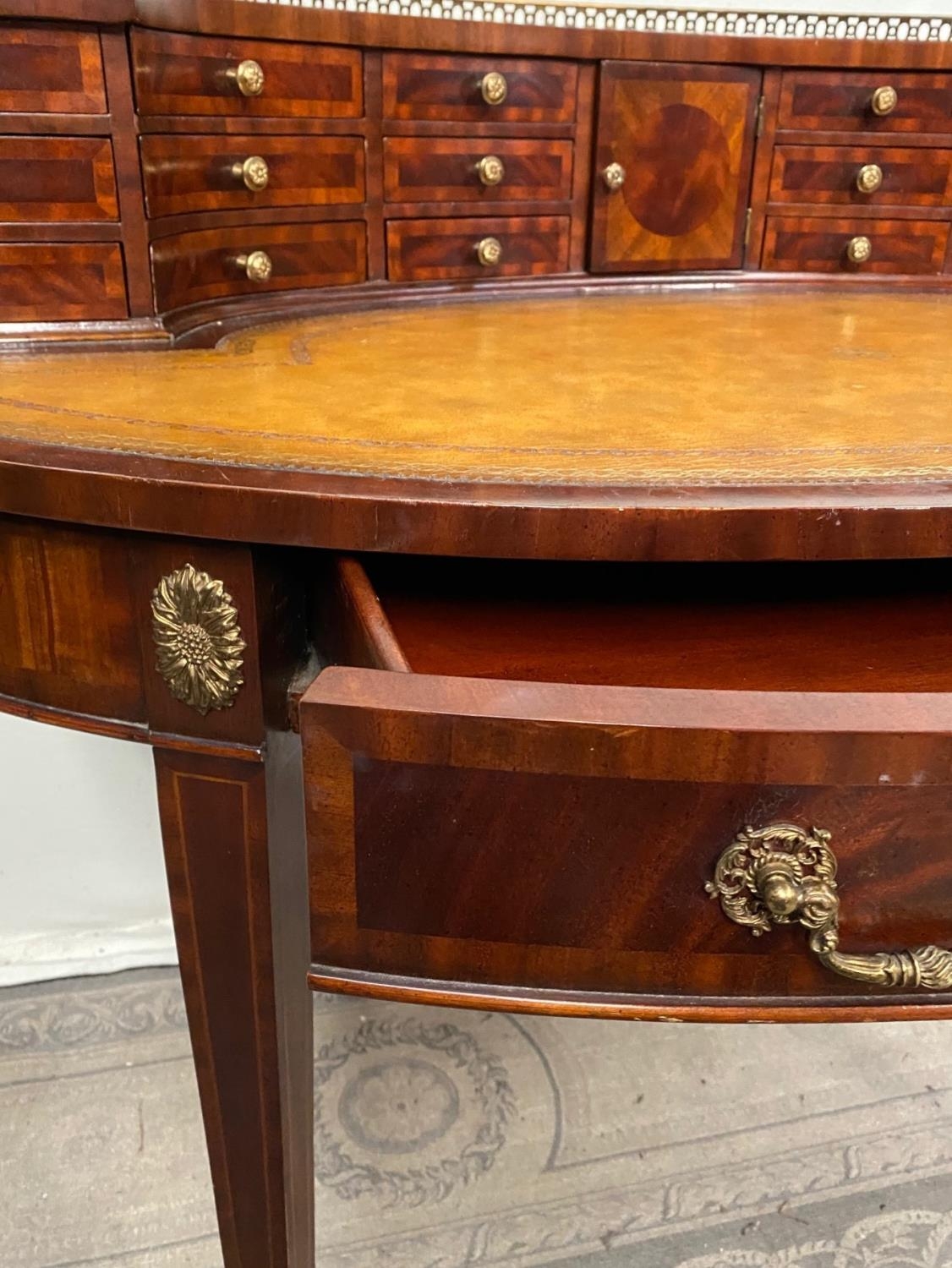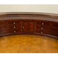 A FINE MAHOGANY CROSSBANDED OVAL SHAPED DESK, with curved raised gallery back consisting of a pierced brass gallery to the top and a drawer section beneath, each with cross-banded frame and small brass pull handle, with a centre cabinet, with a tooled leather writing surface with bow front having a long frieze drawer having ornate brass swing handles, all raised on tapered string inlaid legs with brass toes, 72cm high to the desk top, 92cm high to the gallery back, 114cm wide x 69cm deep approx.