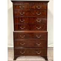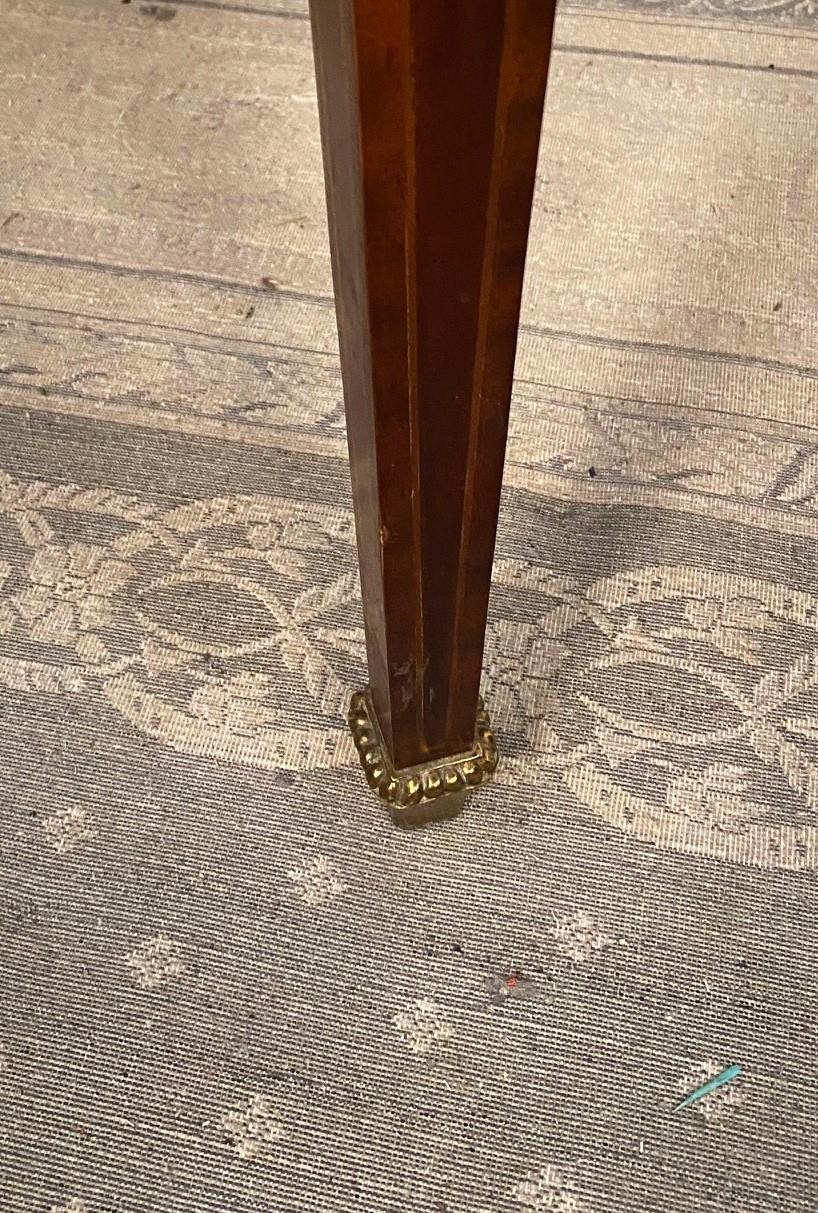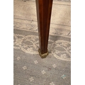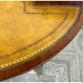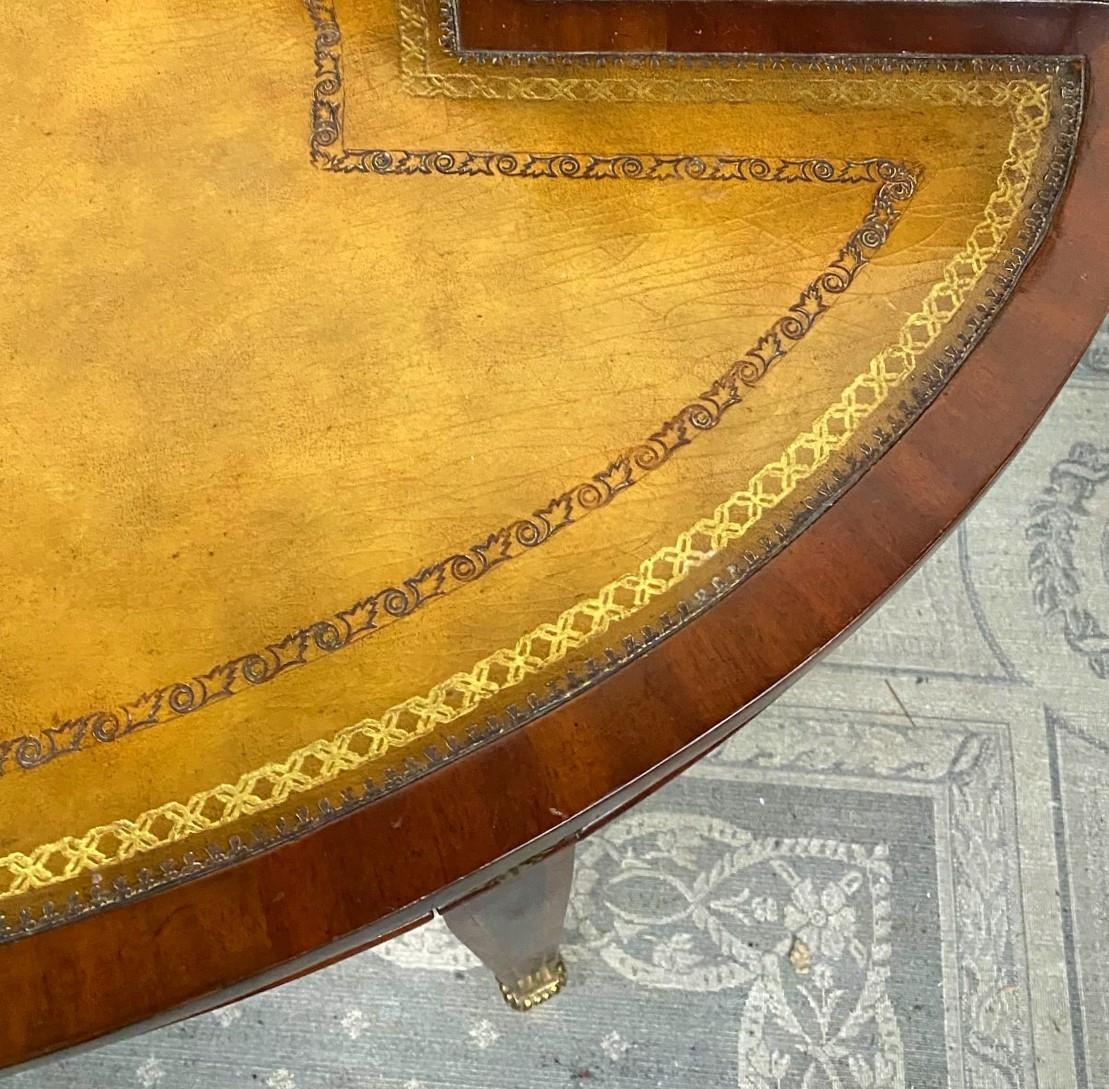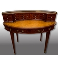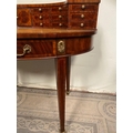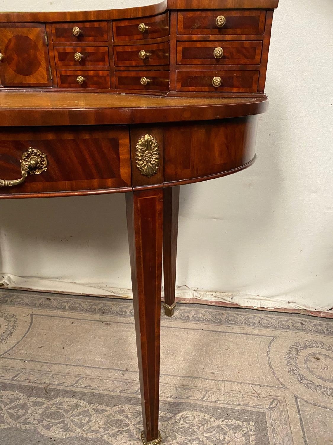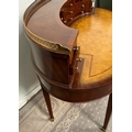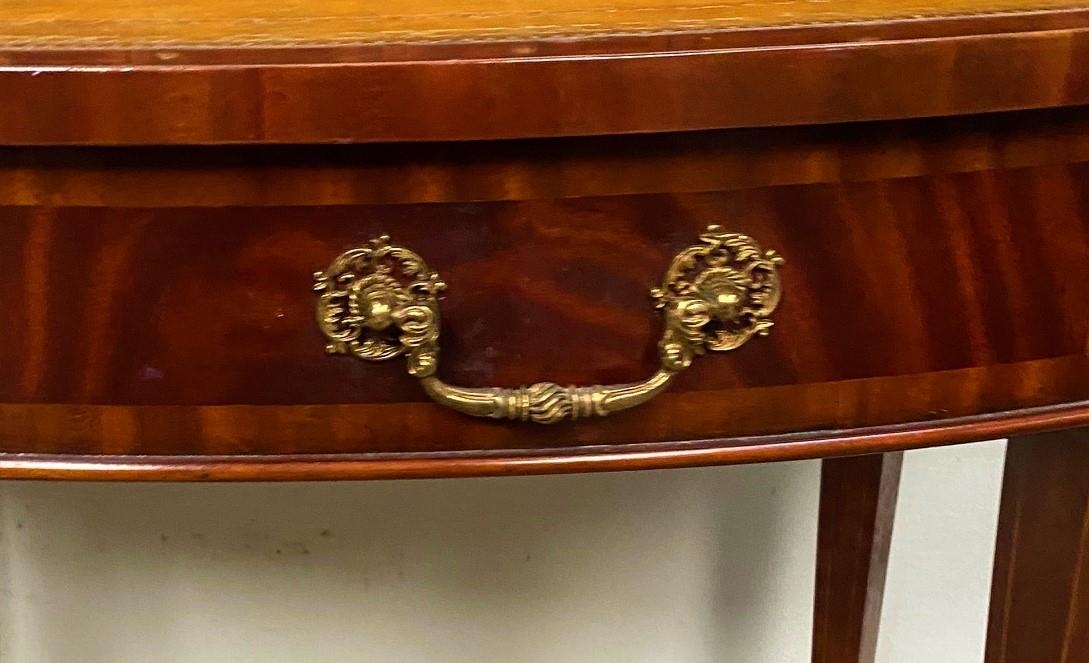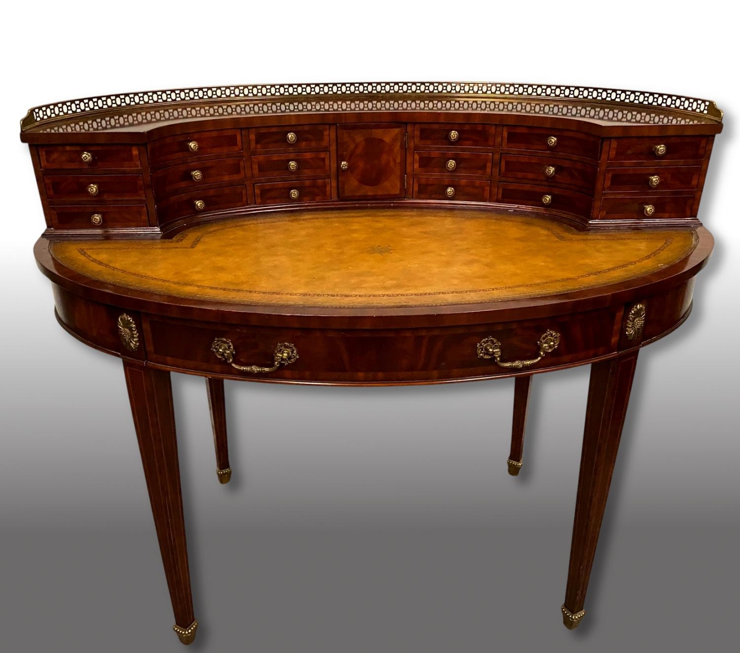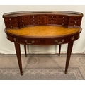 A FINE MAHOGANY CROSSBANDED OVAL SHAPED DESK, with curved raised gallery back consisting of a pierced brass gallery to the top and a drawer section beneath, each with cross-banded frame and small brass pull handle, with a centre cabinet, with a tooled leather writing surface with bow front having a long frieze drawer having ornate brass swing handles, all raised on tapered string inlaid legs with brass toes, 72cm high to the desk top, 92cm high to the gallery back, 114cm wide x 69cm deep approx.