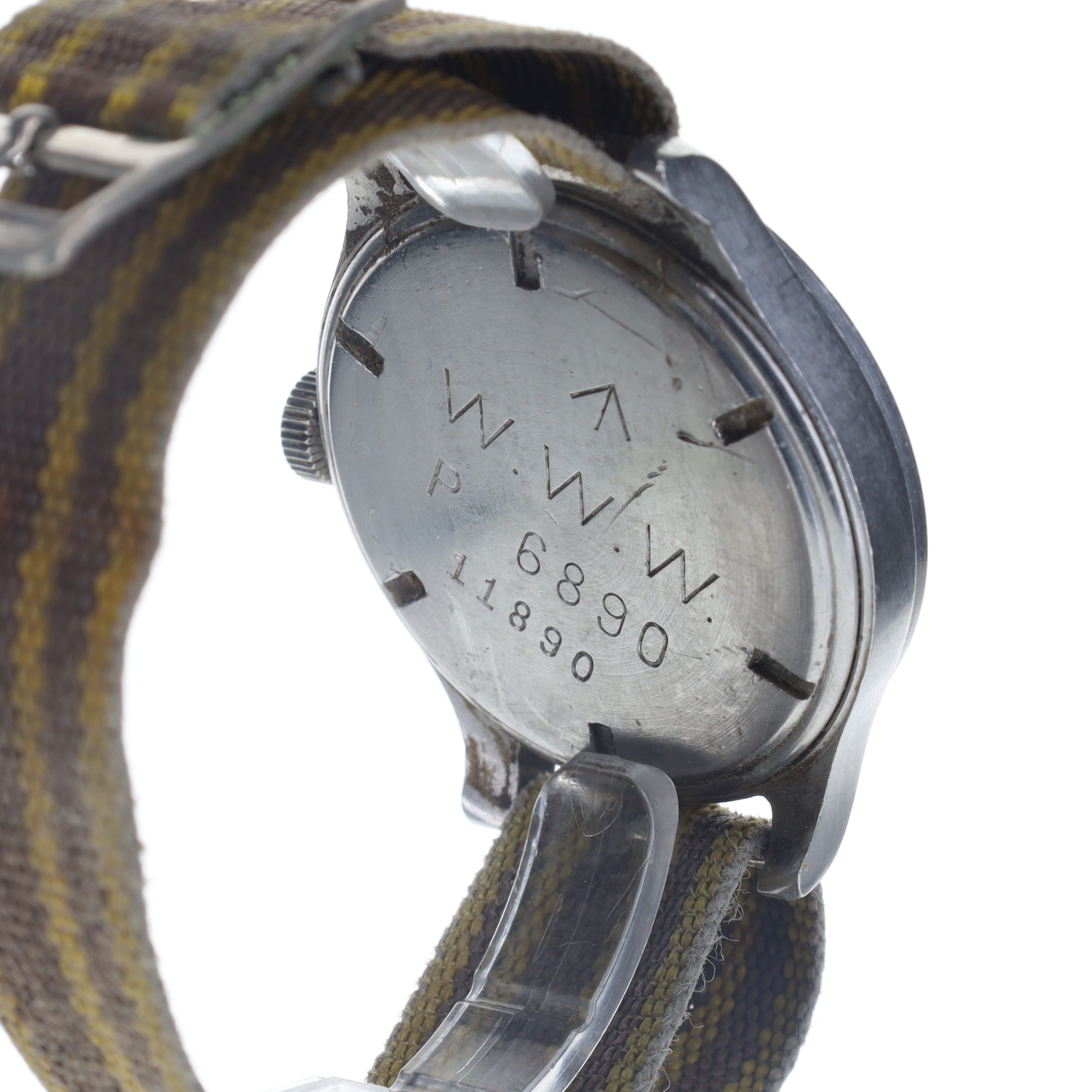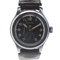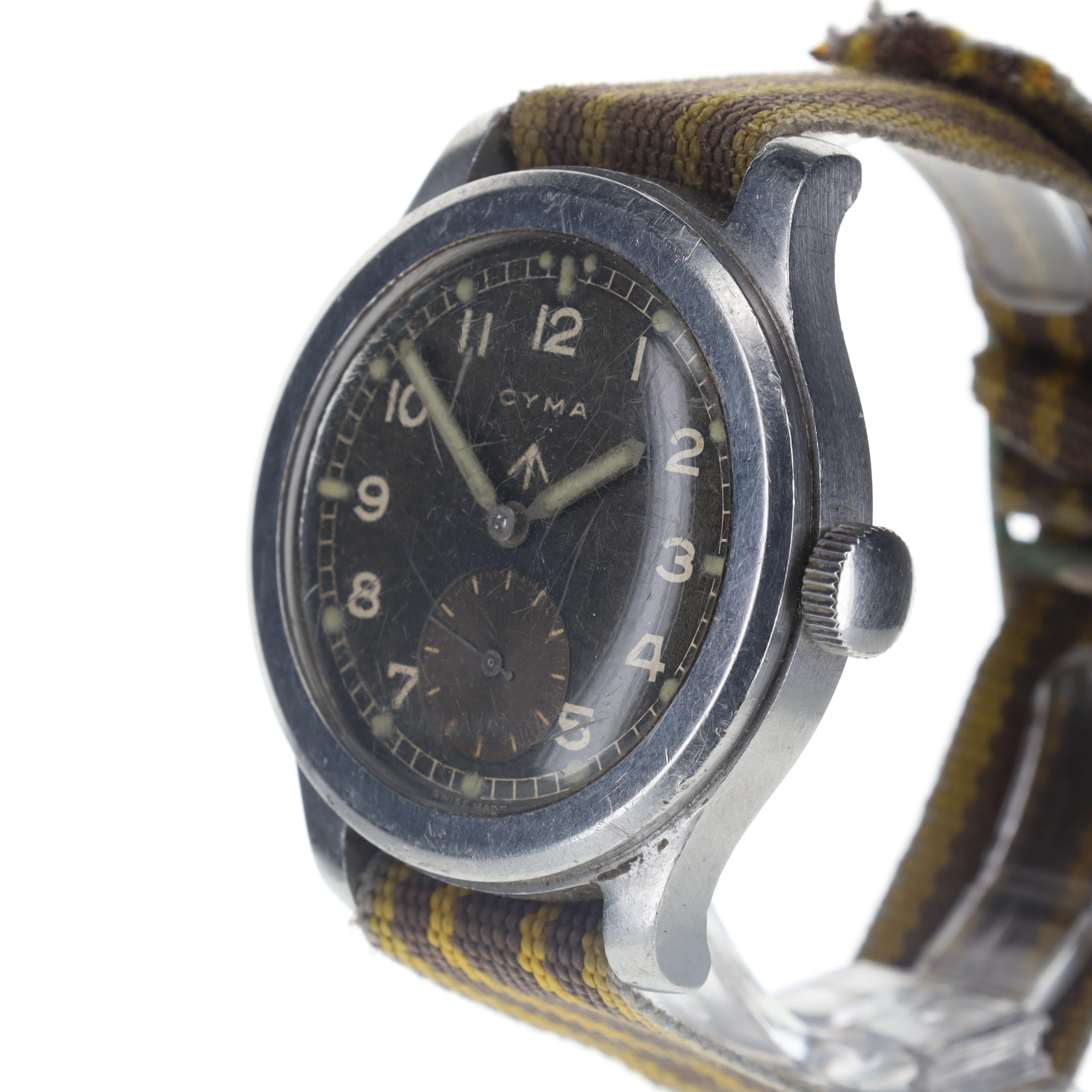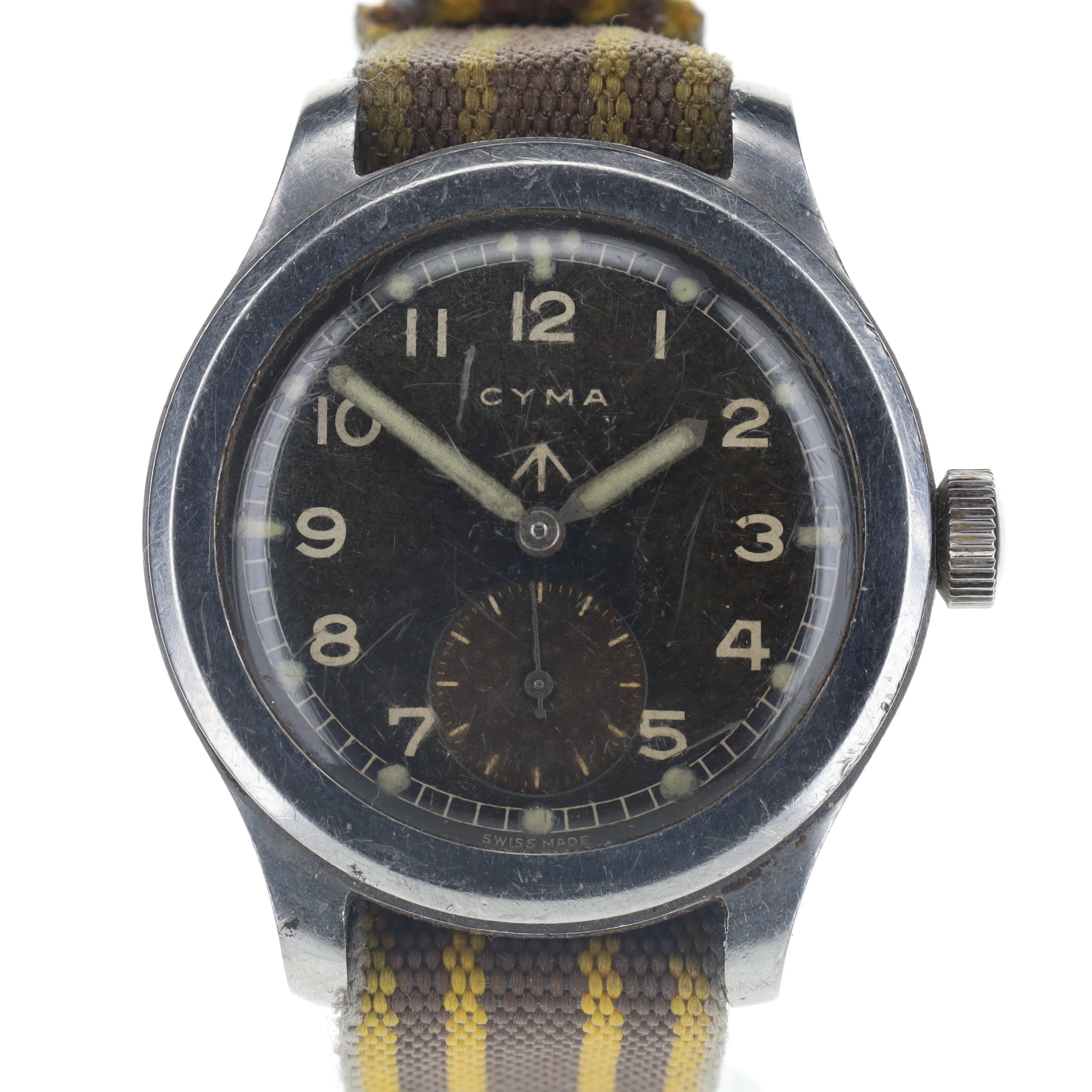 Cyma - 'Dirty Dozen' WW2 Era Military Issued Watch. Cyma signed 234 hand wind movement. Stainless steel case, aftermarket NATO strap. Acrylic crystal. Plain black dial with Arabic numerals and sub seconds dial, Lume markers, sword hands and military broad arrow. Watch is in working order, no box or papers included.