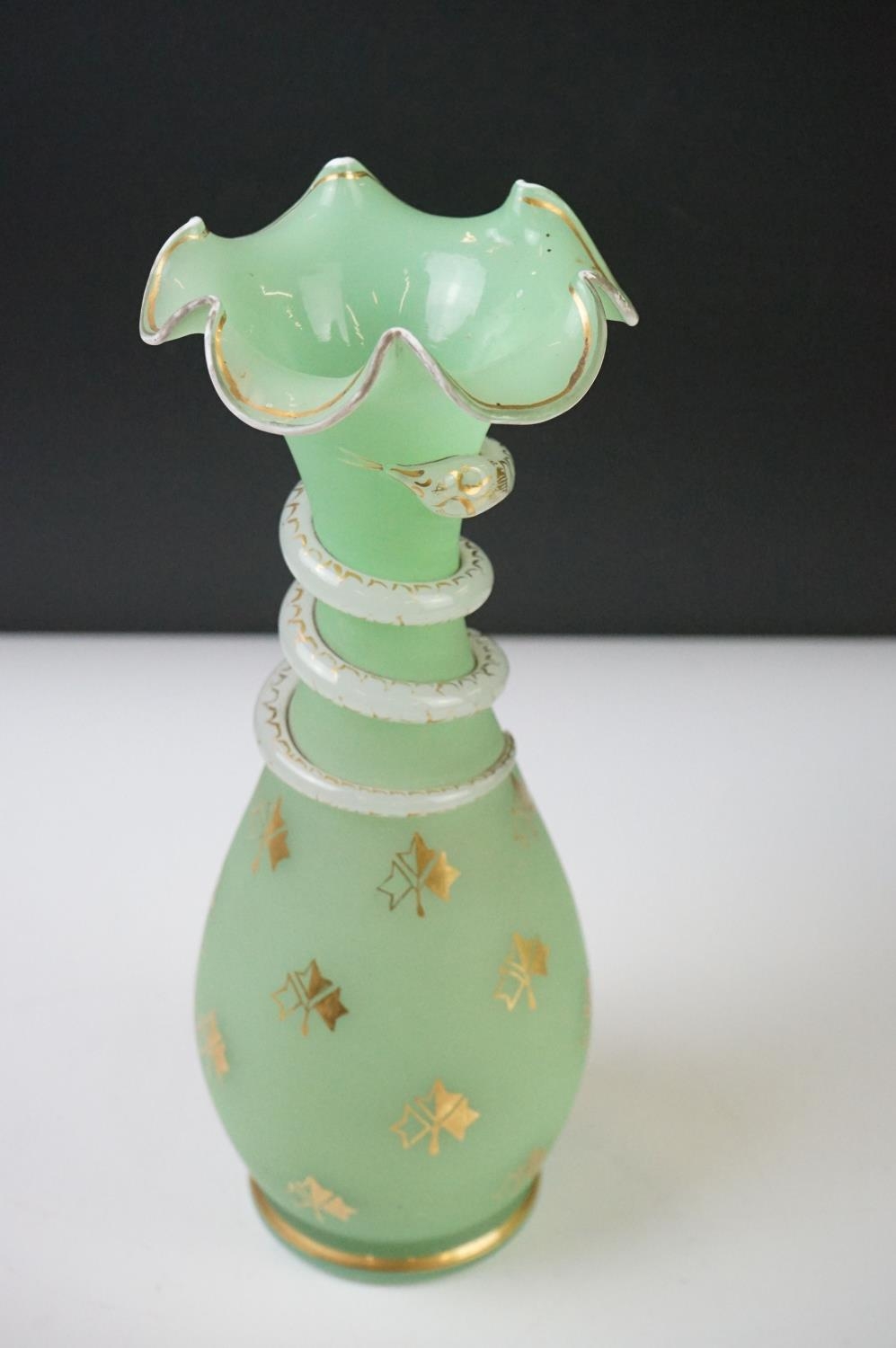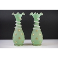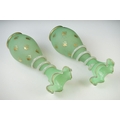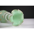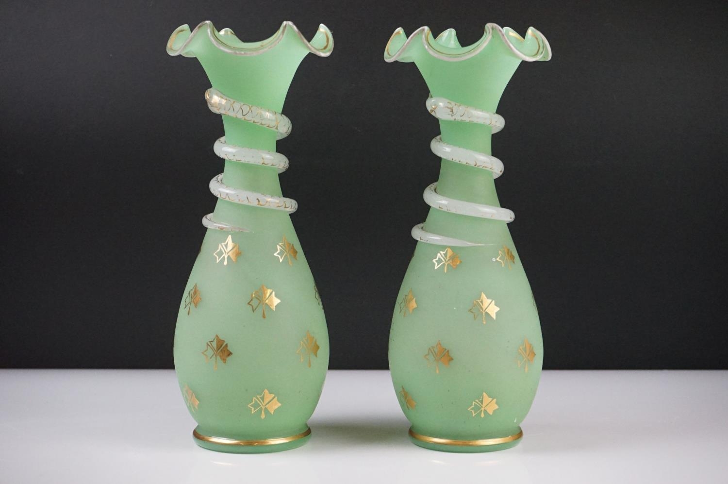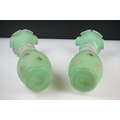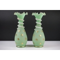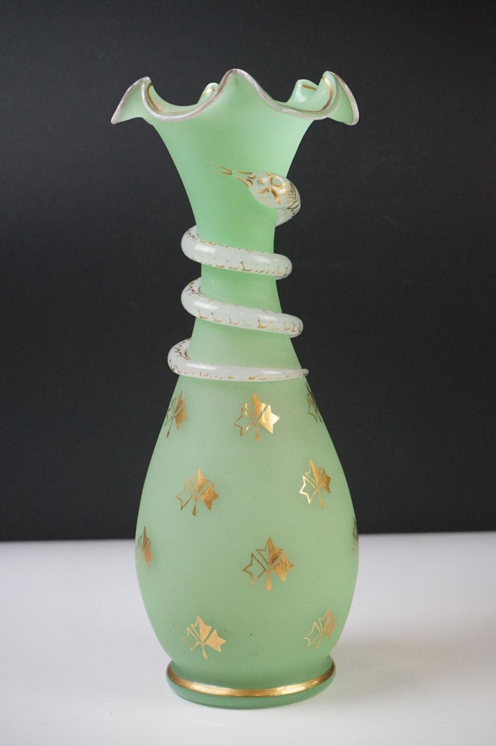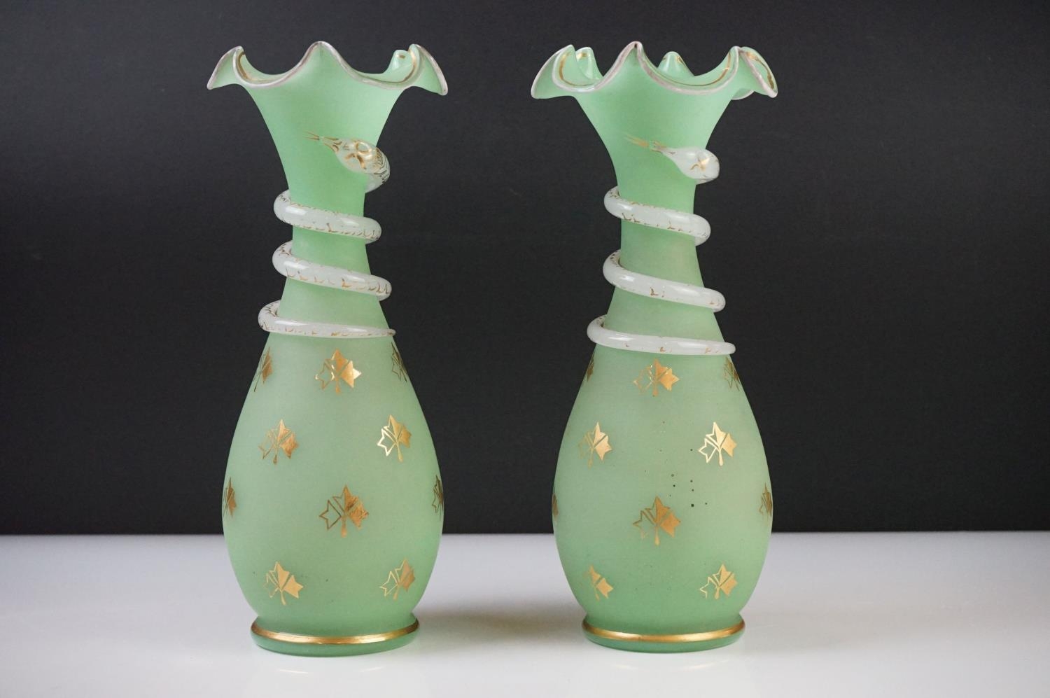Pair of Trumpet Shape Green Glass Vases, the necks with applied pale green glass entwined snakes, 27cm high