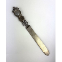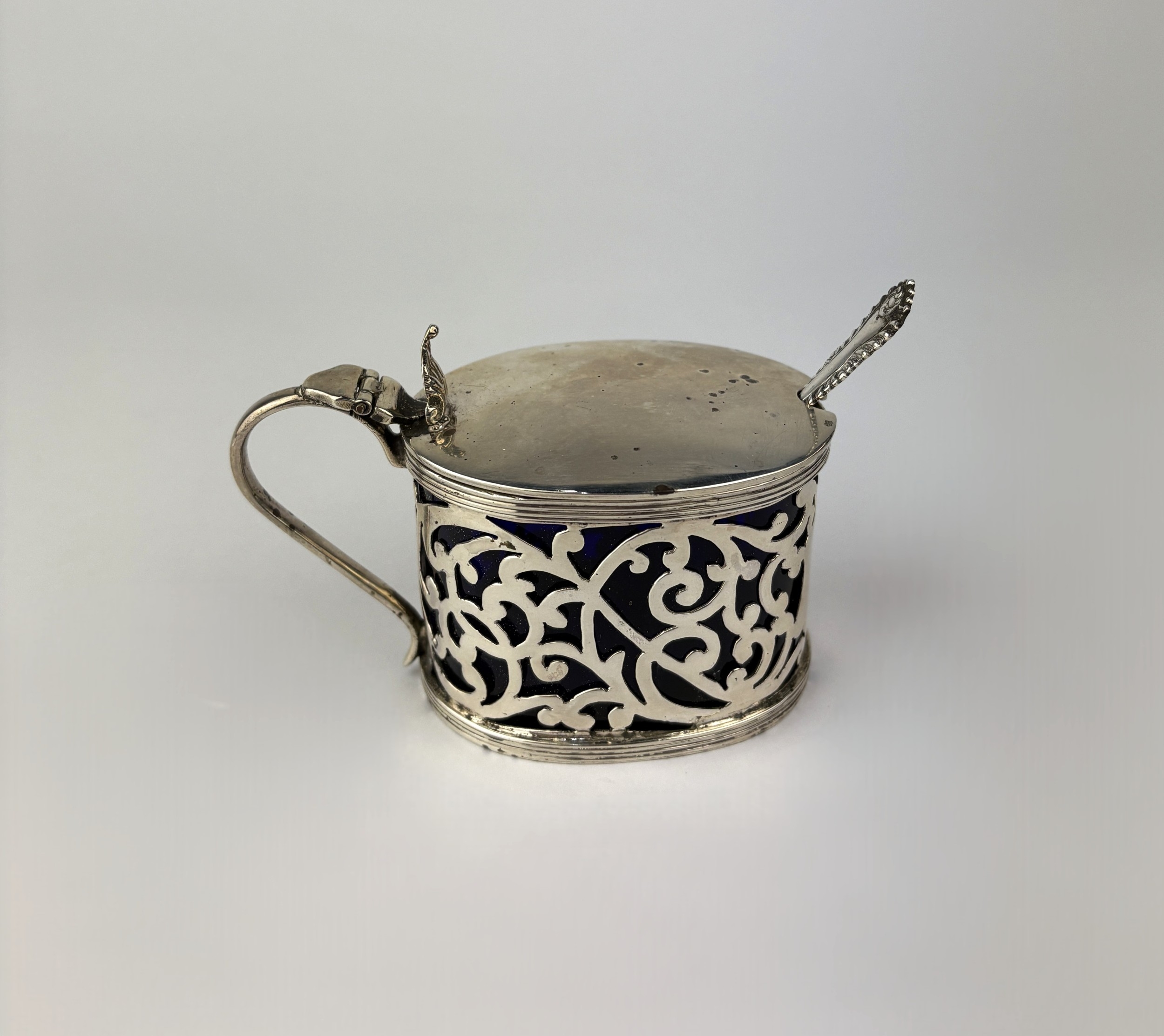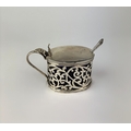 An Edwardian pierced silver mustard pot, makers marks rubbed, Birmingham, 1904, with blue glass liner, together with an associated silver condiment spoon, height 6cm, gross silver weight 2.7oz (2)