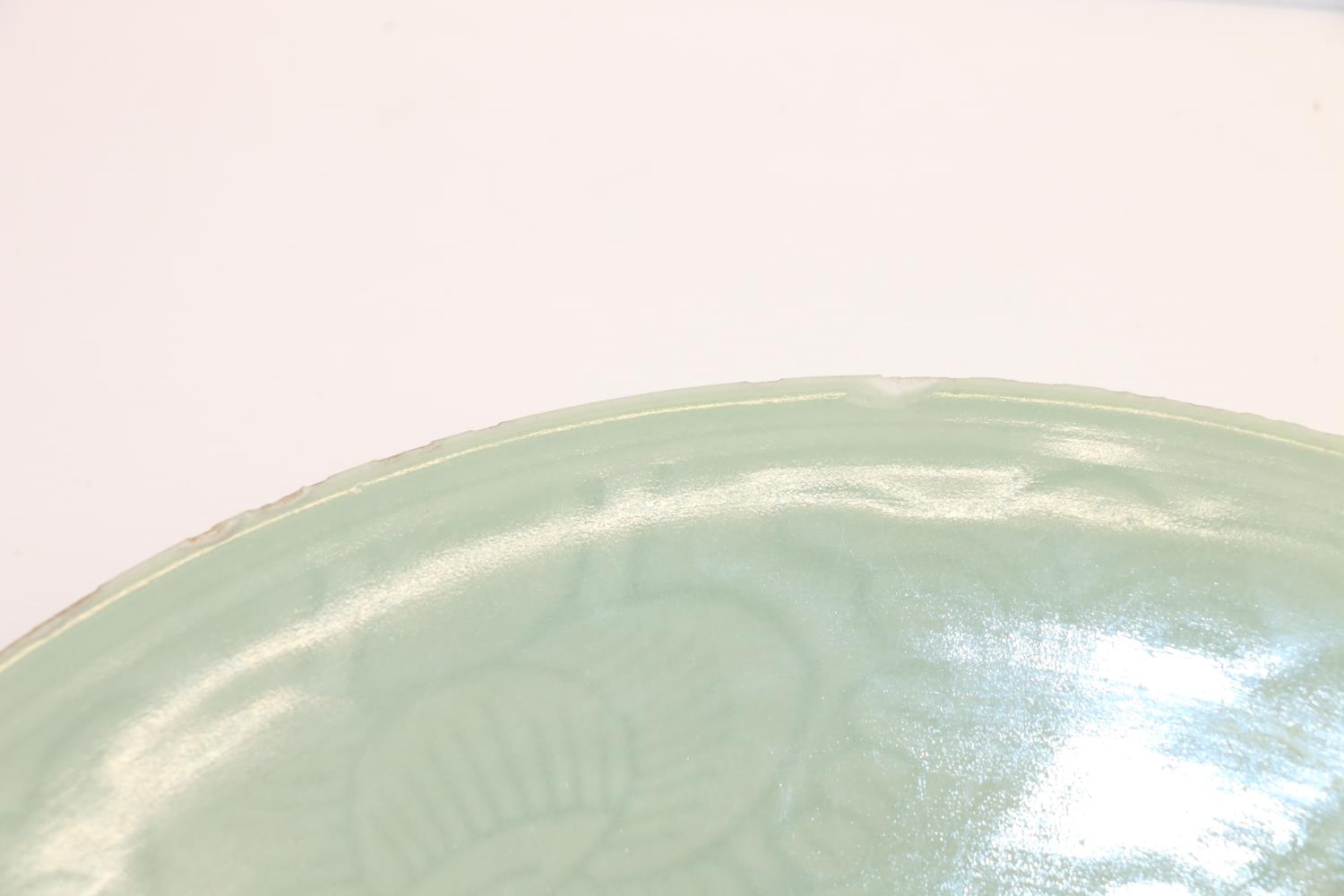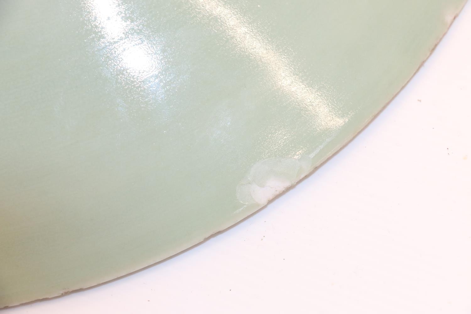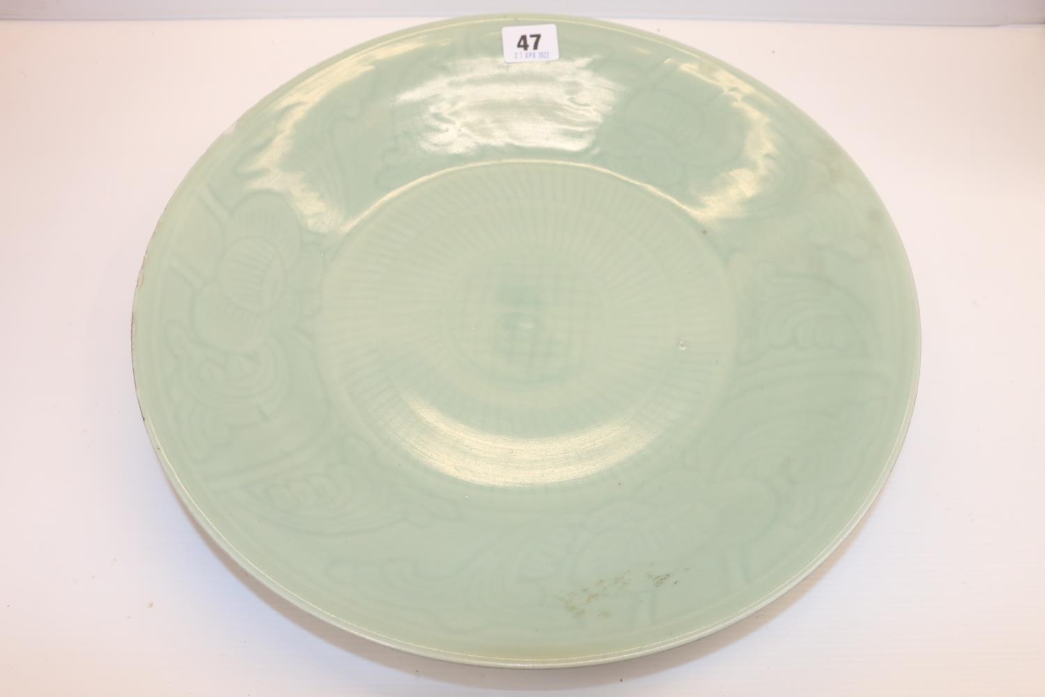 Large oriental celadon ground shallow dish, 36cm.