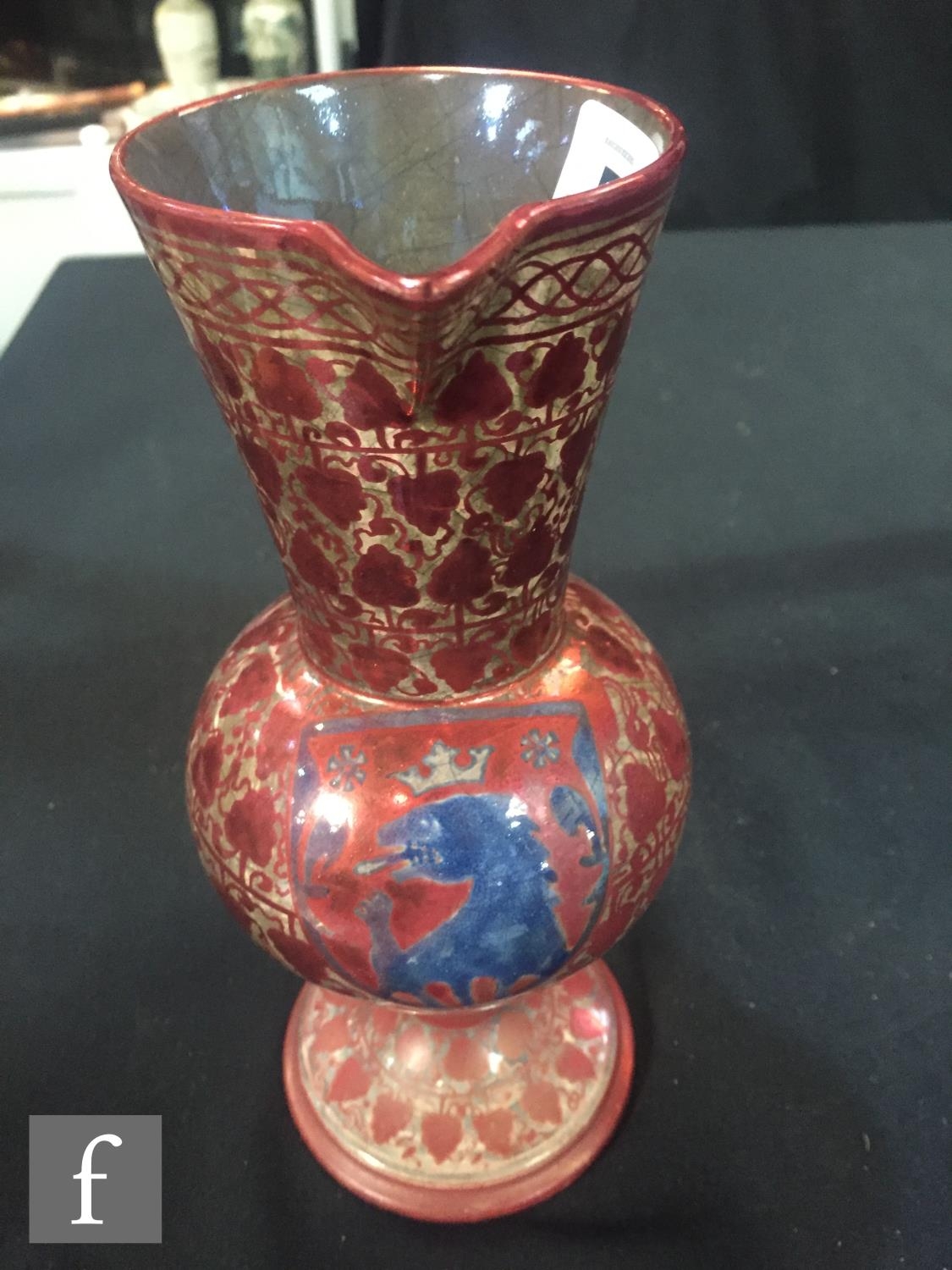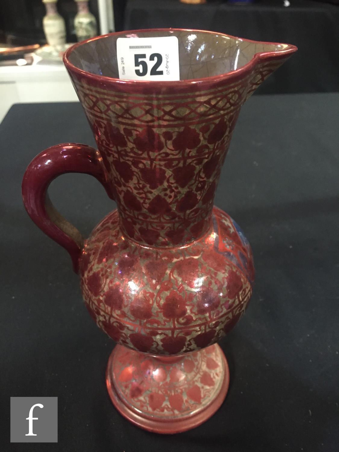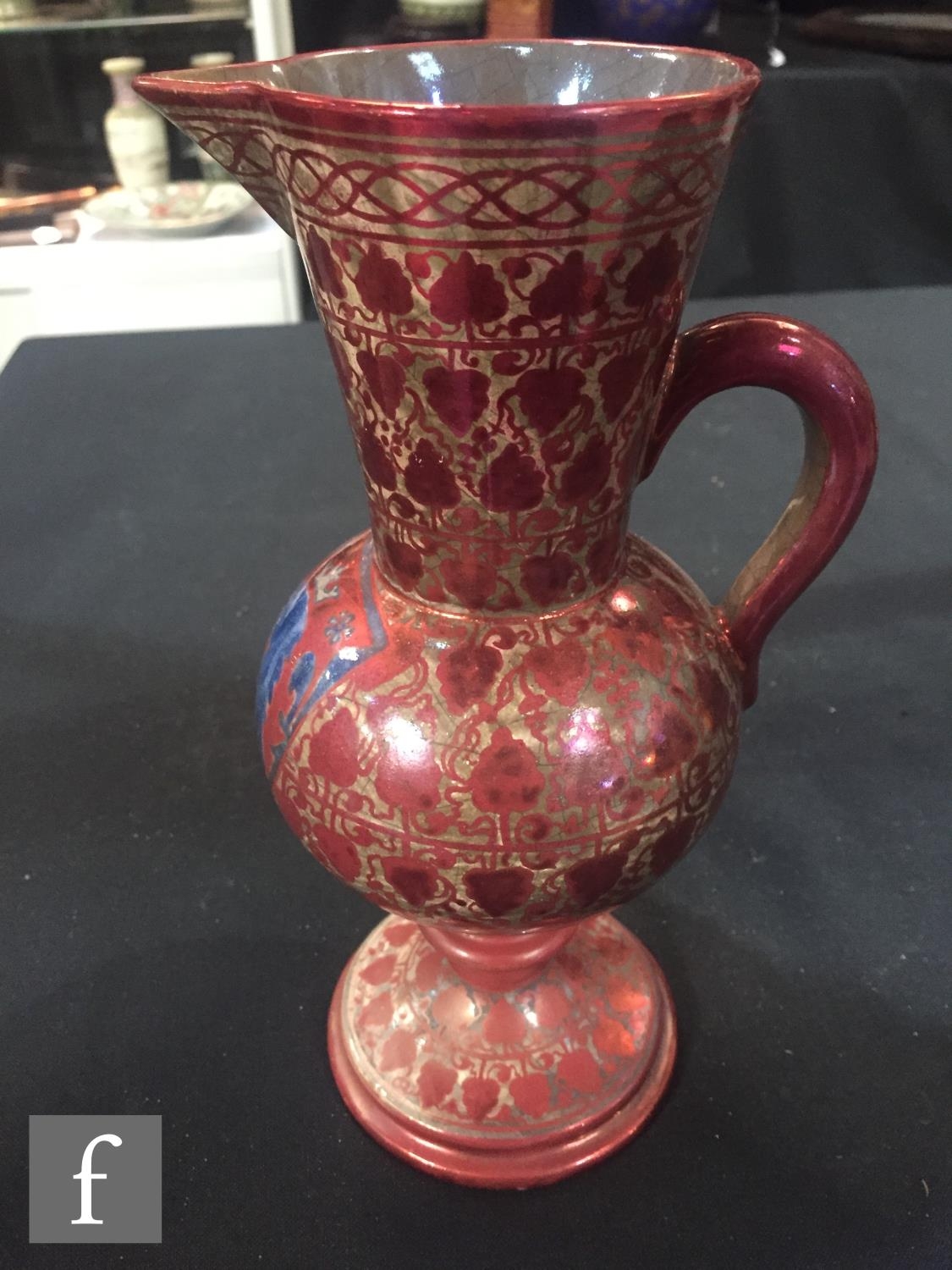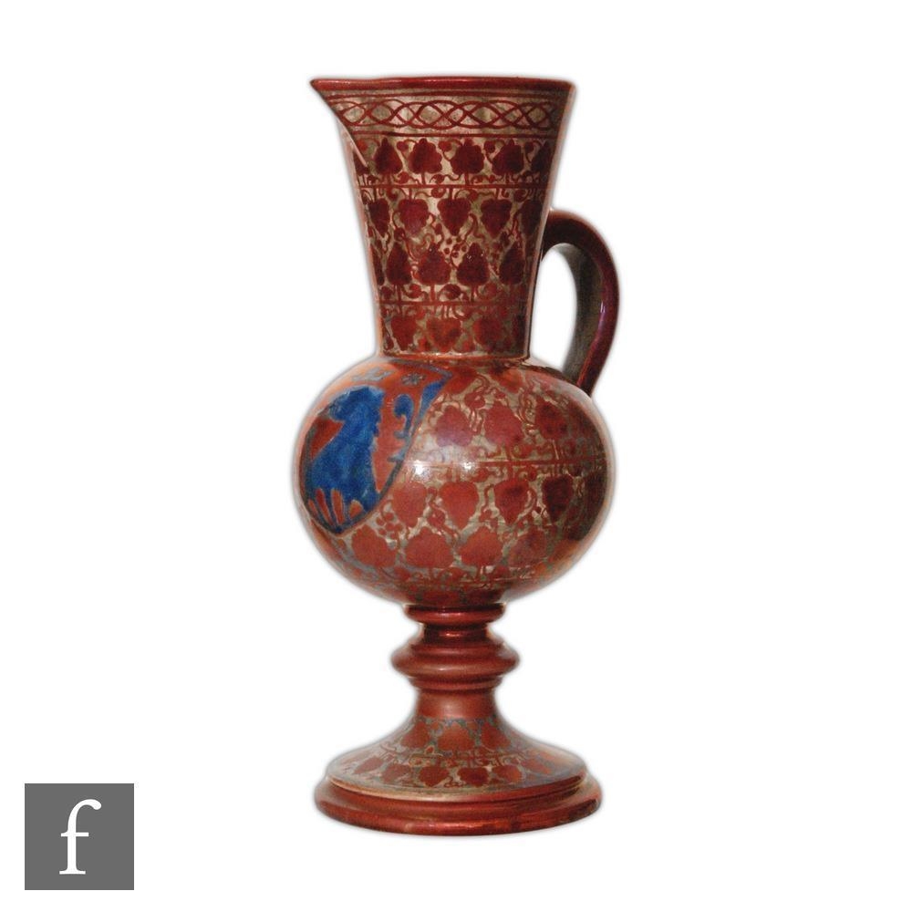 A late 19th Century French ewer decorated in the Hispano-Moresque style by Emile Balon, with painted lustre vine decoration with a central shield with a blue glaze rampant lion, painted mark, height 23cm.