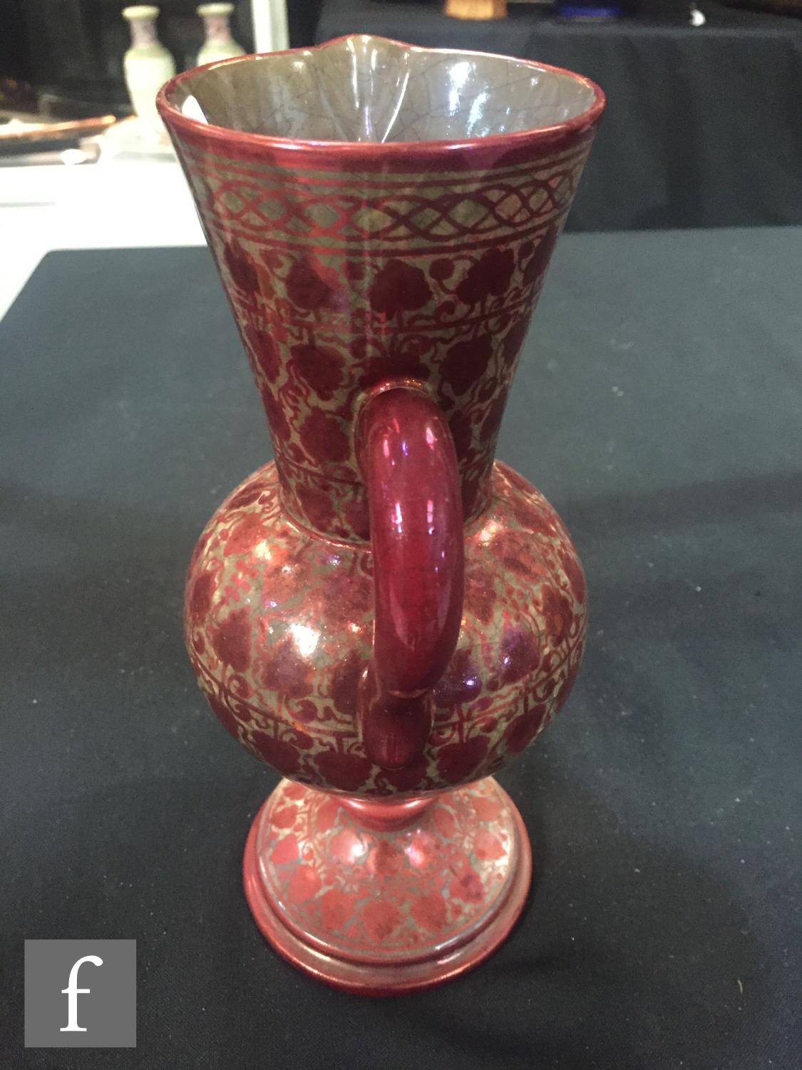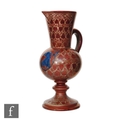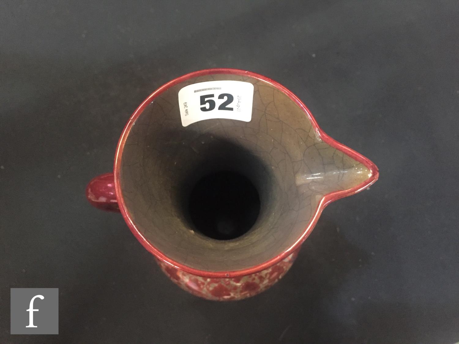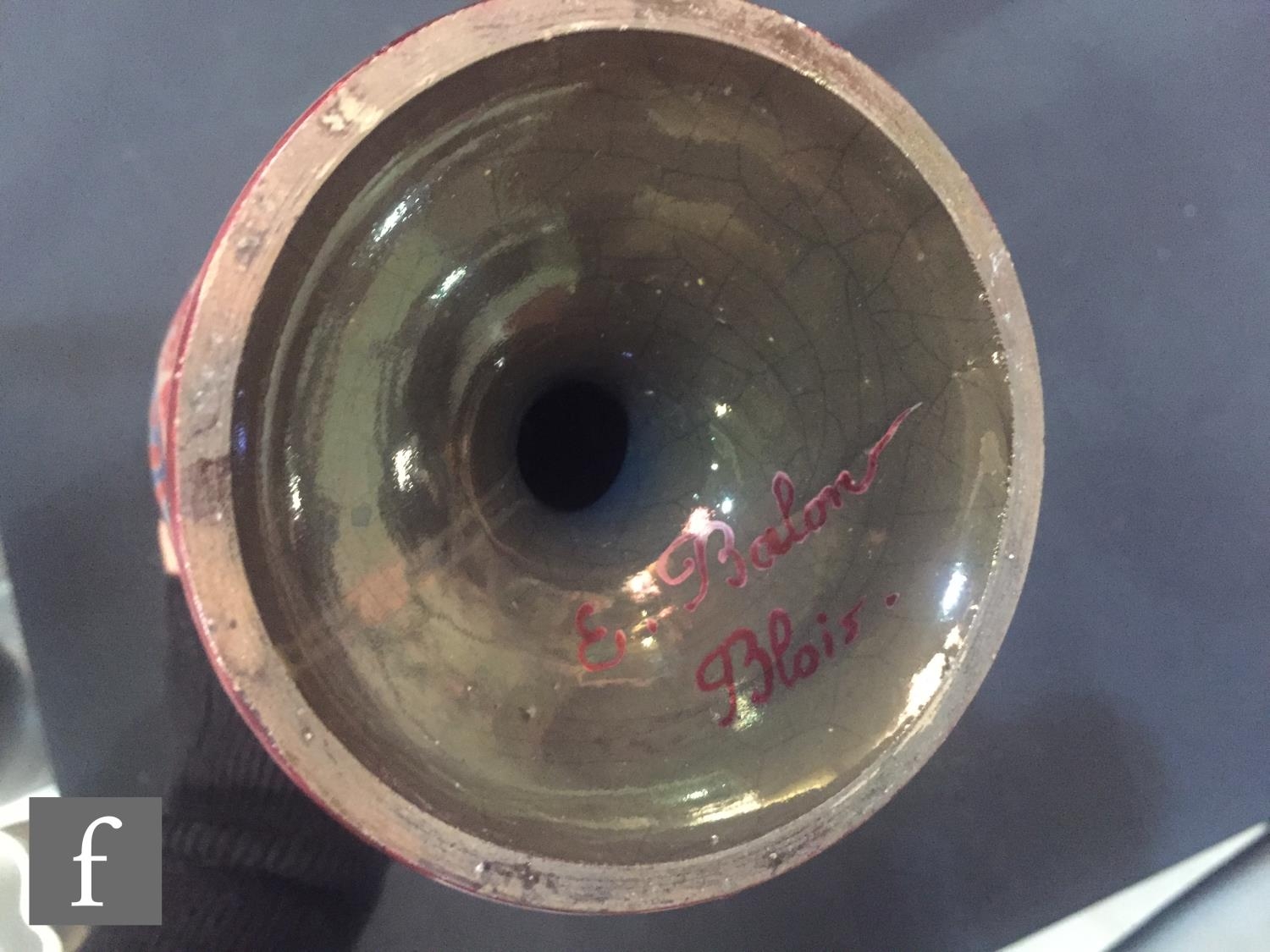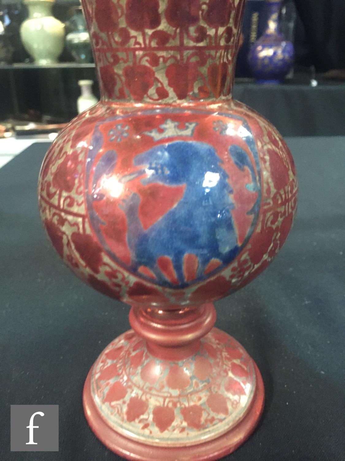 A late 19th Century French ewer decorated in the Hispano-Moresque style by Emile Balon, with painted lustre vine decoration with a central shield with a blue glaze rampant lion, painted mark, height 23cm.