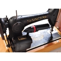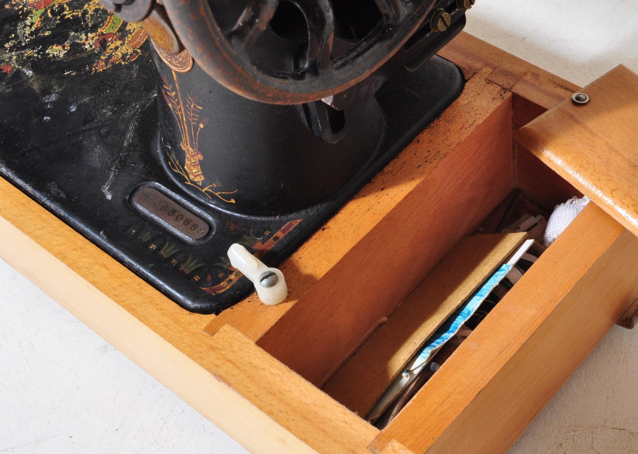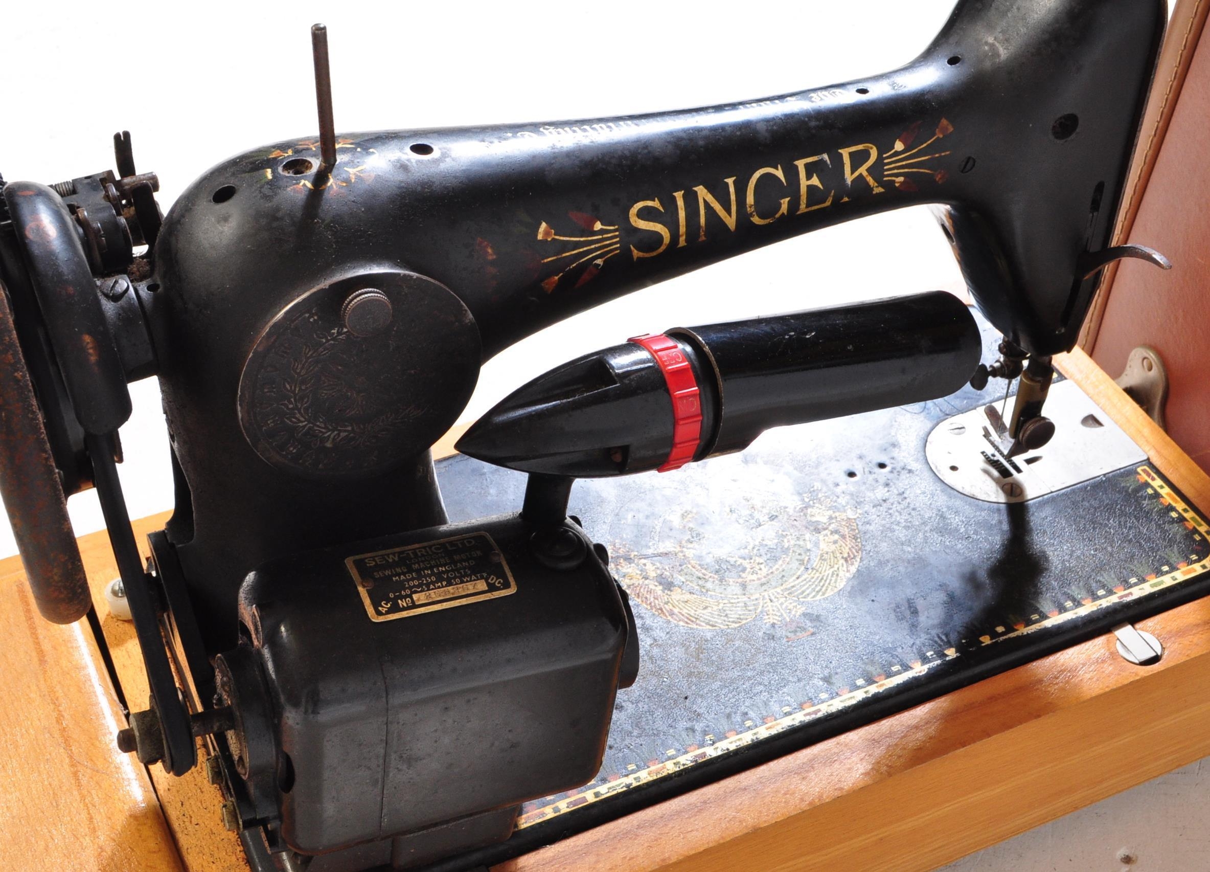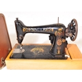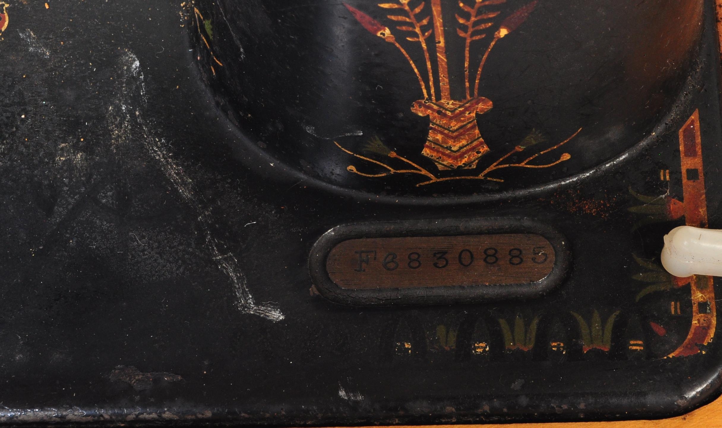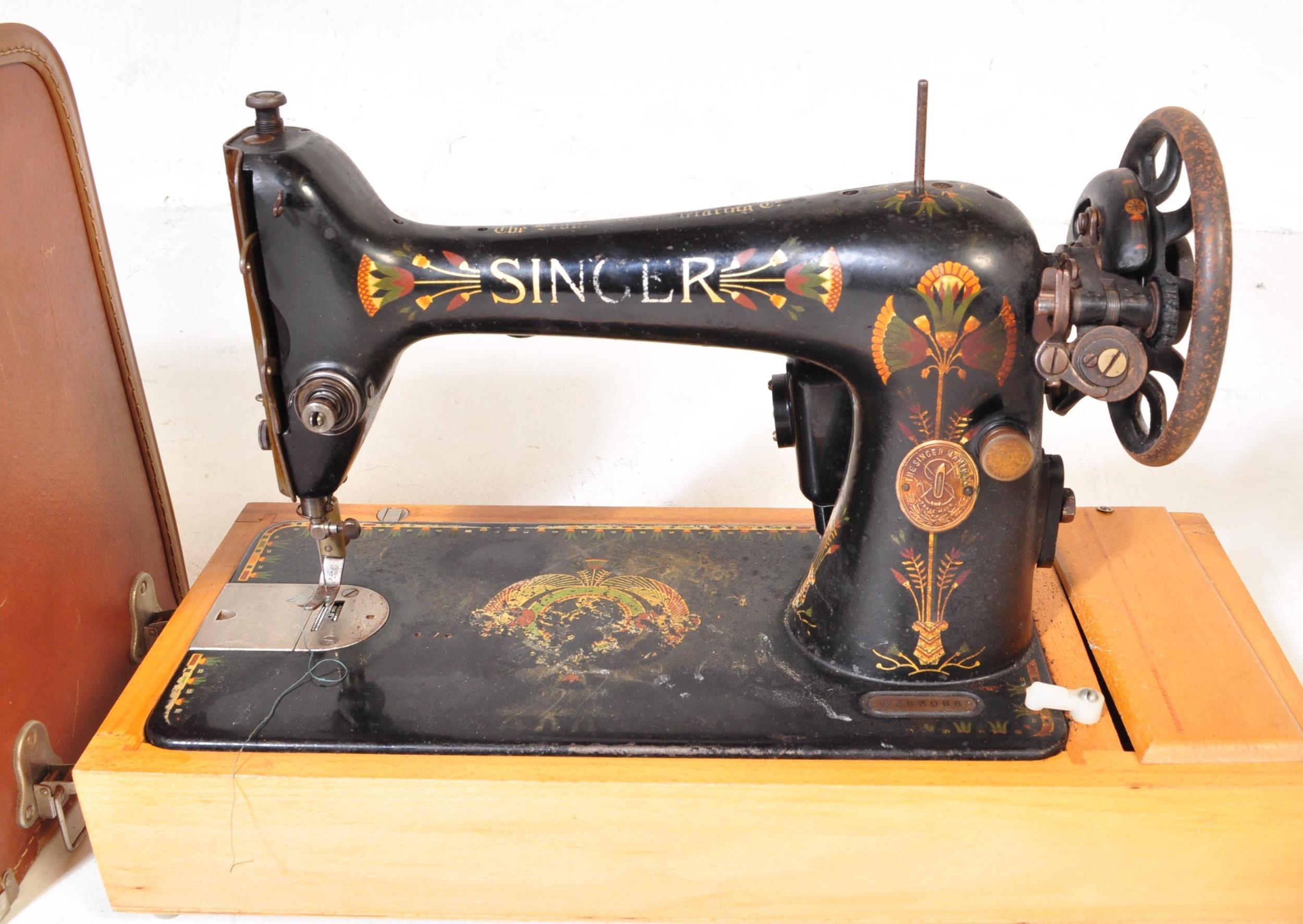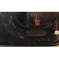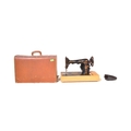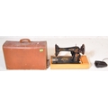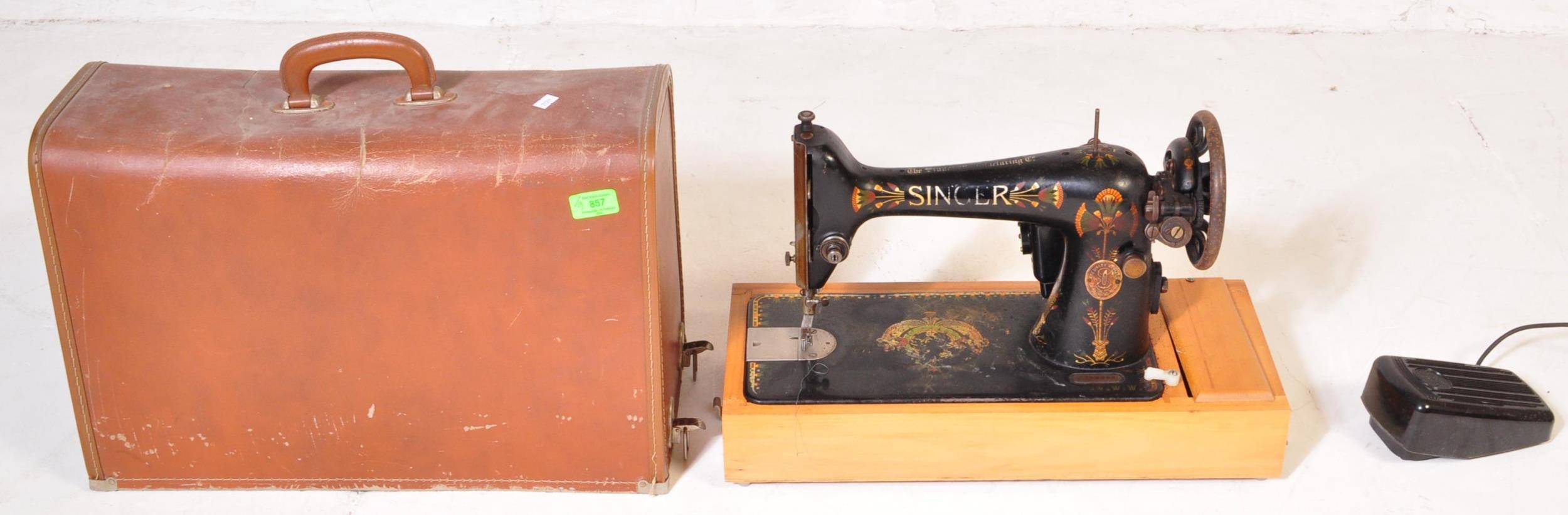Singer sewing machine - A vintage 20th Century circa 1920s sewing converted sewing machine. Having a ebonised frame with floral decoration with leather carry case with handle. Measures approx.