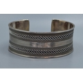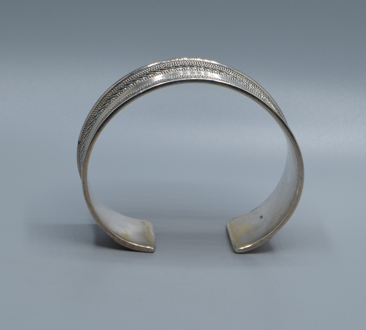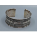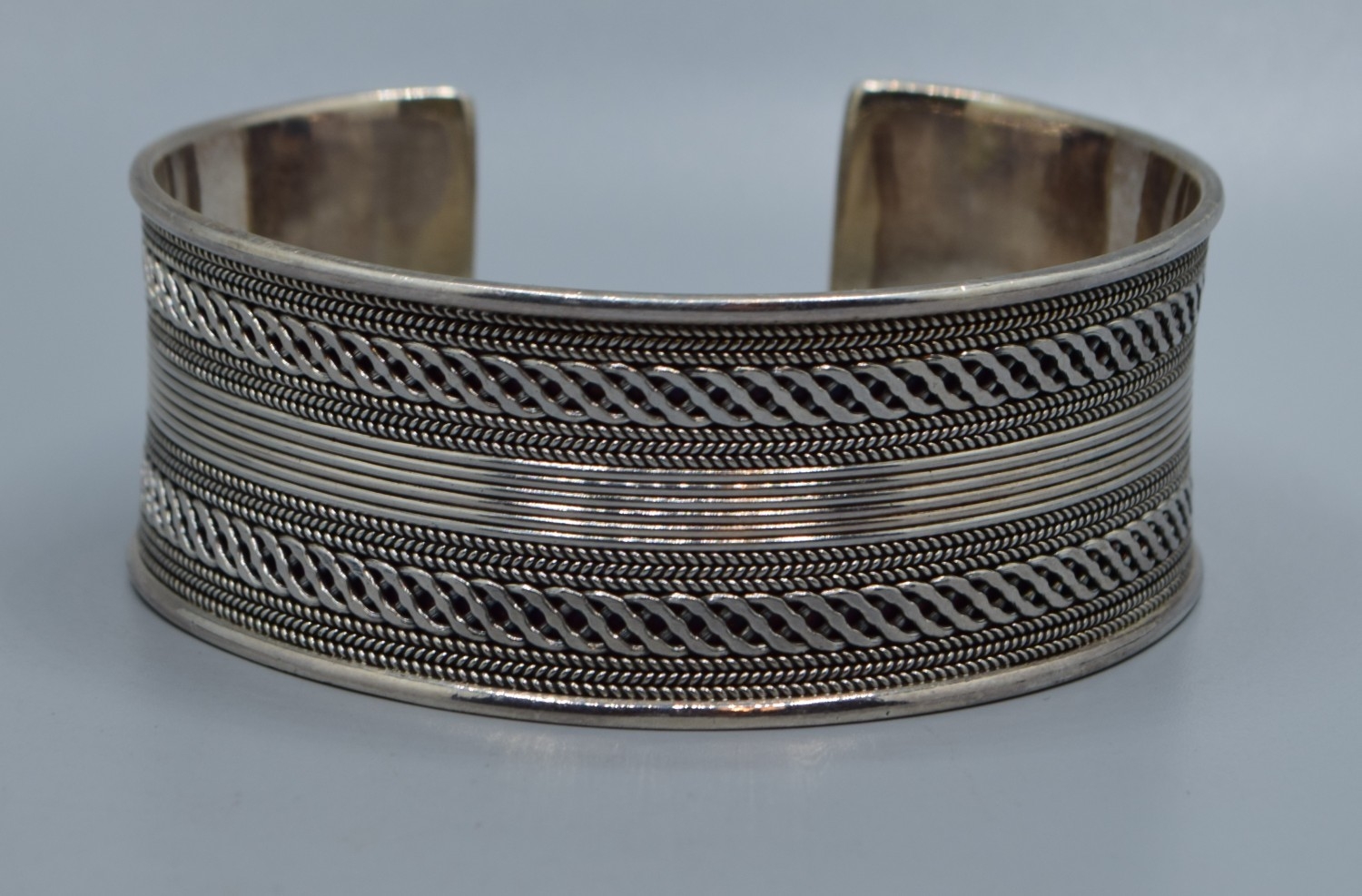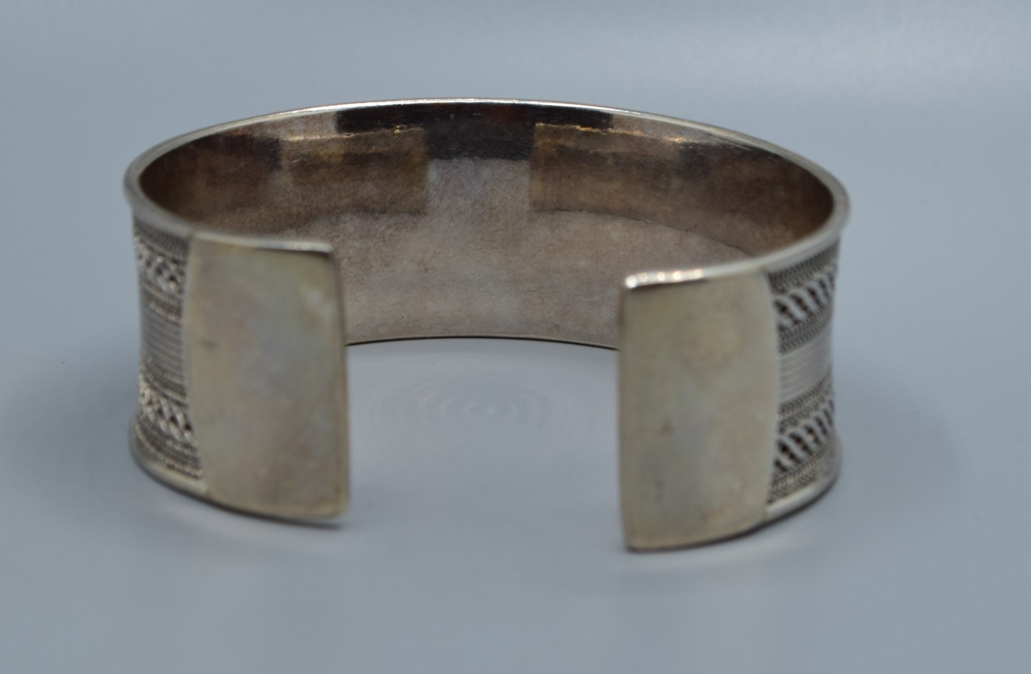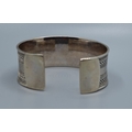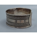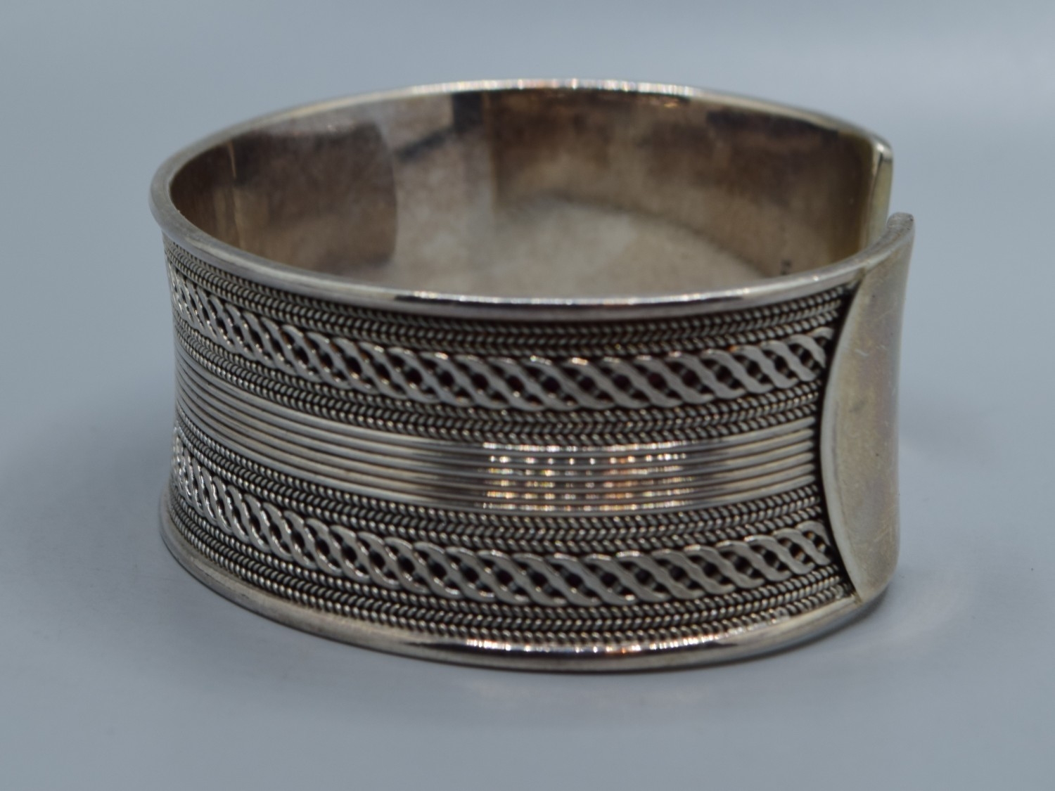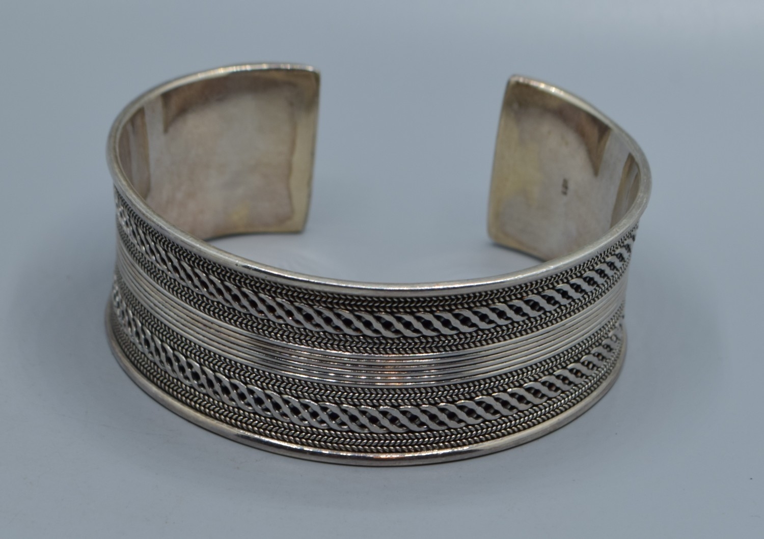 Good solid 925 silver ladies bangle with centre decoration and clear ends 6cm internal diameter, 2.5cm tall 44grams