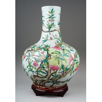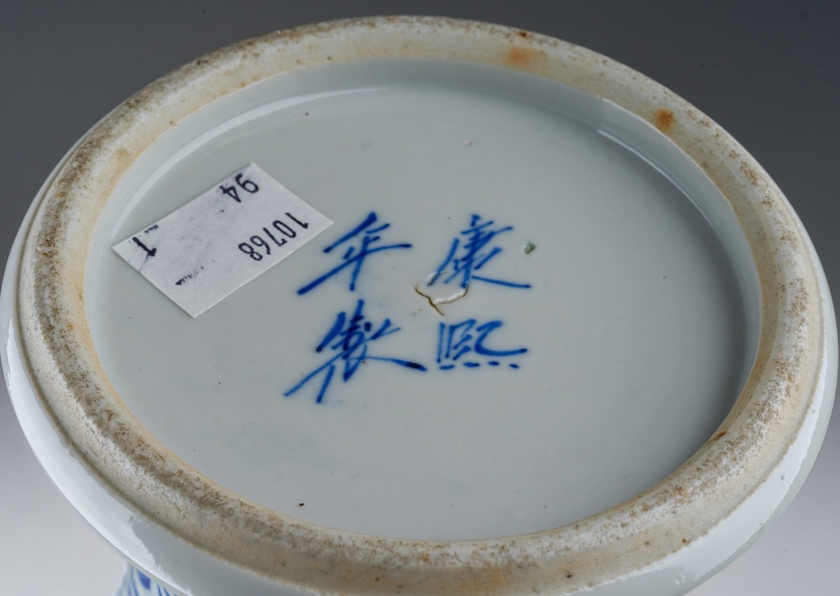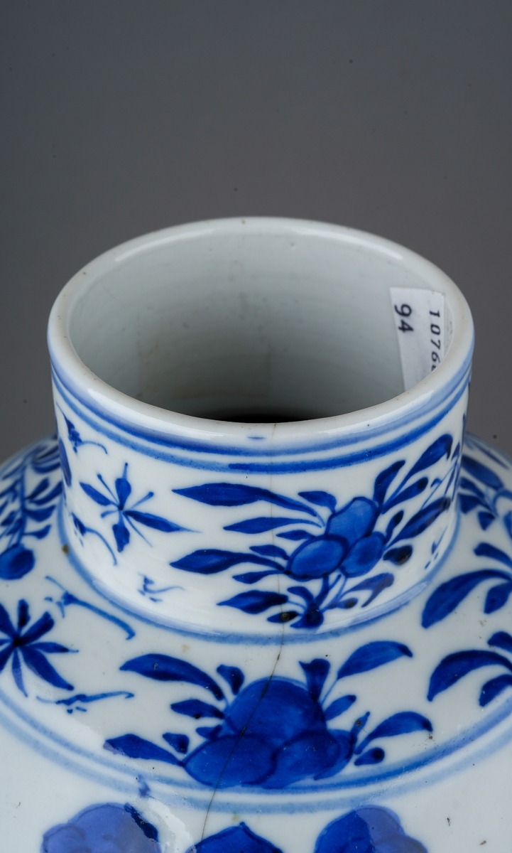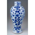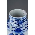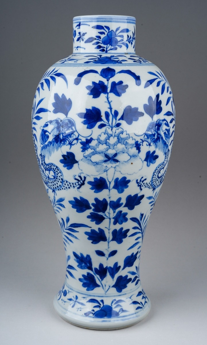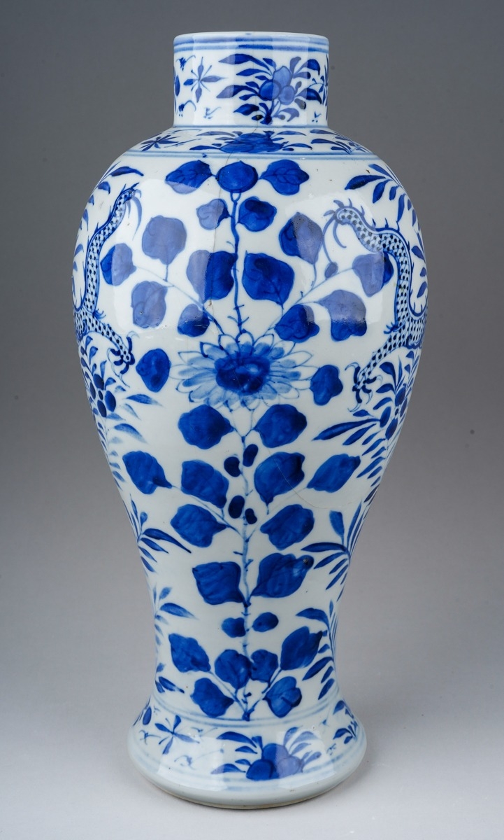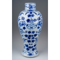 A 19th century Chinese blue and white baluster vase decorated with two four clawed dragons amongst flowers and foliage, four character mark to underside, a.f., height 31cm