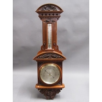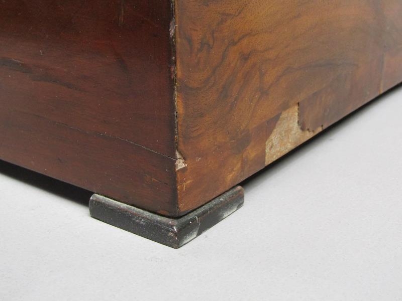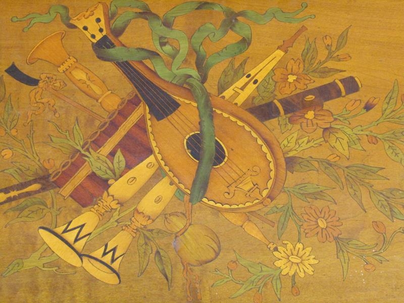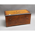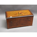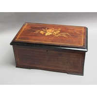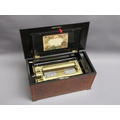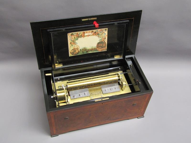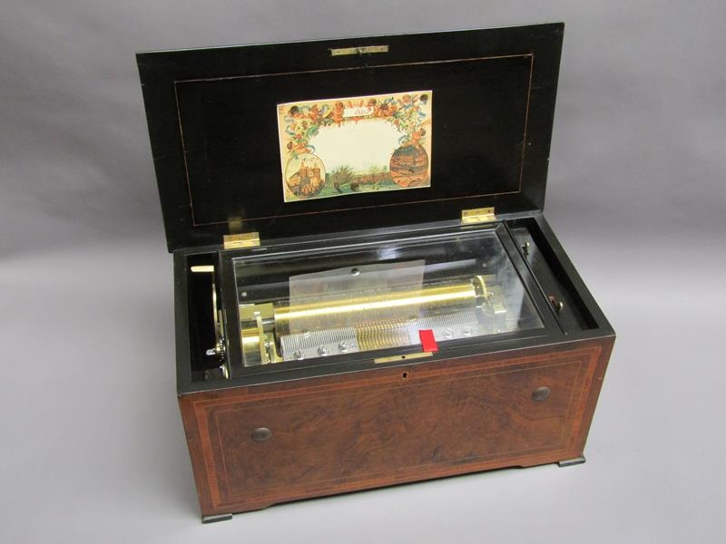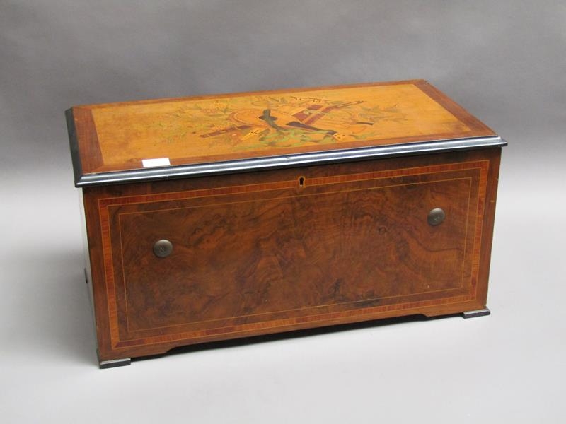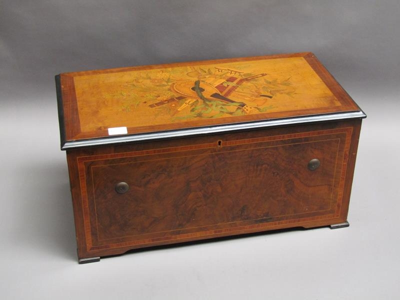 A late 19c Swiss music box having a 27.5cm barrel playing two thirty seven tooth combs plays a fifteen note reed organ mounted between them. The box lid has a replacement tune paper which does not name the tunes played. The box is veneered in walnut with rectangular line inlays to the front and a large inlay of musical instruments and foliage to the lid. The box is 54cm w.
