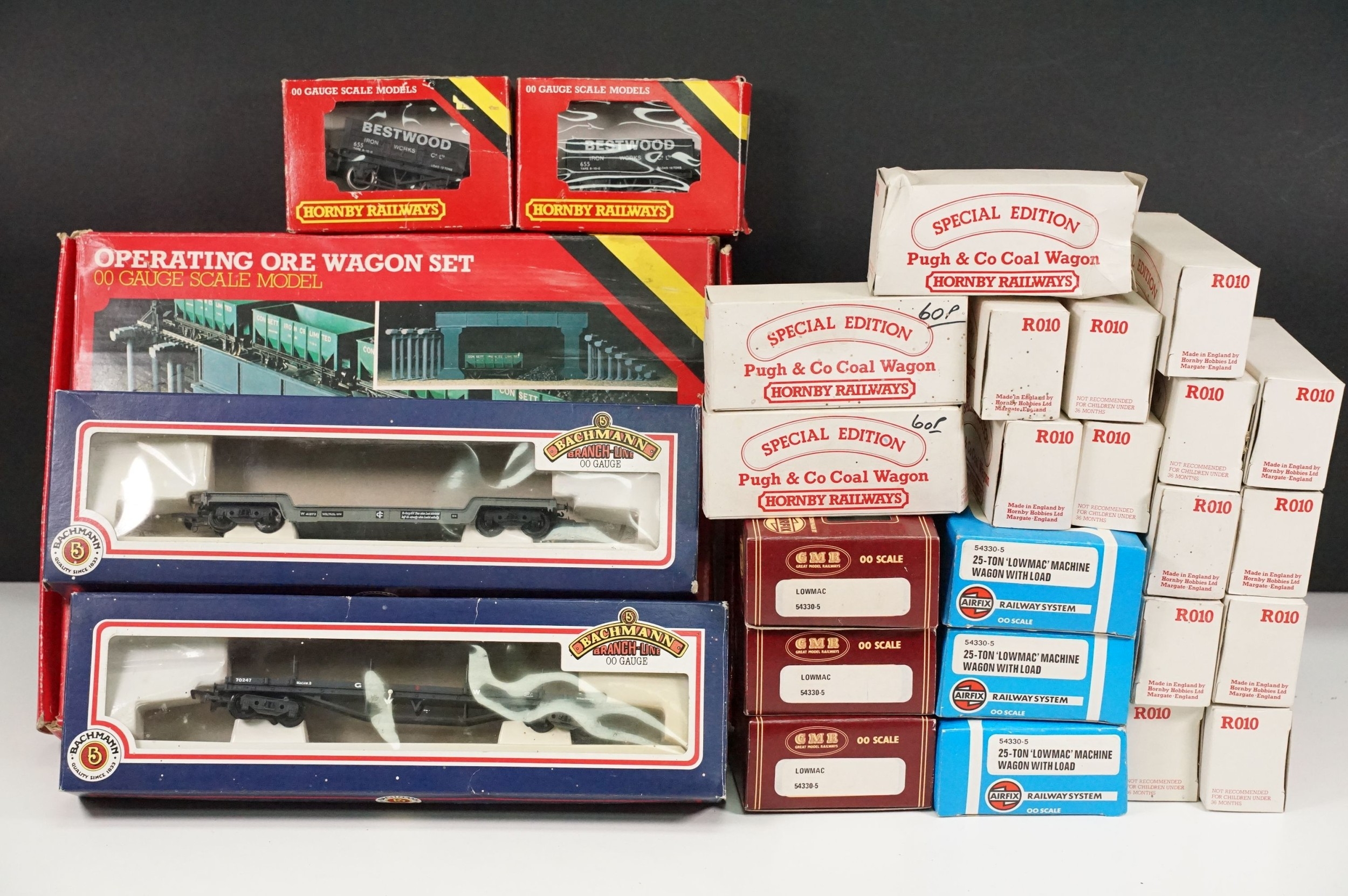 26 Boxed OO gauge items of rolling stock to include 16 x Hornby R010 Special Edition Pugh & Co Coal Wagon, 6 x Airfix, 2 x Hornby and 2 x Bachmann plus a boxed Hornby R415 Operating Ore Wagon Set (27 items)