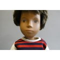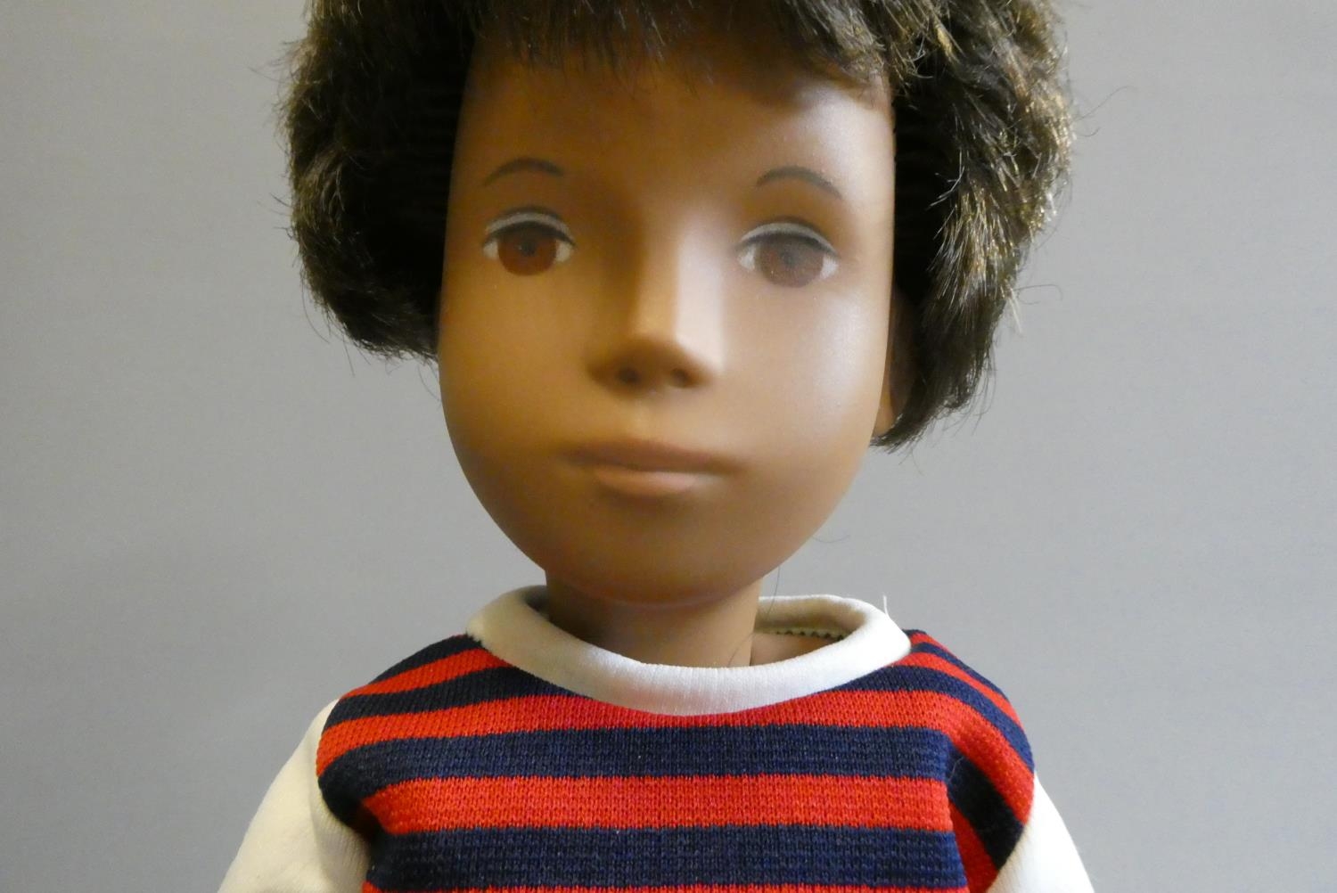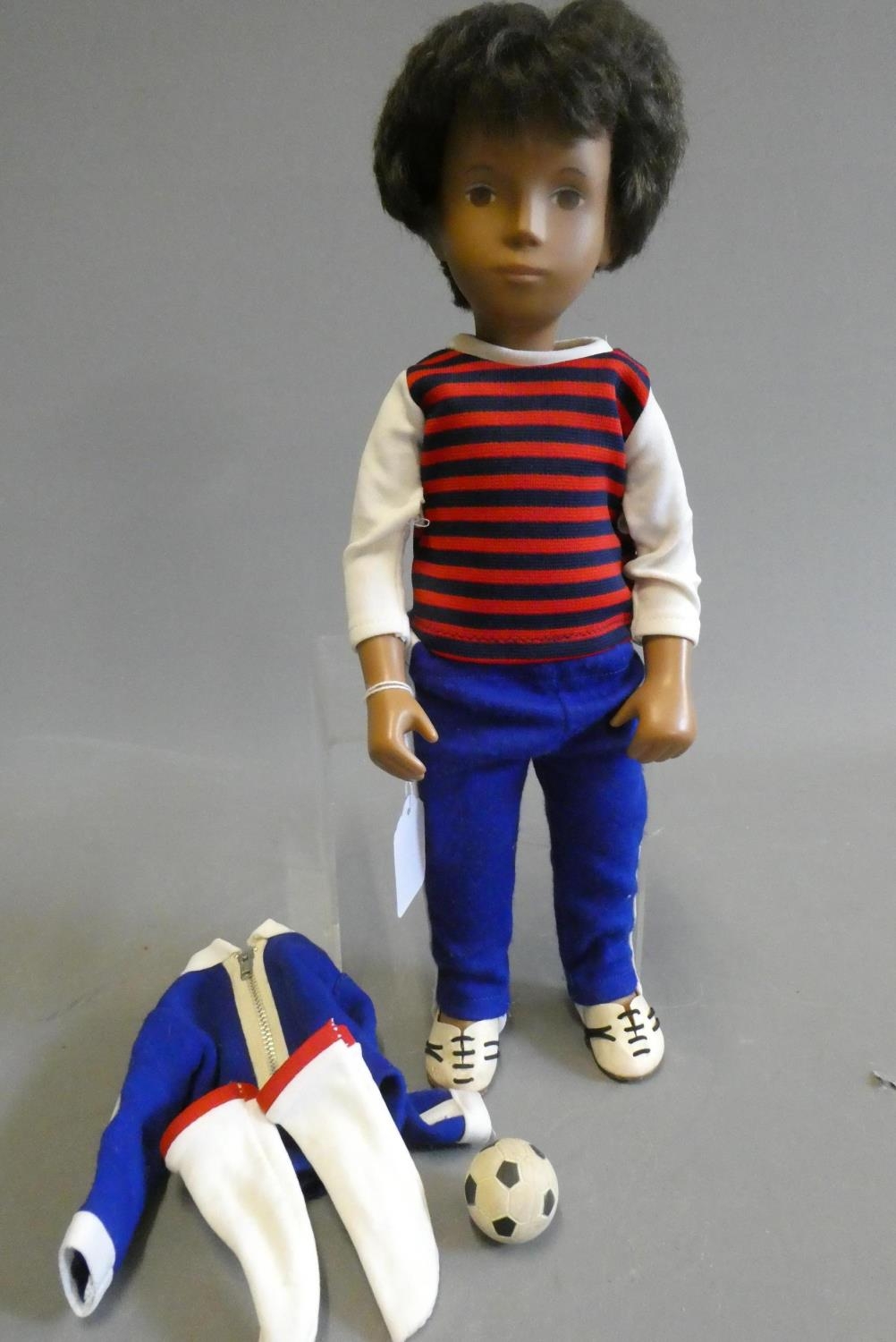 A Sasha boy doll, with brown hair, jointed body and striped top, 16" tall, with spare top, football socks and football