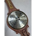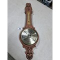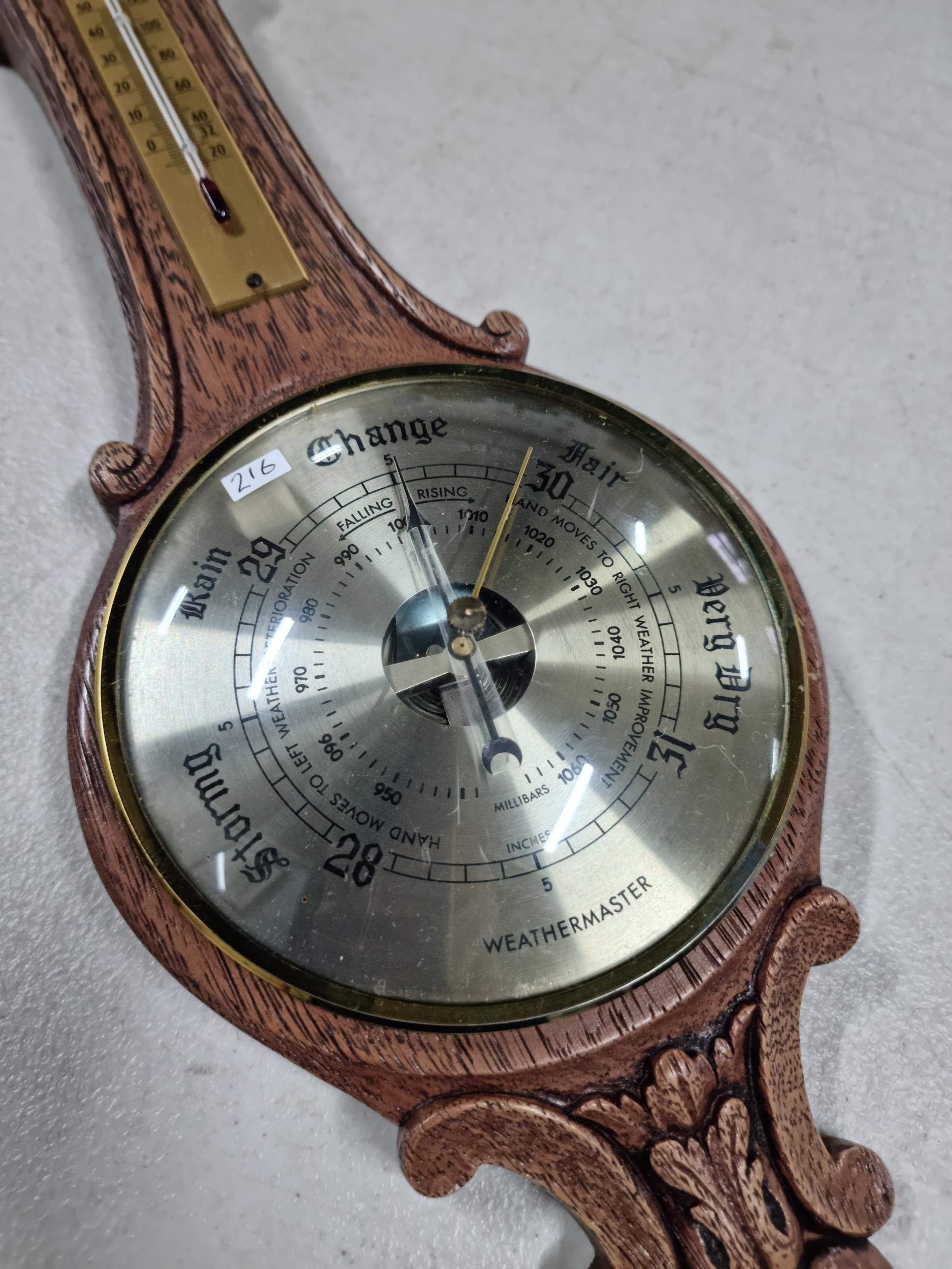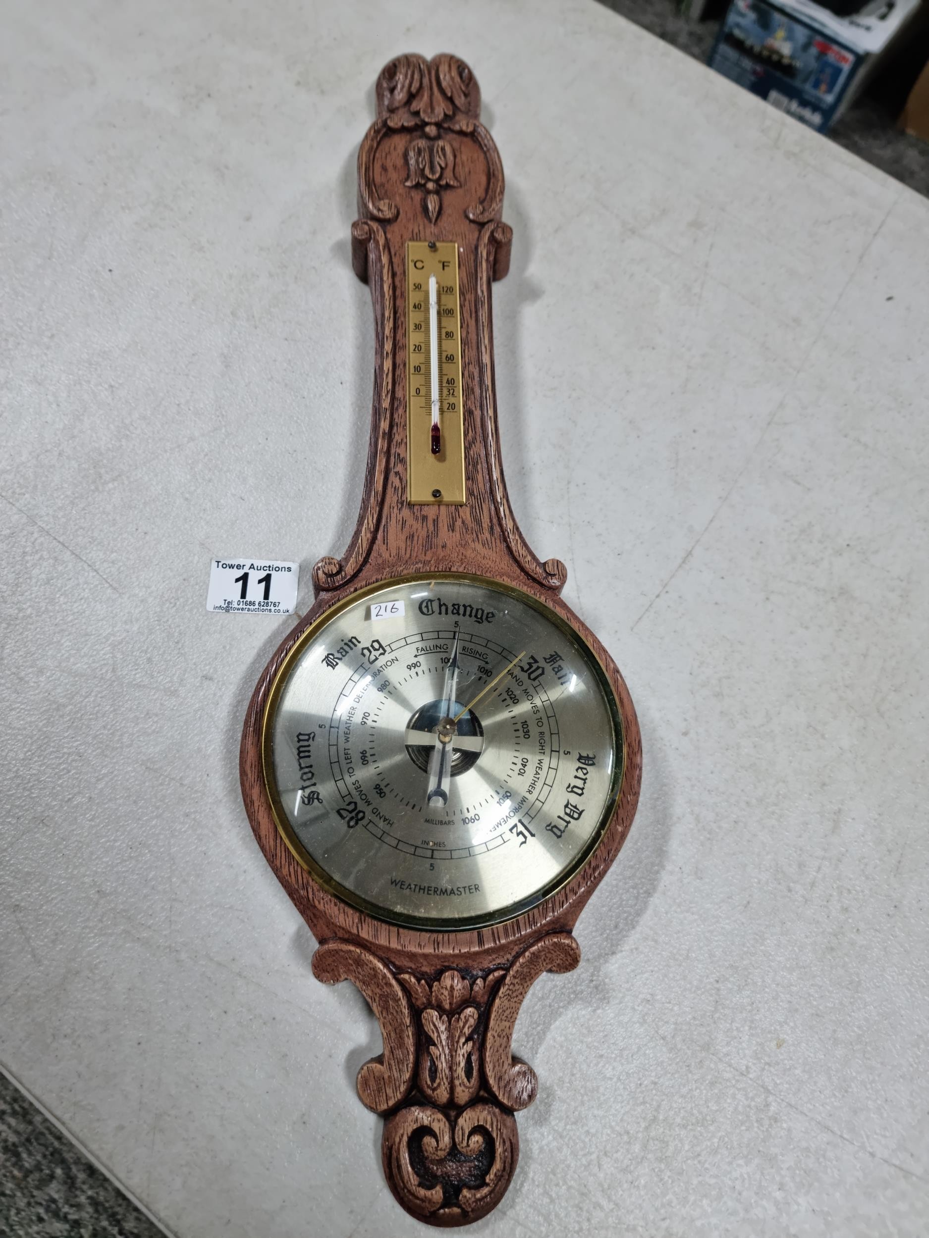 A good quality carved oak barometer by Weathermaster complete with temperature gauge, has a height of 54cm.