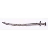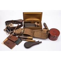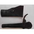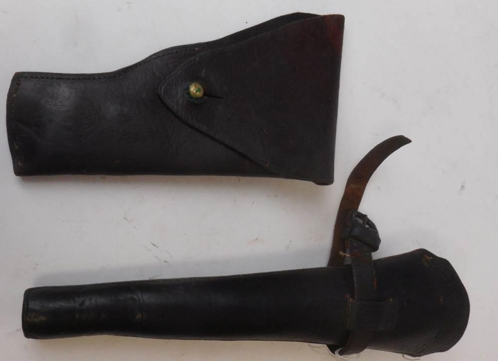 A leather holster: a stitched leather bugle holster and Indian percussion cap carbine.