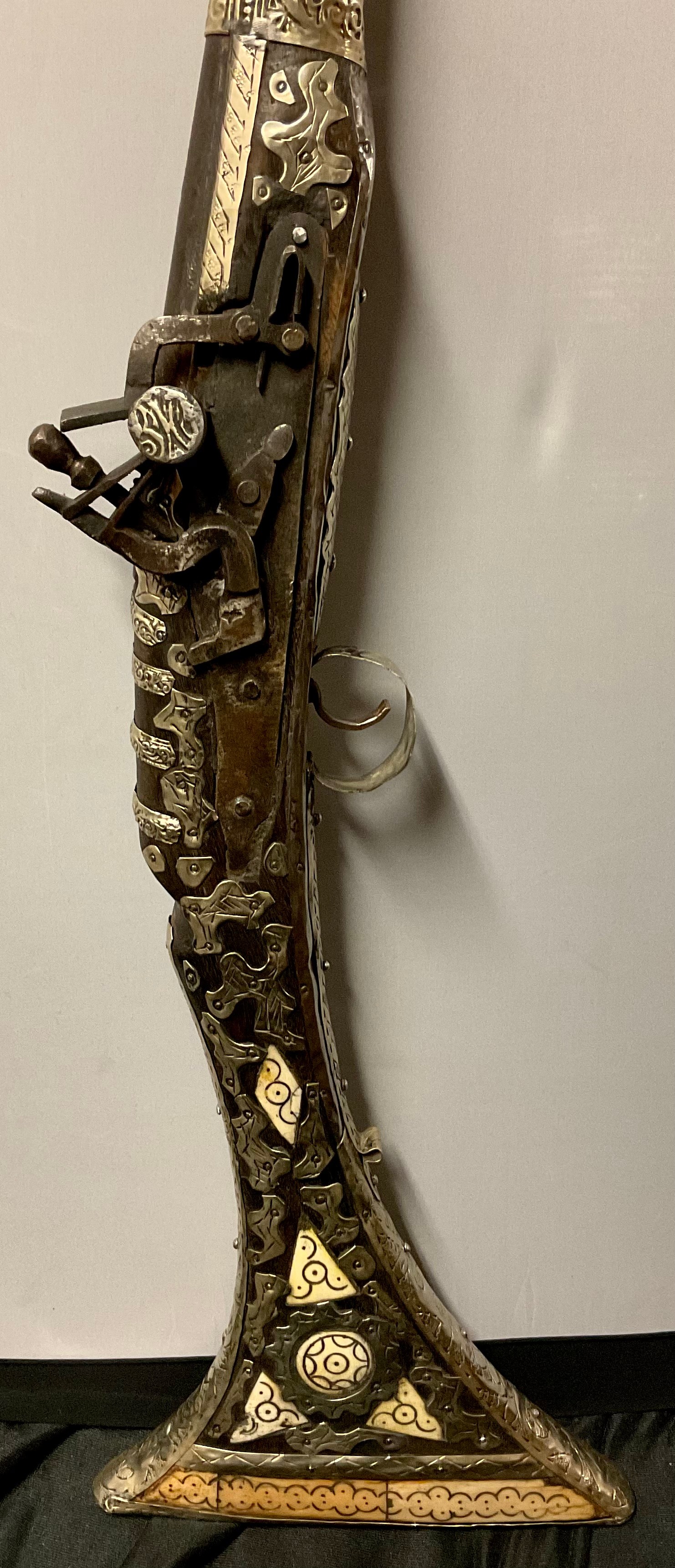 An Afghan flintlock jezail, silver coloured metal and bone mounted, 134cm long
