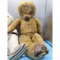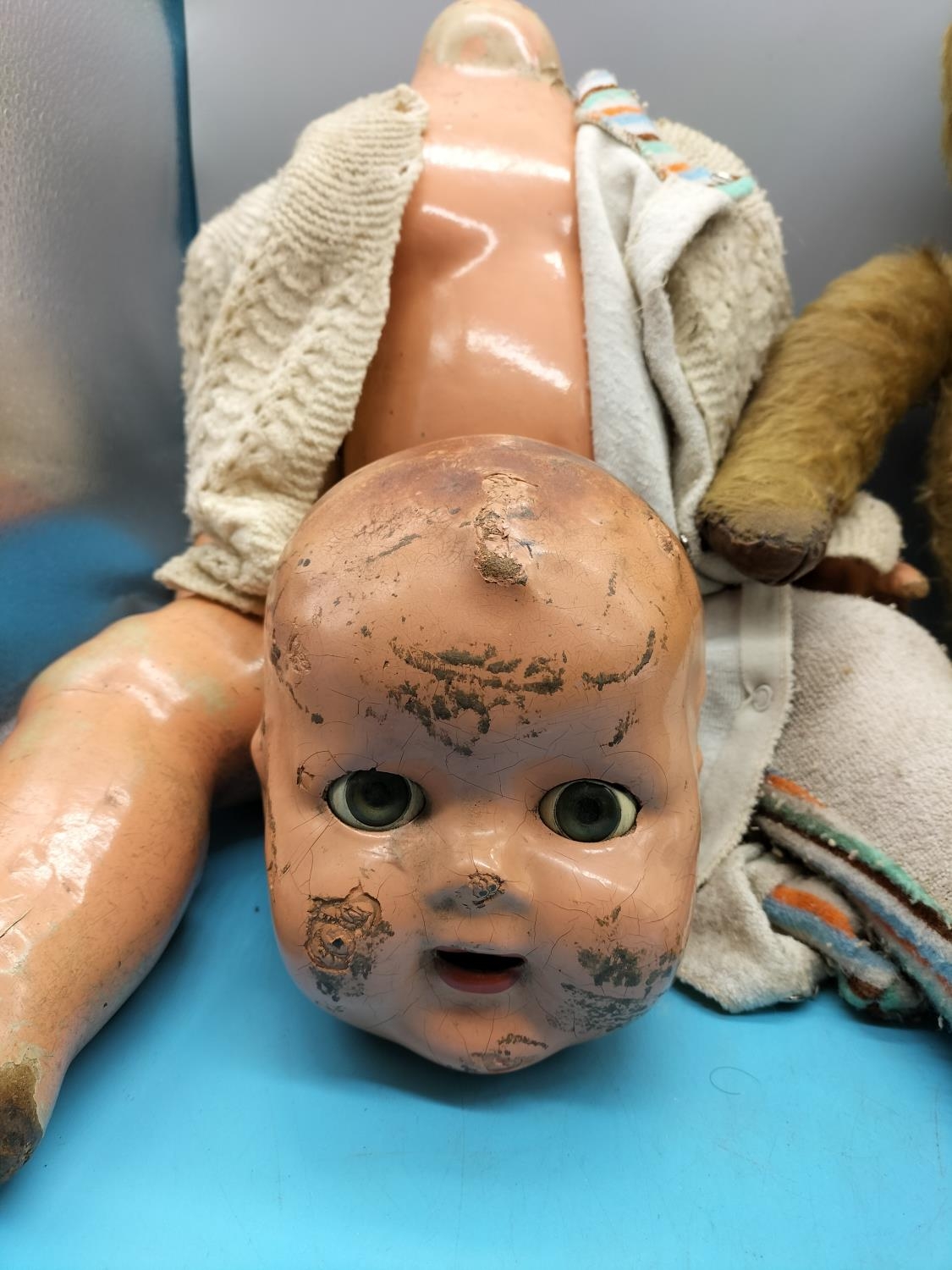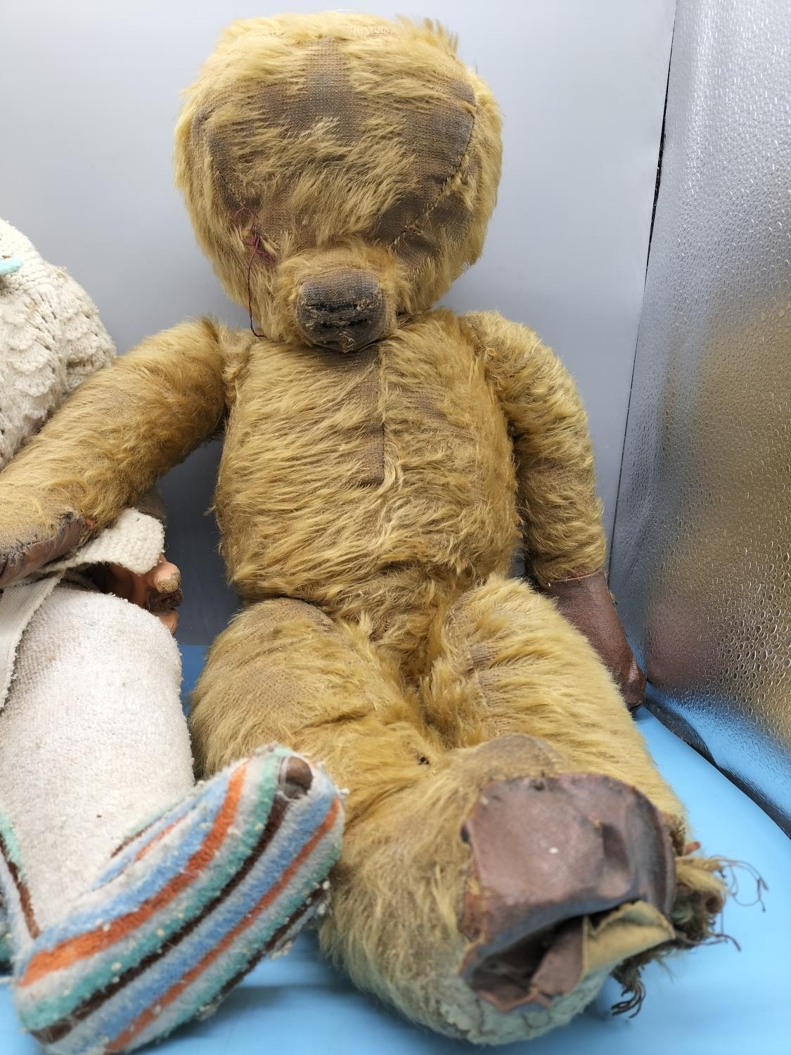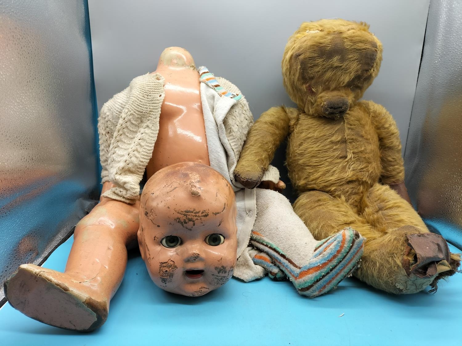 Old Leather Pad Teddy in Need of TLC plus Early Glass Eyed Doll. Also needs Restoration and Re Stringing.
