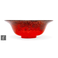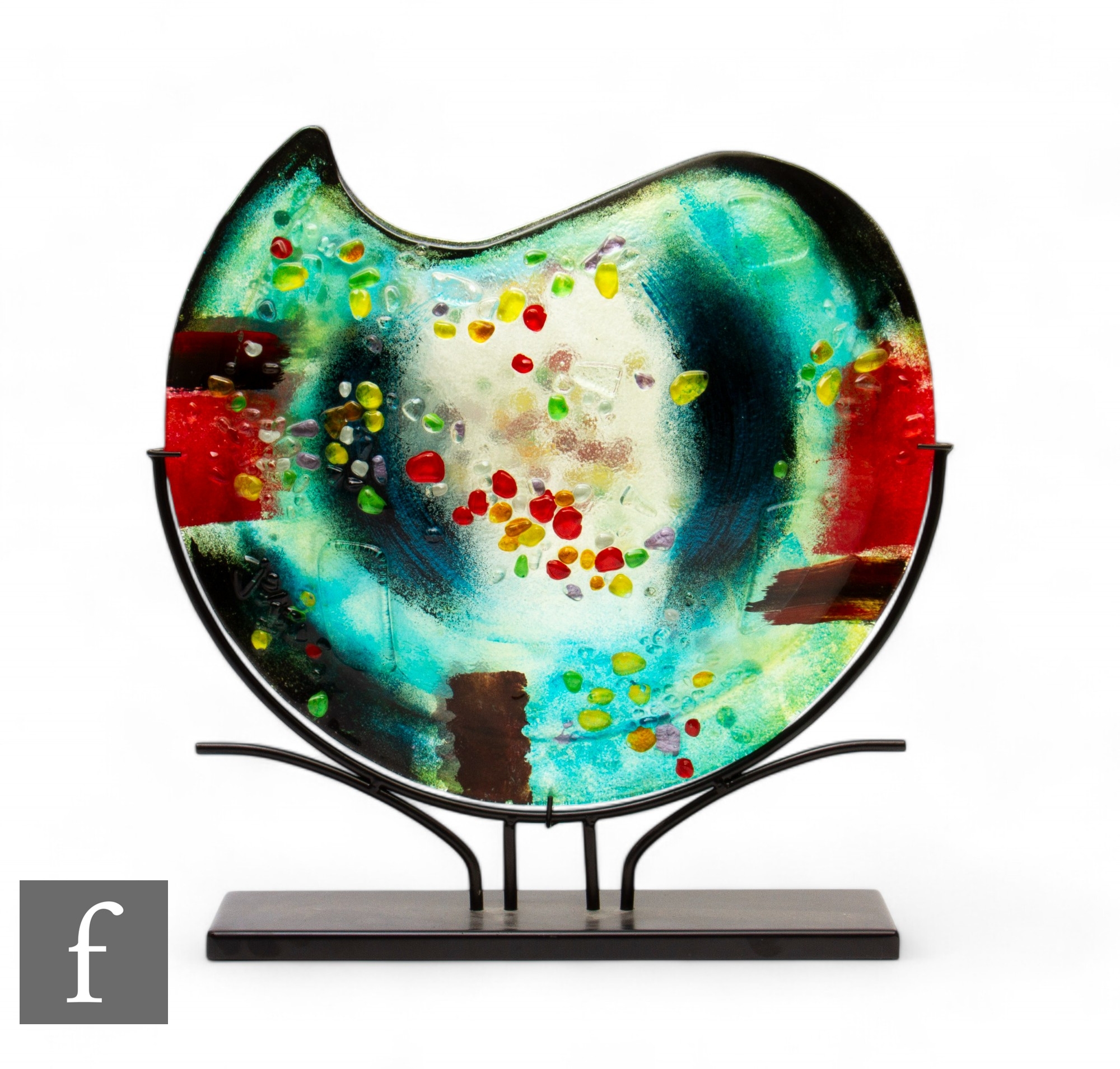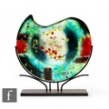 Gilde - A contemporary glass vase of circular form, the slender body decorated with applied glass in polychrome colours against the tonal blue ground with ruby spotting, to a metal mount, height 47.5cm.