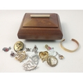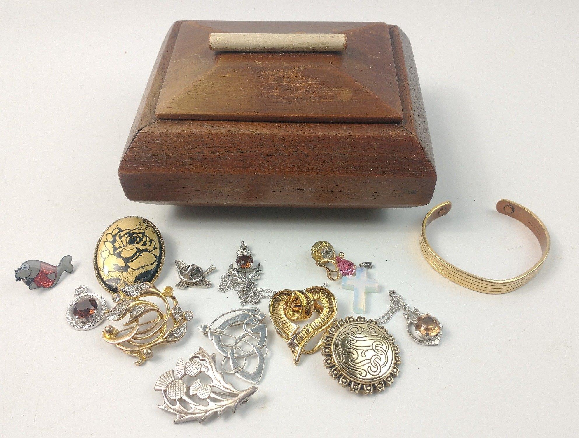 A nice STYLISH wooden 'cask style' jewellery box filled with costume jewellery and a nice SILVER 925 stamped CELTIC brooch etc