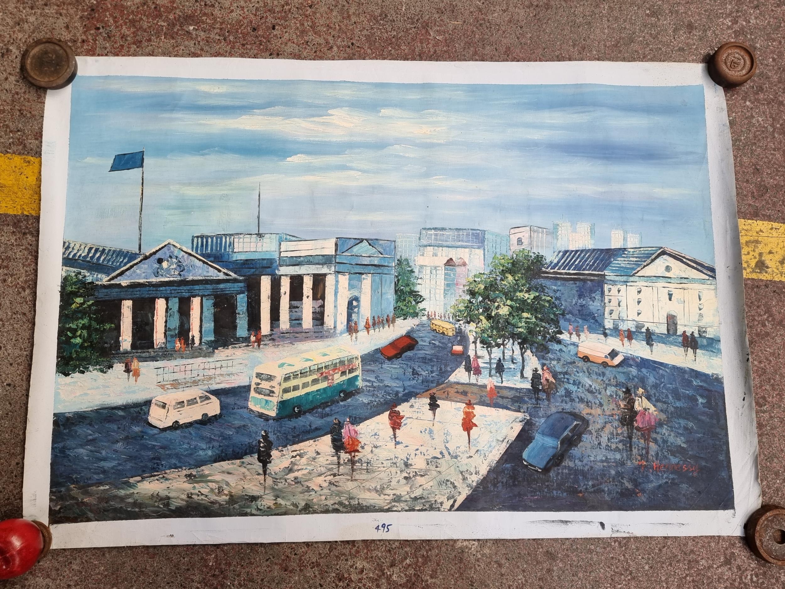 A vintage oil on canvas painting featuring a view of Dublin's College Green, rendered in cool tones with bold linear details. Signed F. Hennessy bottom right.