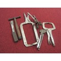 A box of tools including clamps and a panel beaters hammer