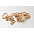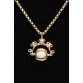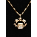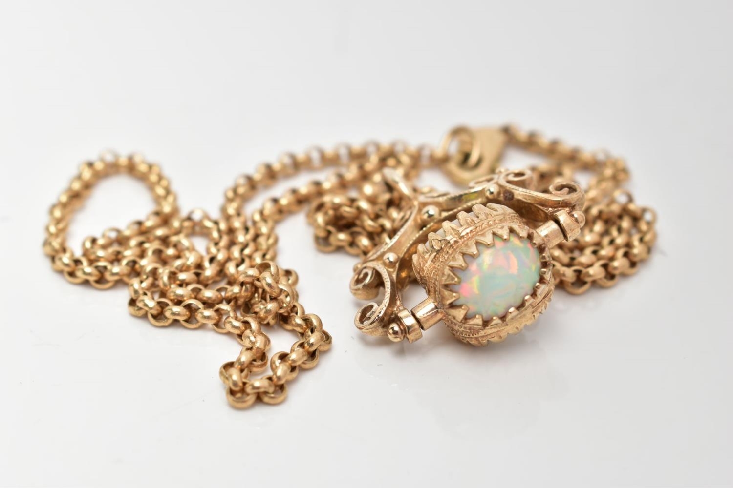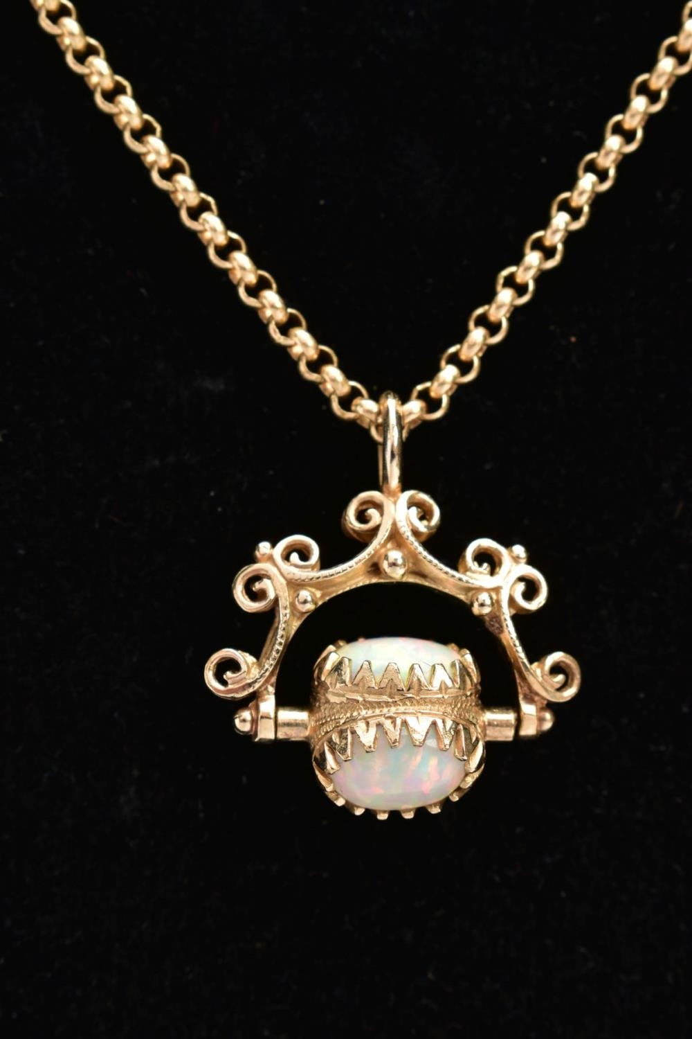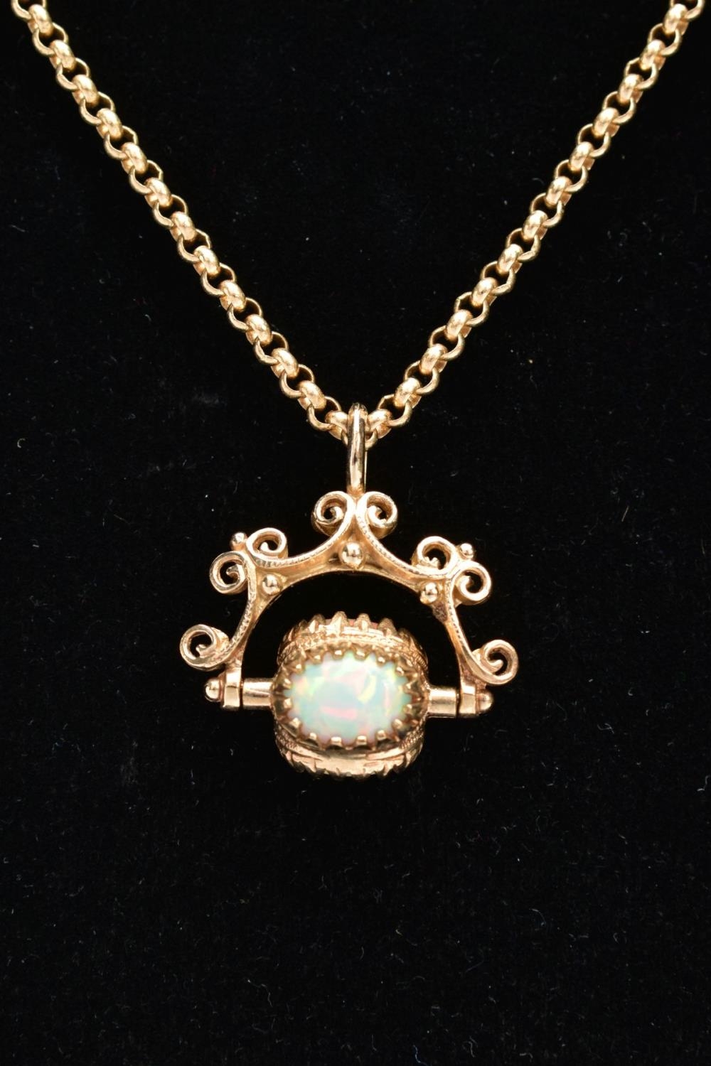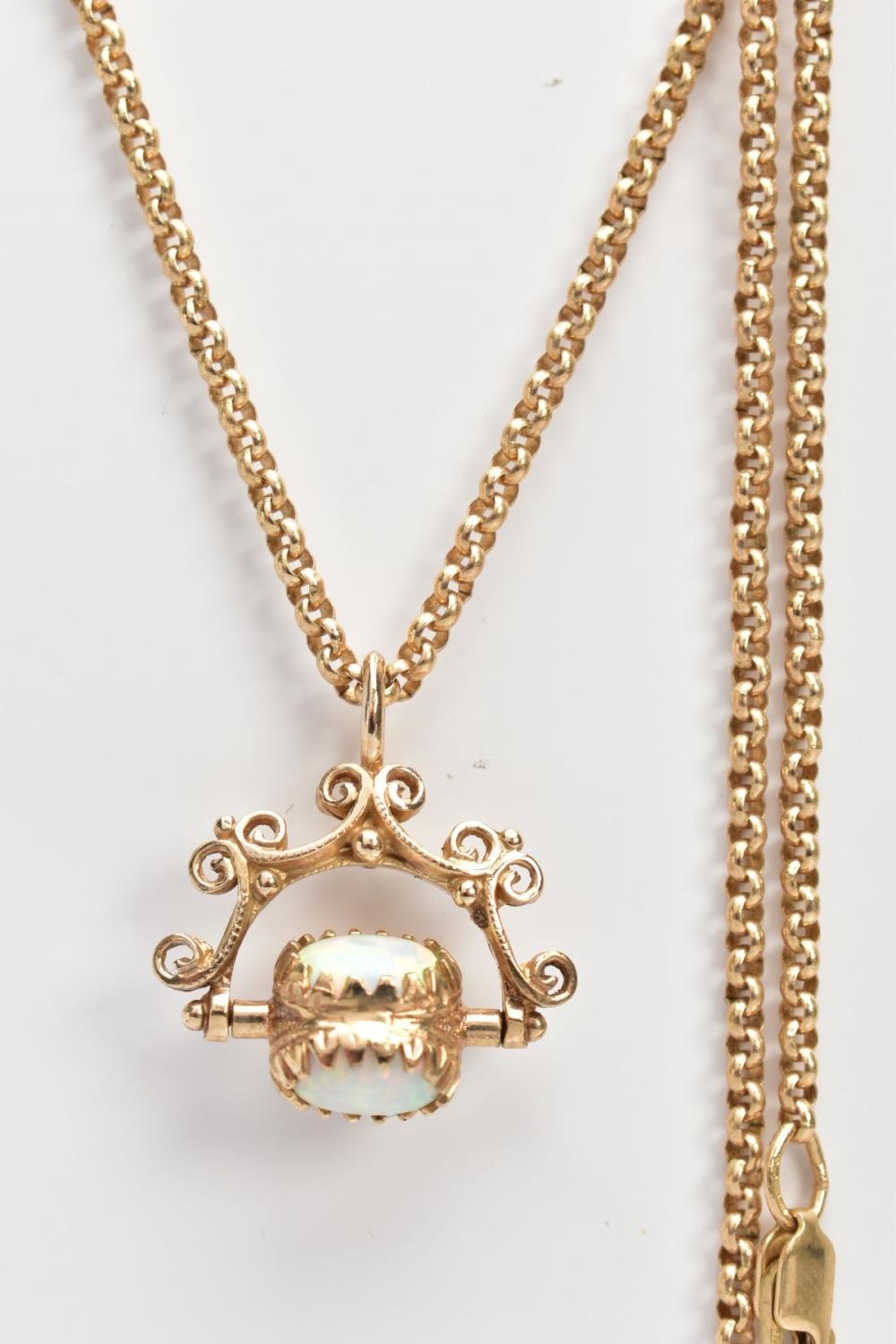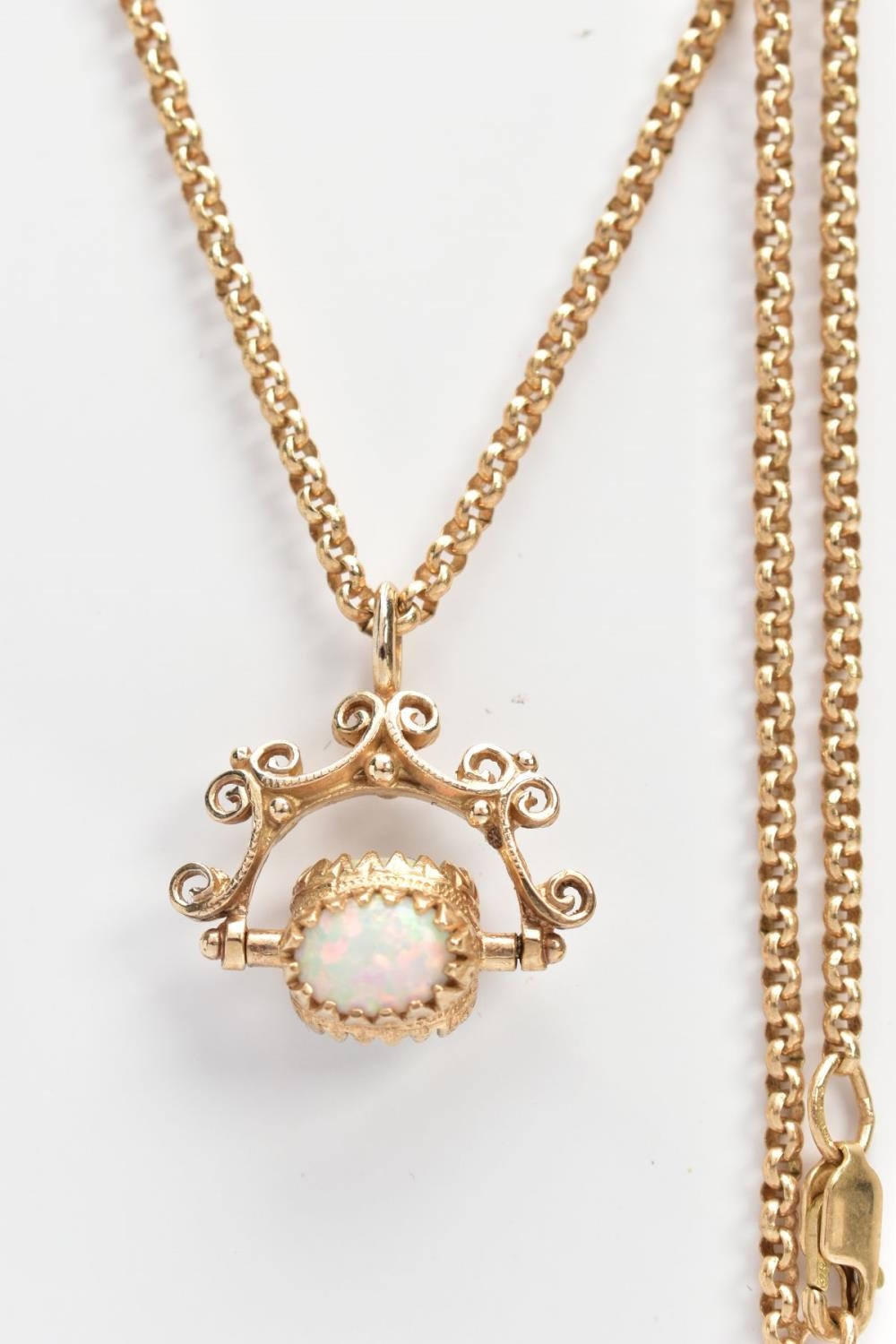 A YELLOW METAL SWIVEL FOB PENDANT AND CHAIN, the swivel fob set with three oval synthetic opal cabochons, fitted within a scroll detailed mount and suspension loop (no hallmarks or stamps), suspended from a fine belcher link chain fitted with a lobster claw clasp, hallmarked 9ct gold Sheffield, length 500mm, approximate gross weight 11.8 grams, together with a fitted box (condition report: general light wear, swivel fob in working condition, clasp in working condition, overall condition very good)