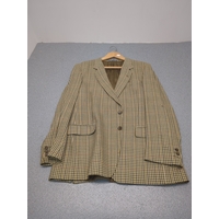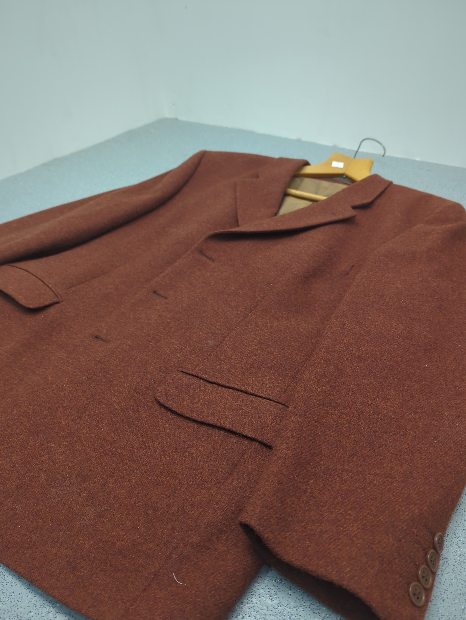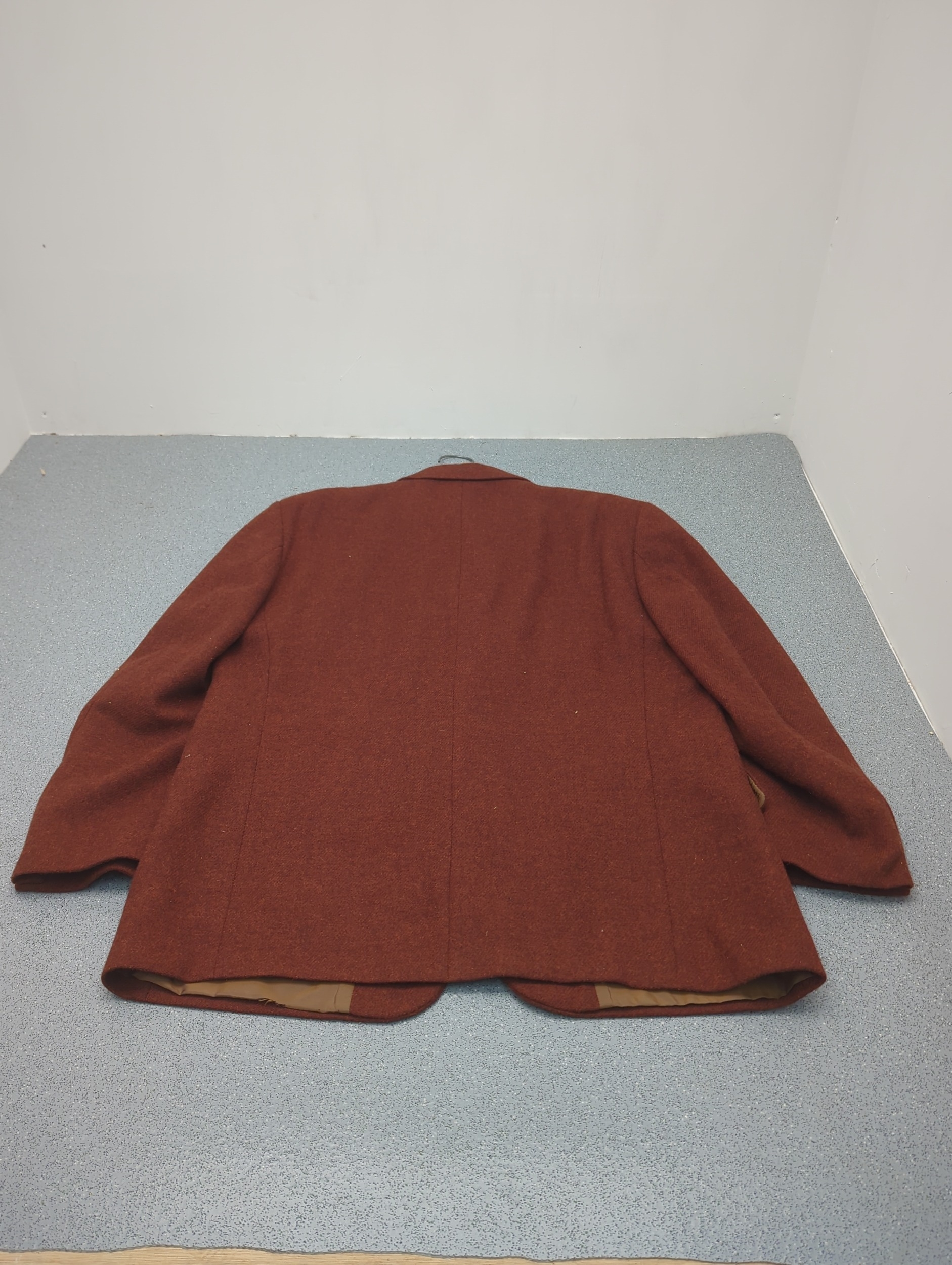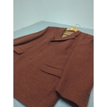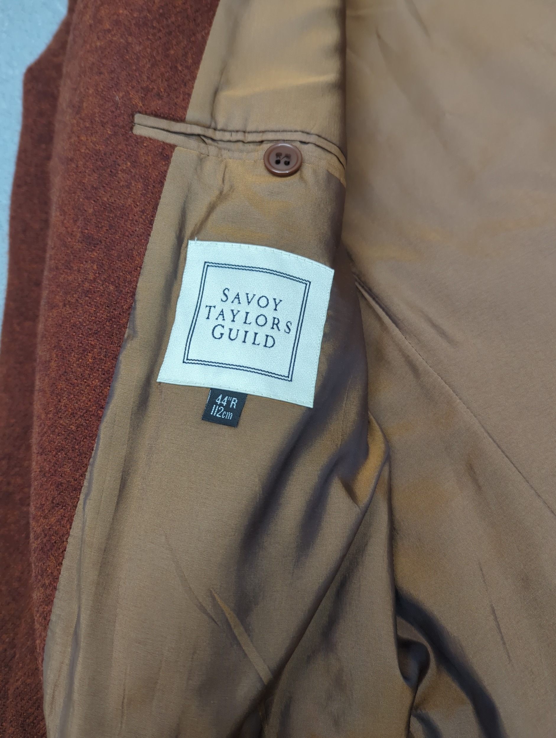 A classic brown blazer from Savoy Taylors Guild, featuring a two-button design and double vents at the back. The lining appears smooth and has an interior pocket buttoned for convenience. The size is marked as 44R, which typically fits a chest size of 112cm.