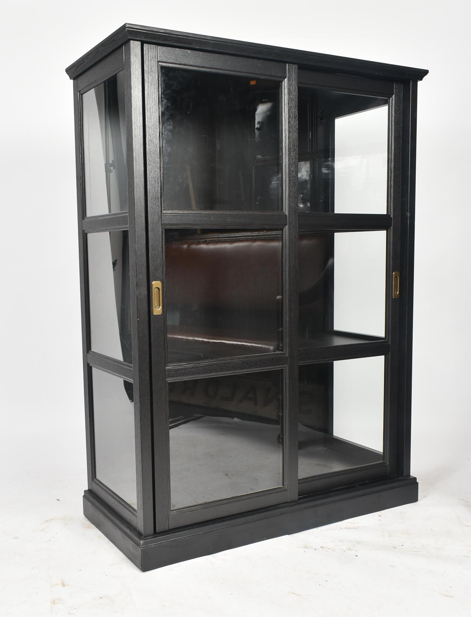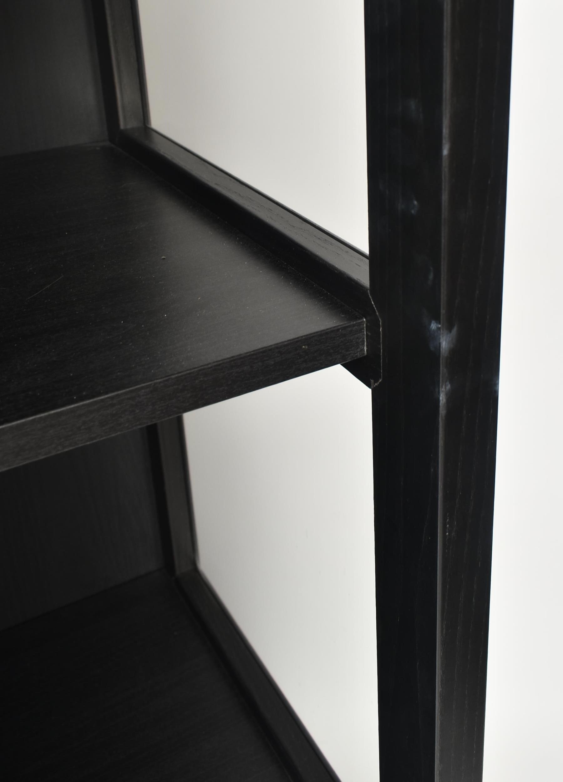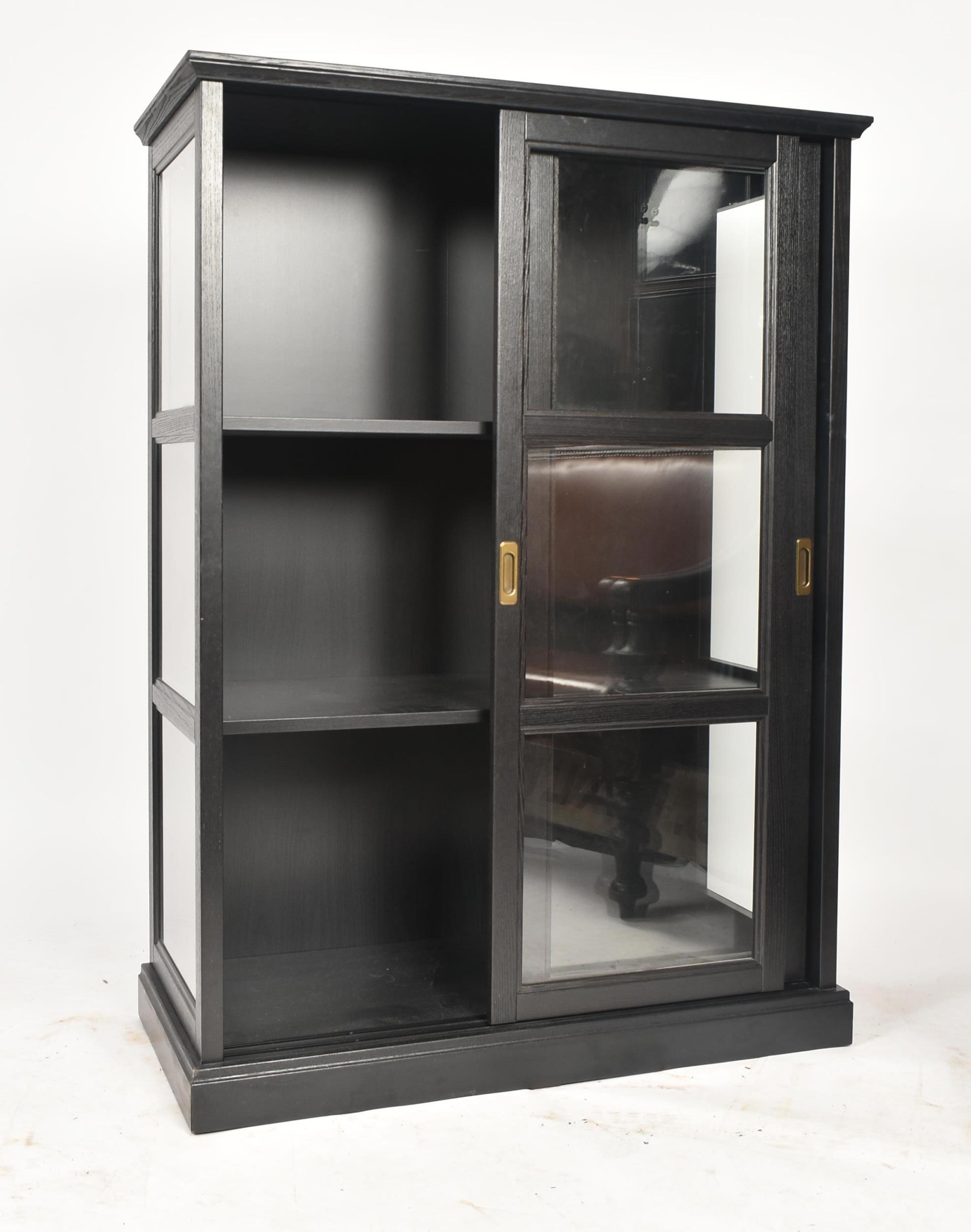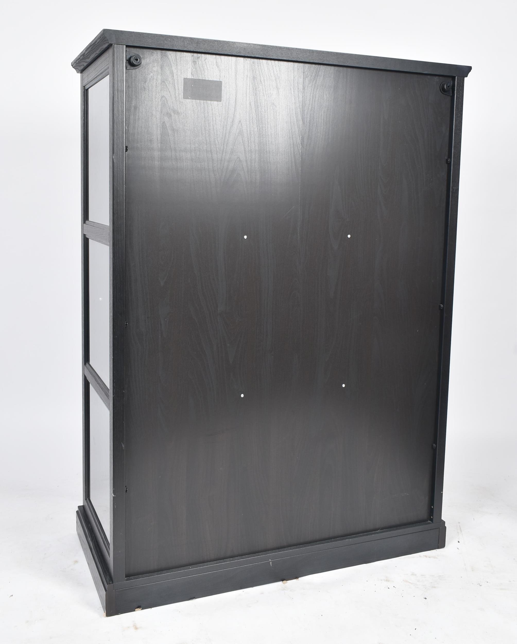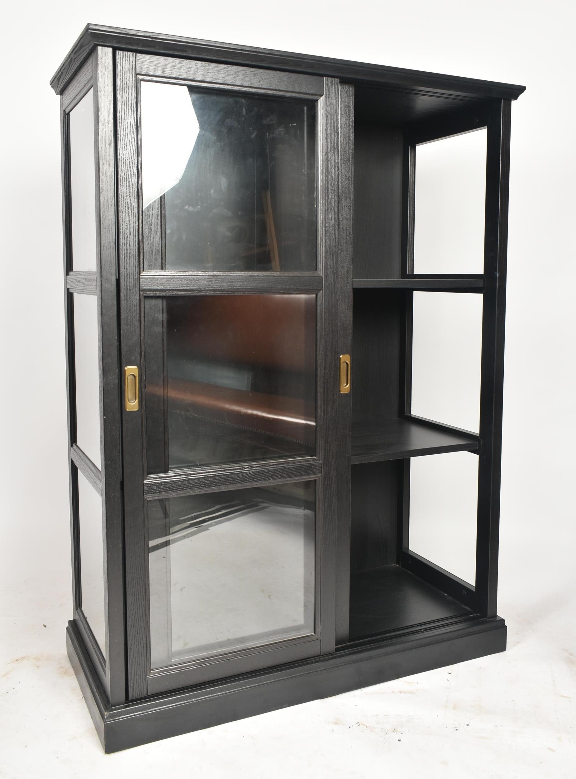Ikea - Malsjo - A contemporary Swedish design ebonised wood & glass display cabinet / bookcase. The cabinet having two full length sliding doors set with two shelves with all raised on a plinth base. Measures approx. 144cm x 104cm x 48cm.