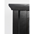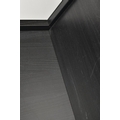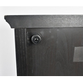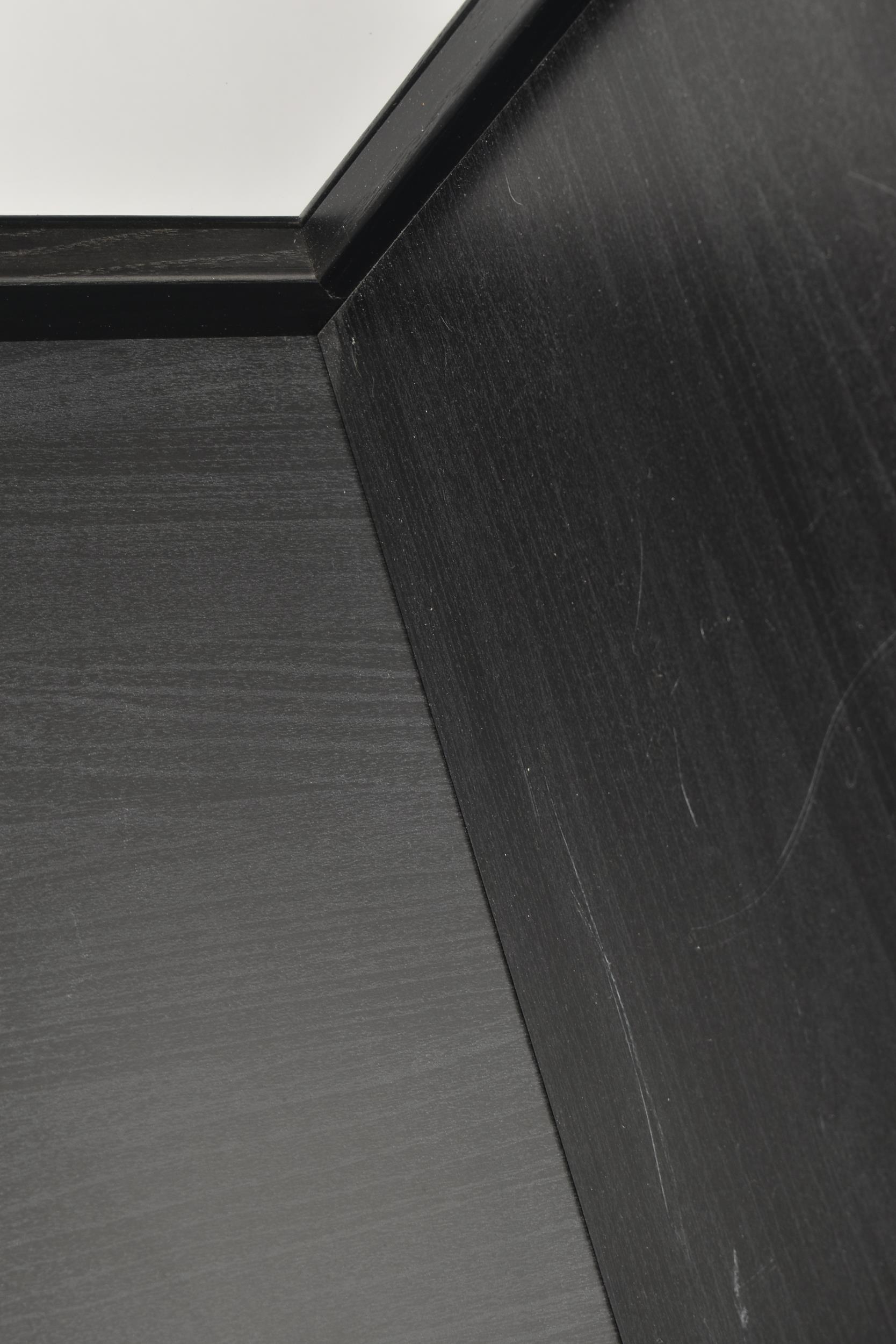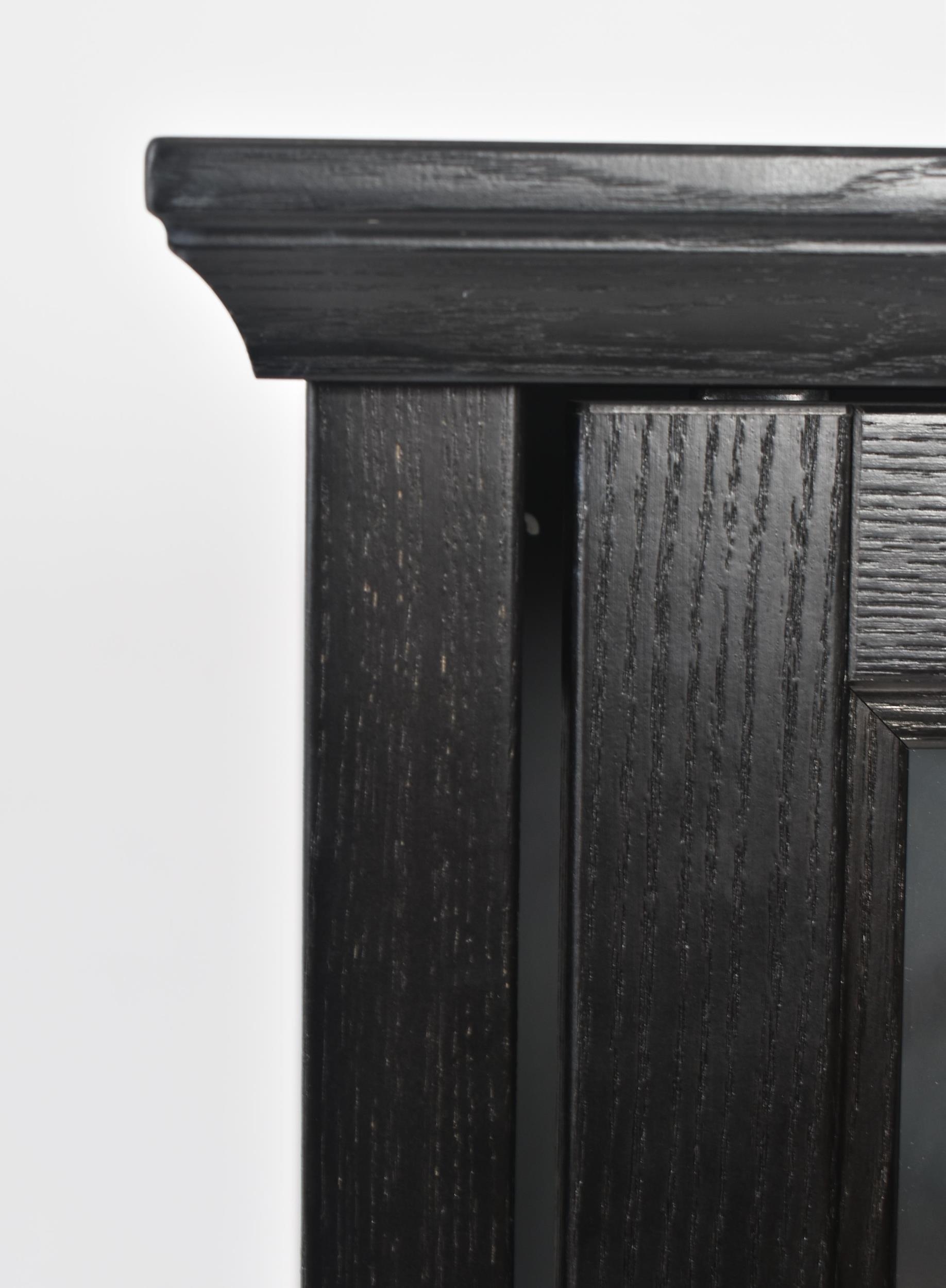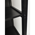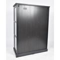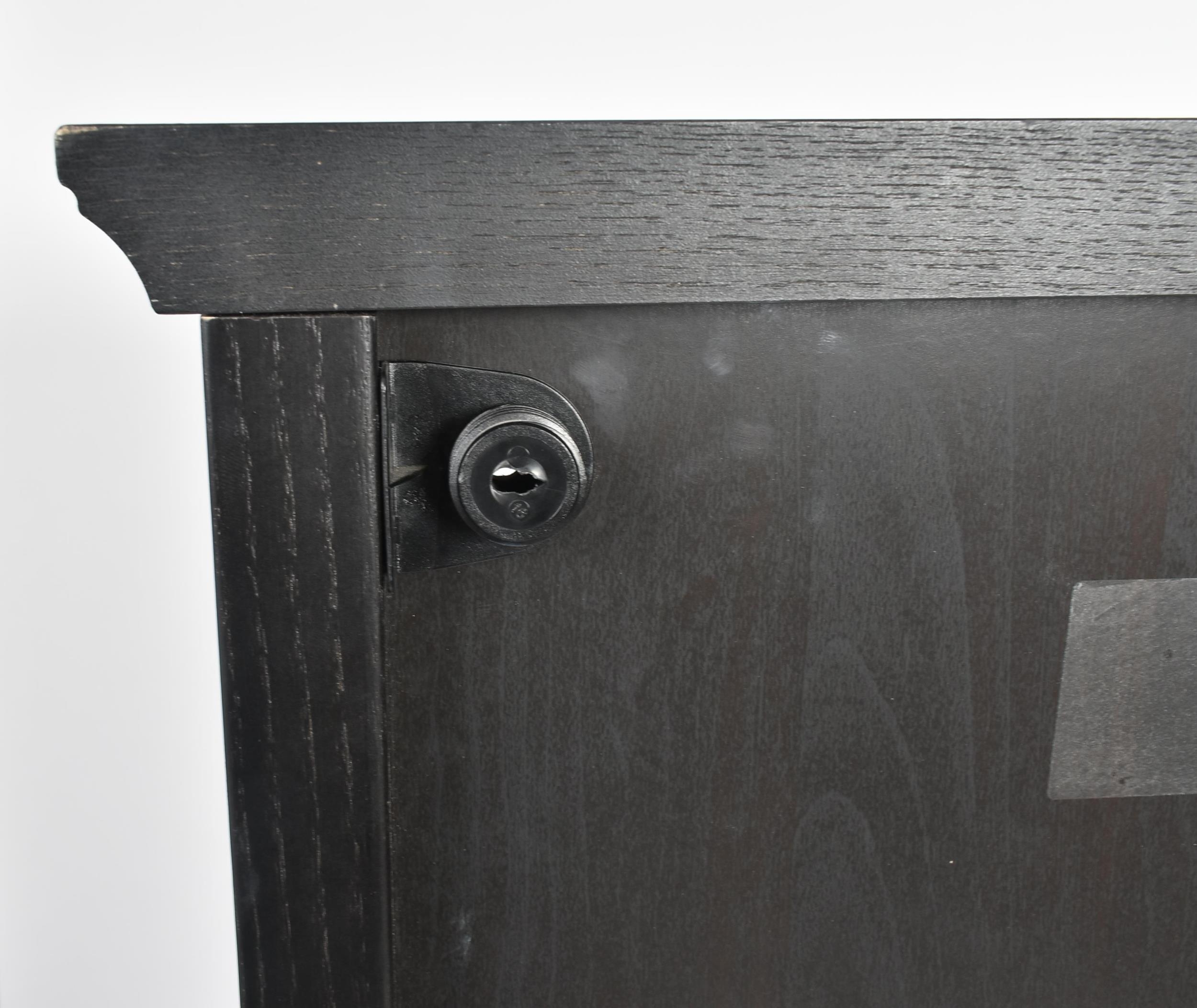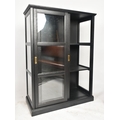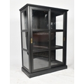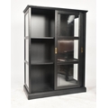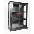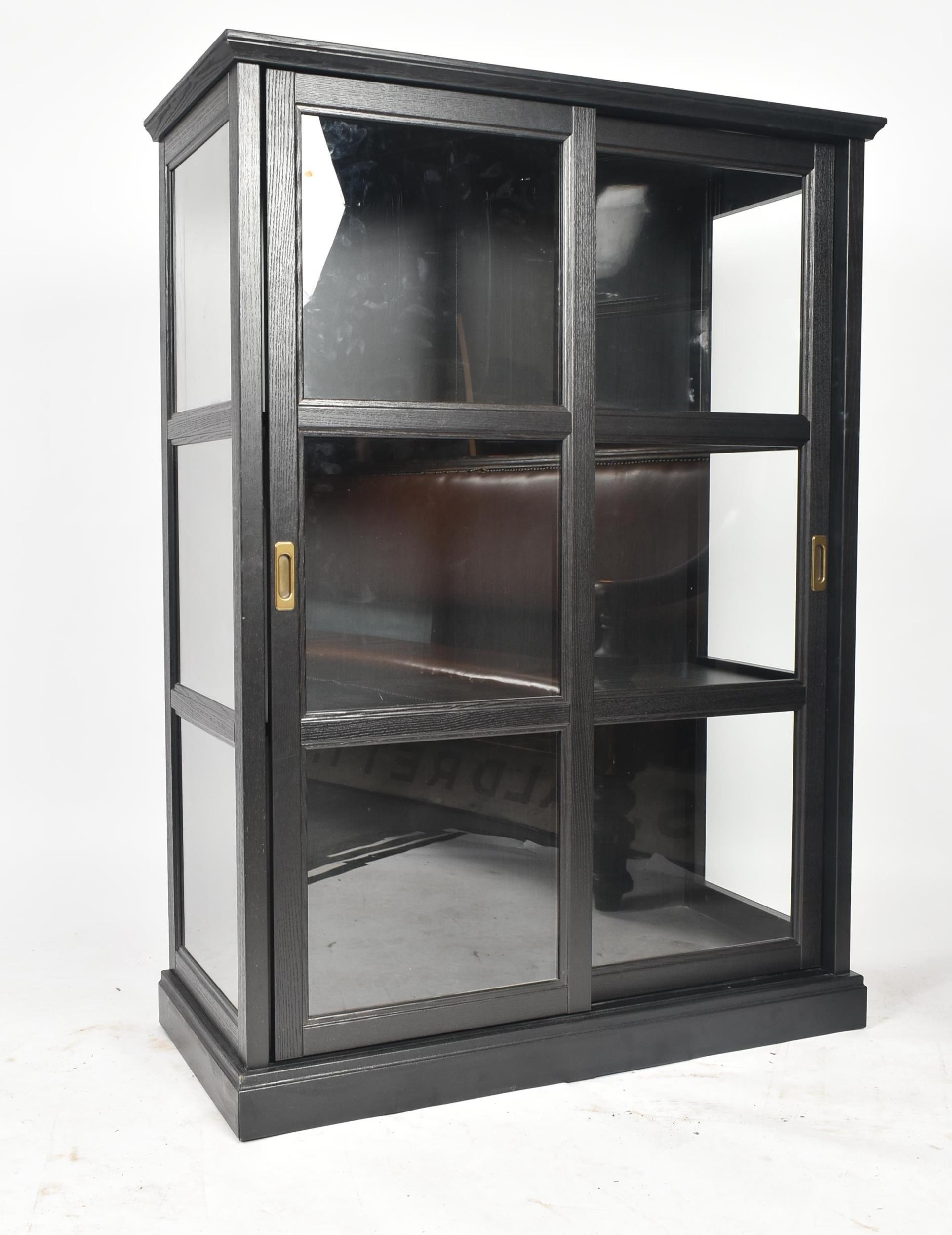 Ikea - Malsjo - A contemporary Swedish design ebonised wood & glass display cabinet / bookcase. The cabinet having two full length sliding doors set with two shelves with all raised on a plinth base. Measures approx. 144cm x 104cm x 48cm.