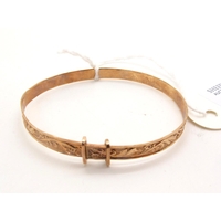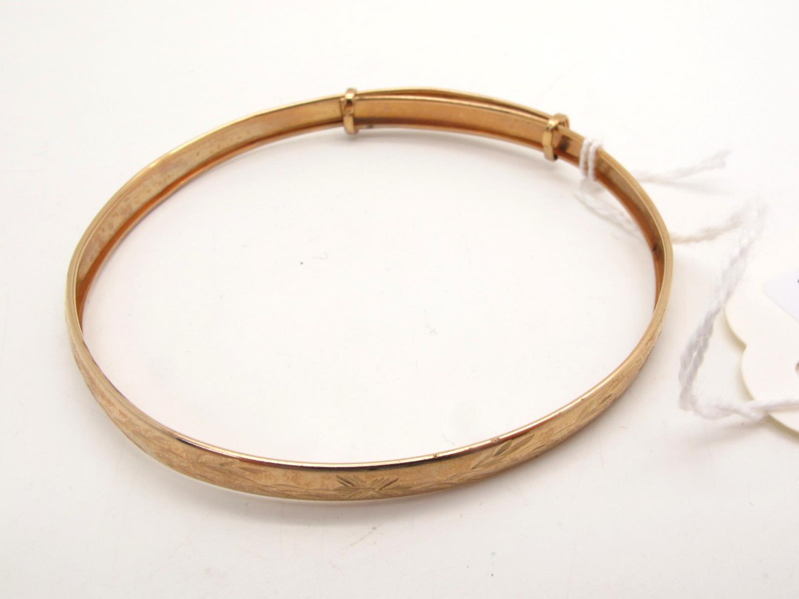 A Modern Expanding Bangle, with bright cut engraved decoration, stamped "375" (3grams).
