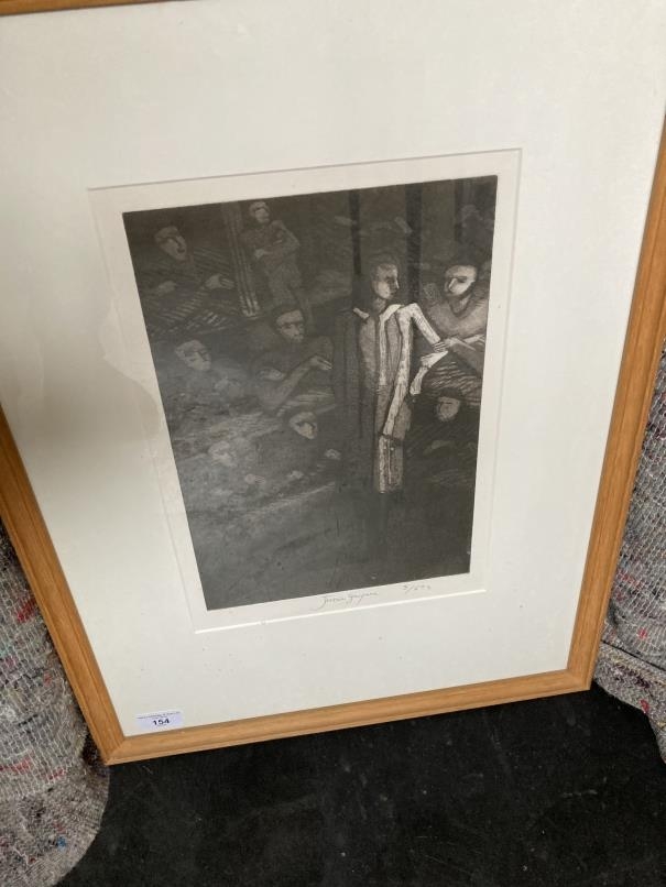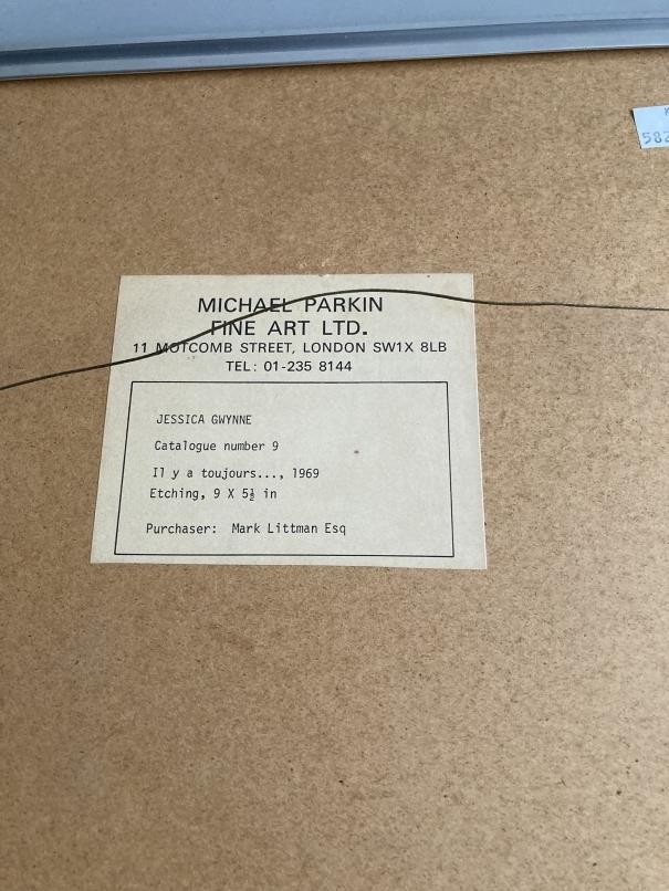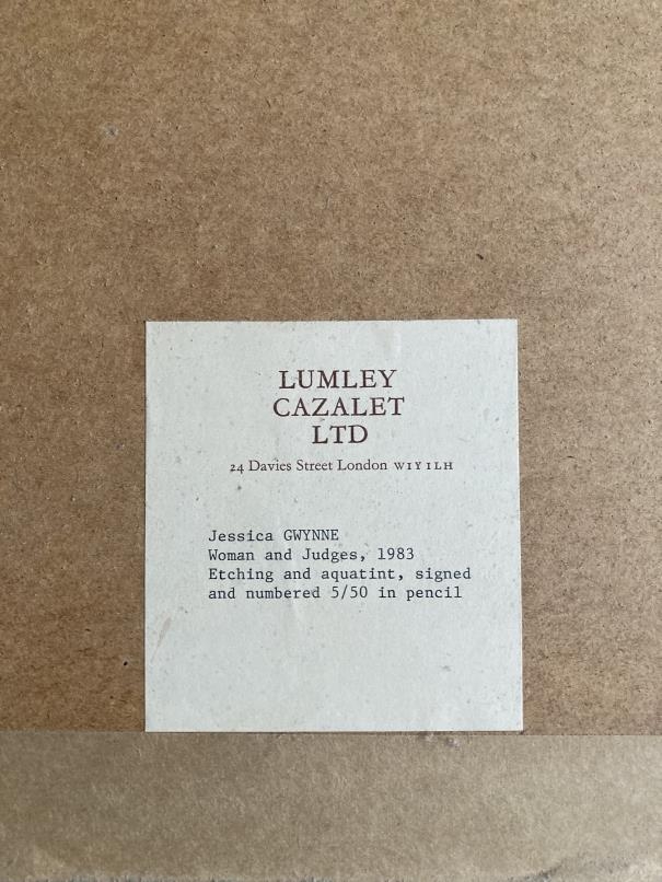 Jessica Gwynne: Etching and aquatint, 'Woman and Judges', 1983, signed and numbered 5 of 50. Titled on a Lumley Cazalet label, framed and glazed. 12¼ins. x 8¼ins. Plus another Jessica Gwynne artist's proof etching 'Il y a Toujours