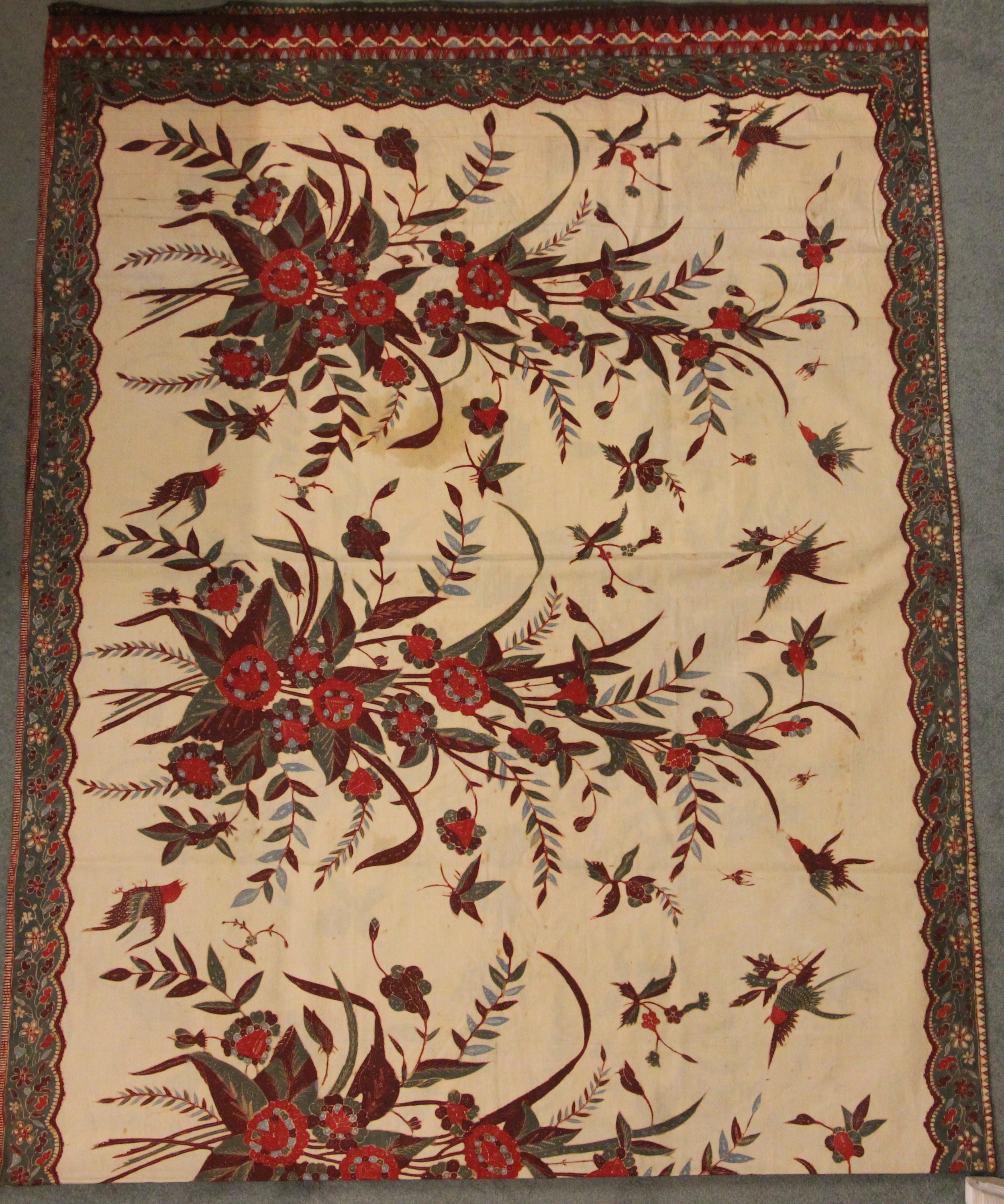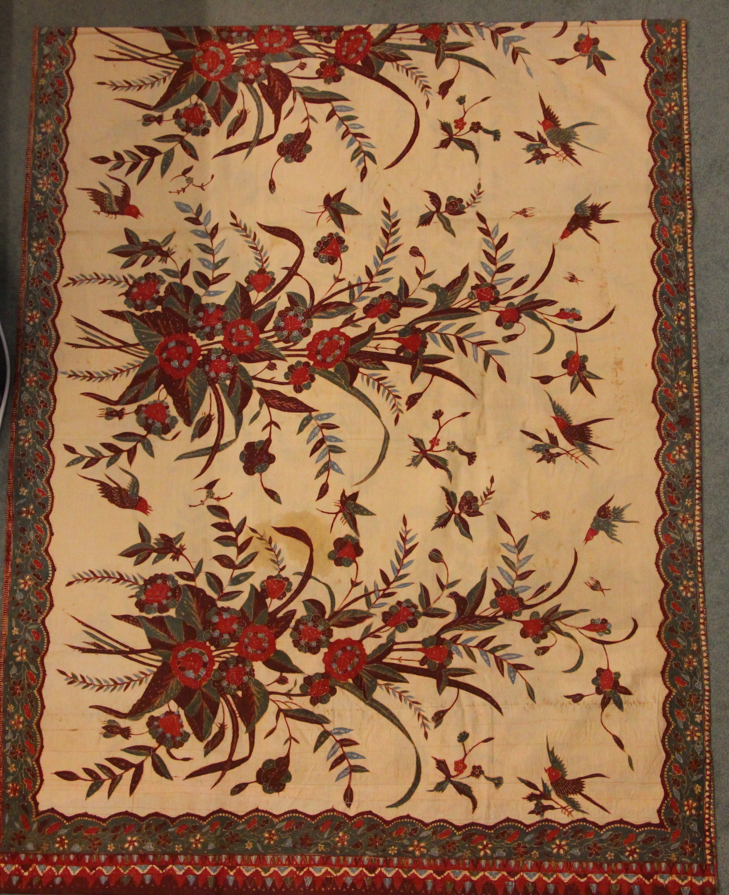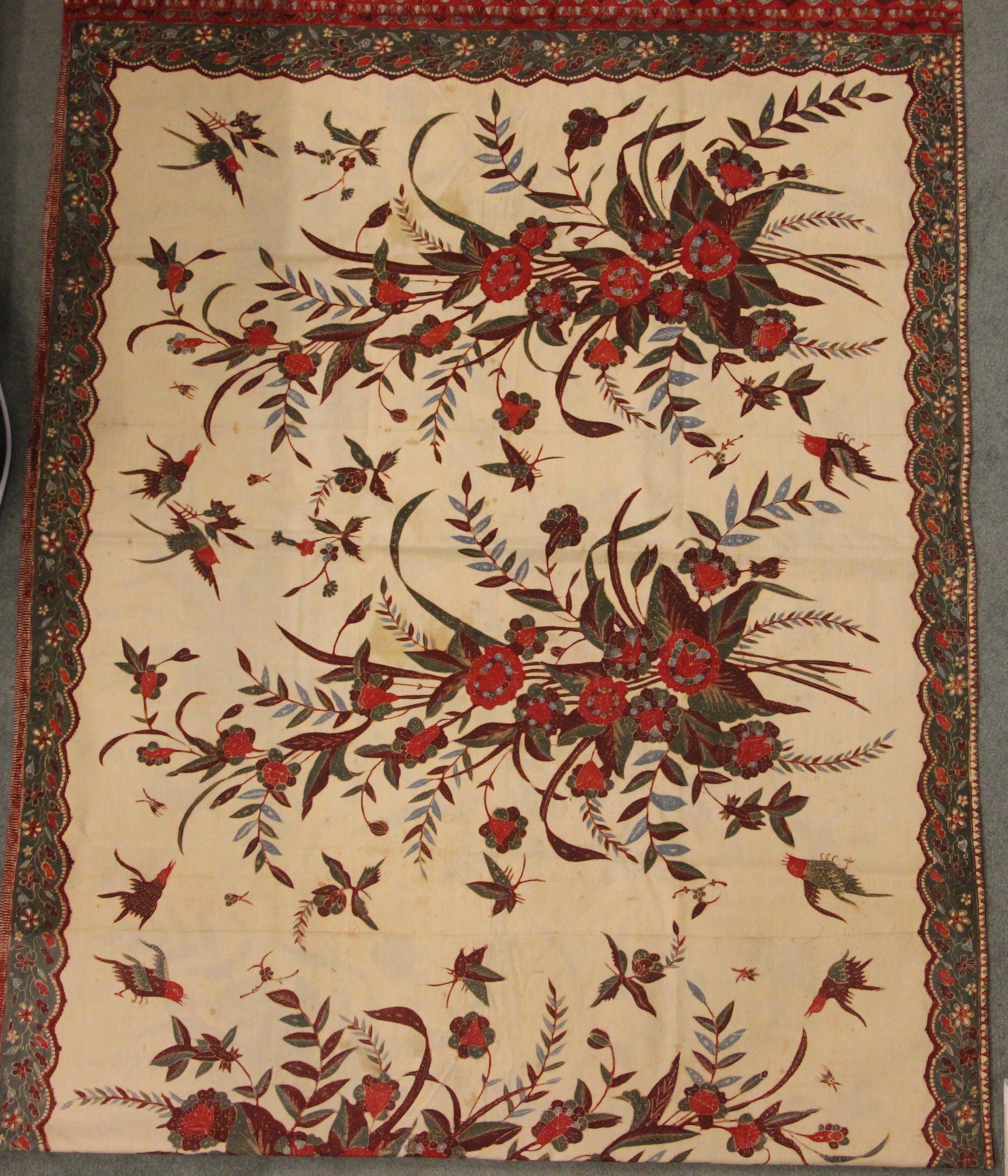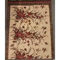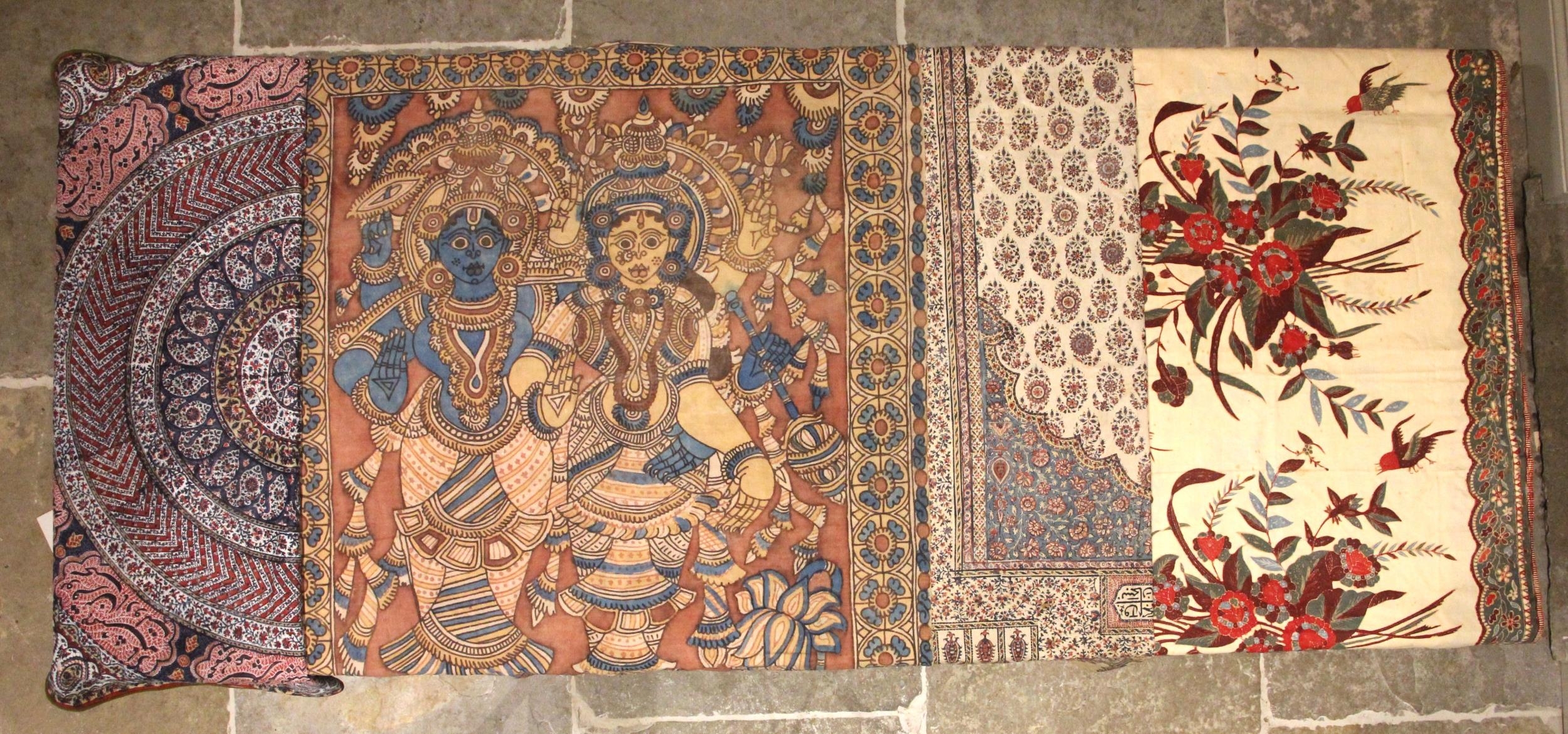 A large batik panel, Turkish 19th century, designed as a five large floral sprays in claret, scarlet and green against an ivory ground, further scattered with birds and insects 103cm x 267cm with an Indo-Persian kalamkari panel printed in a temple and paisley design, signed, 126cm x 88cm, a South East Asian Batik panel depicting two Boddhisatva, 112cm x 81cm and a circular paisley printed panel 106cm diameter (4)