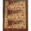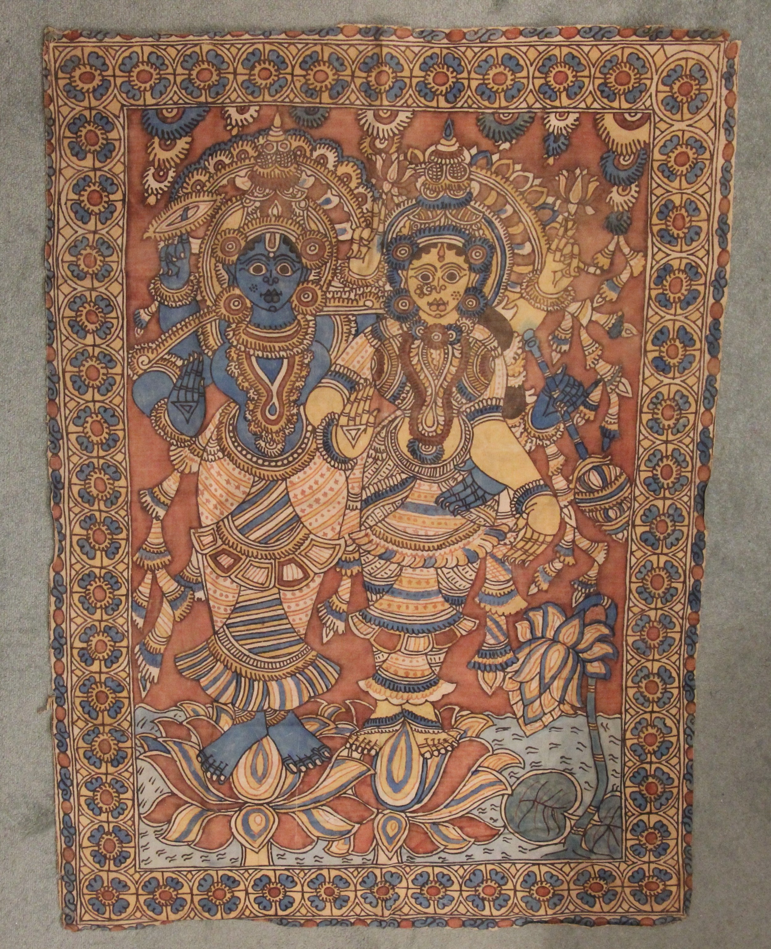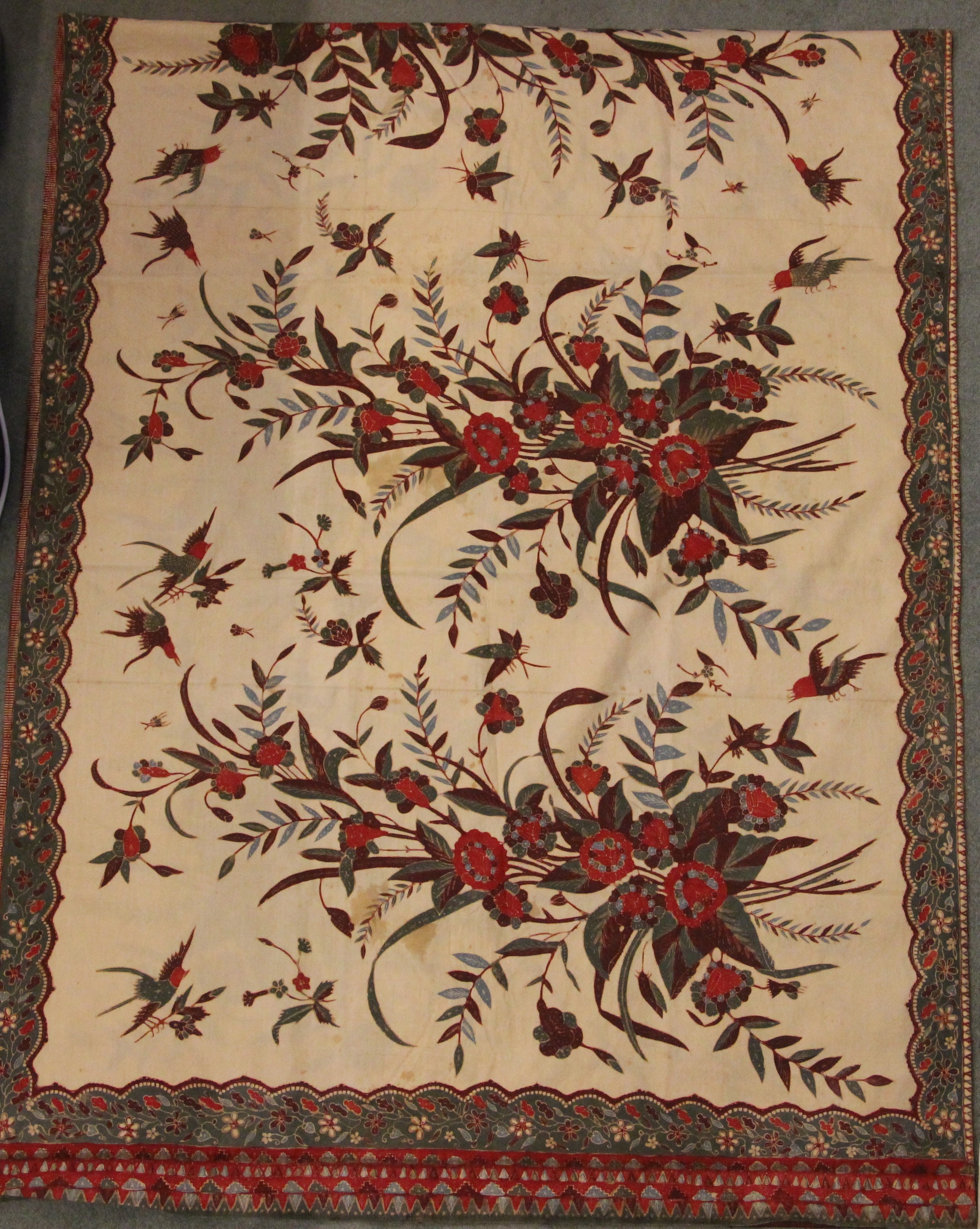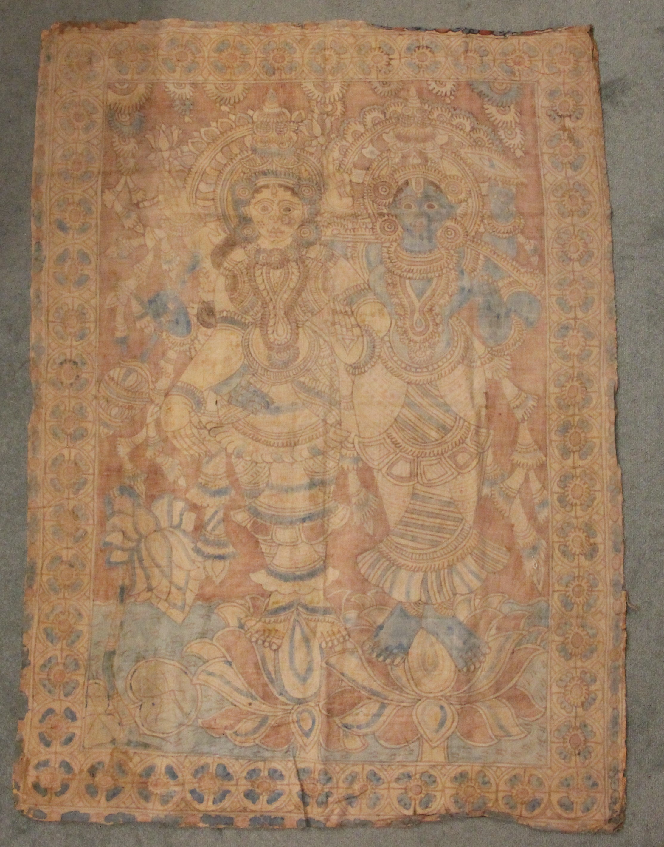 A large batik panel, Turkish 19th century, designed as a five large floral sprays in claret, scarlet and green against an ivory ground, further scattered with birds and insects 103cm x 267cm with an Indo-Persian kalamkari panel printed in a temple and paisley design, signed, 126cm x 88cm, a South East Asian Batik panel depicting two Boddhisatva, 112cm x 81cm and a circular paisley printed panel 106cm diameter (4)