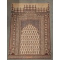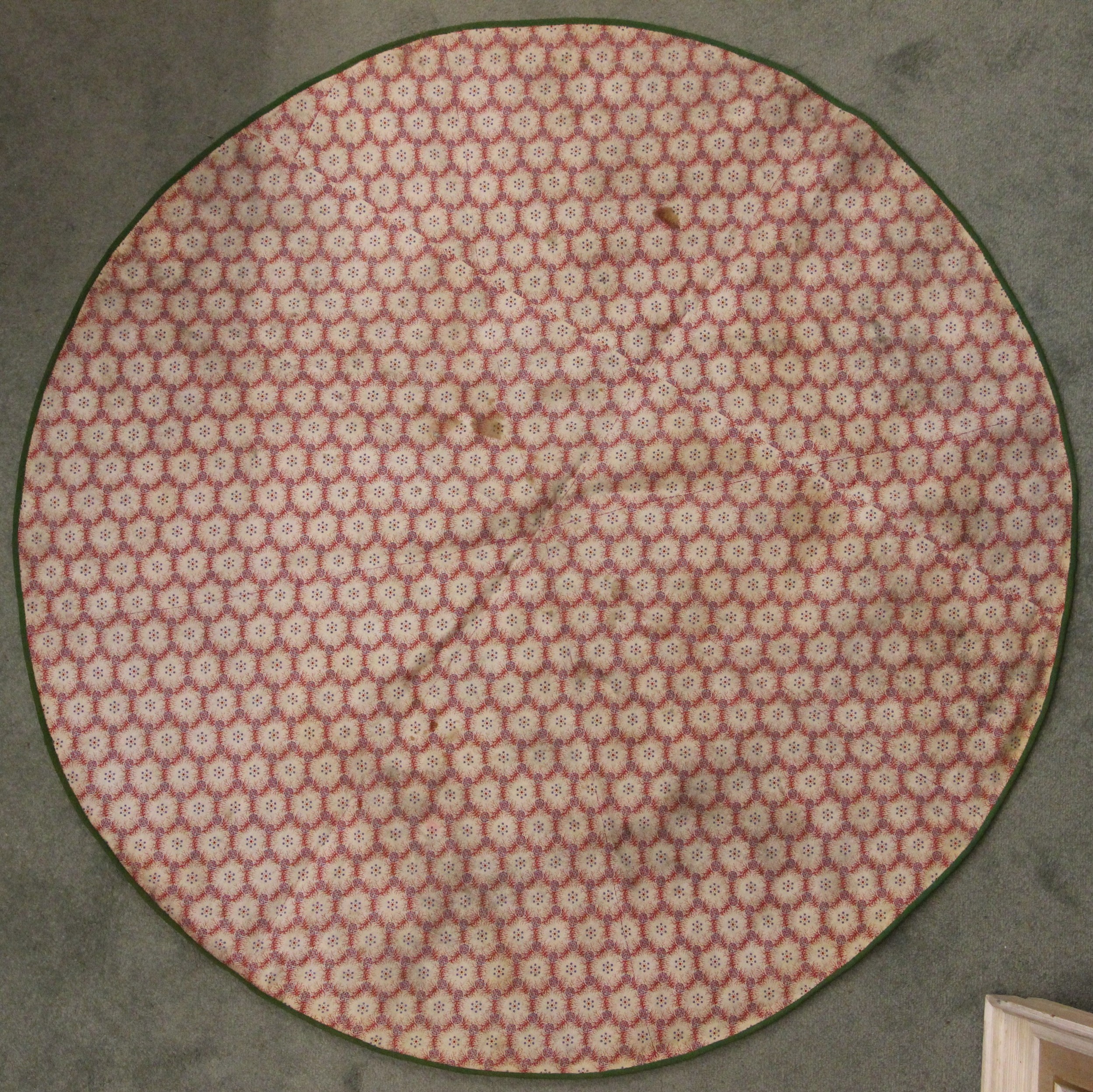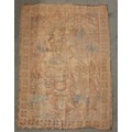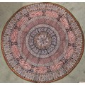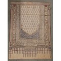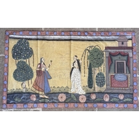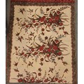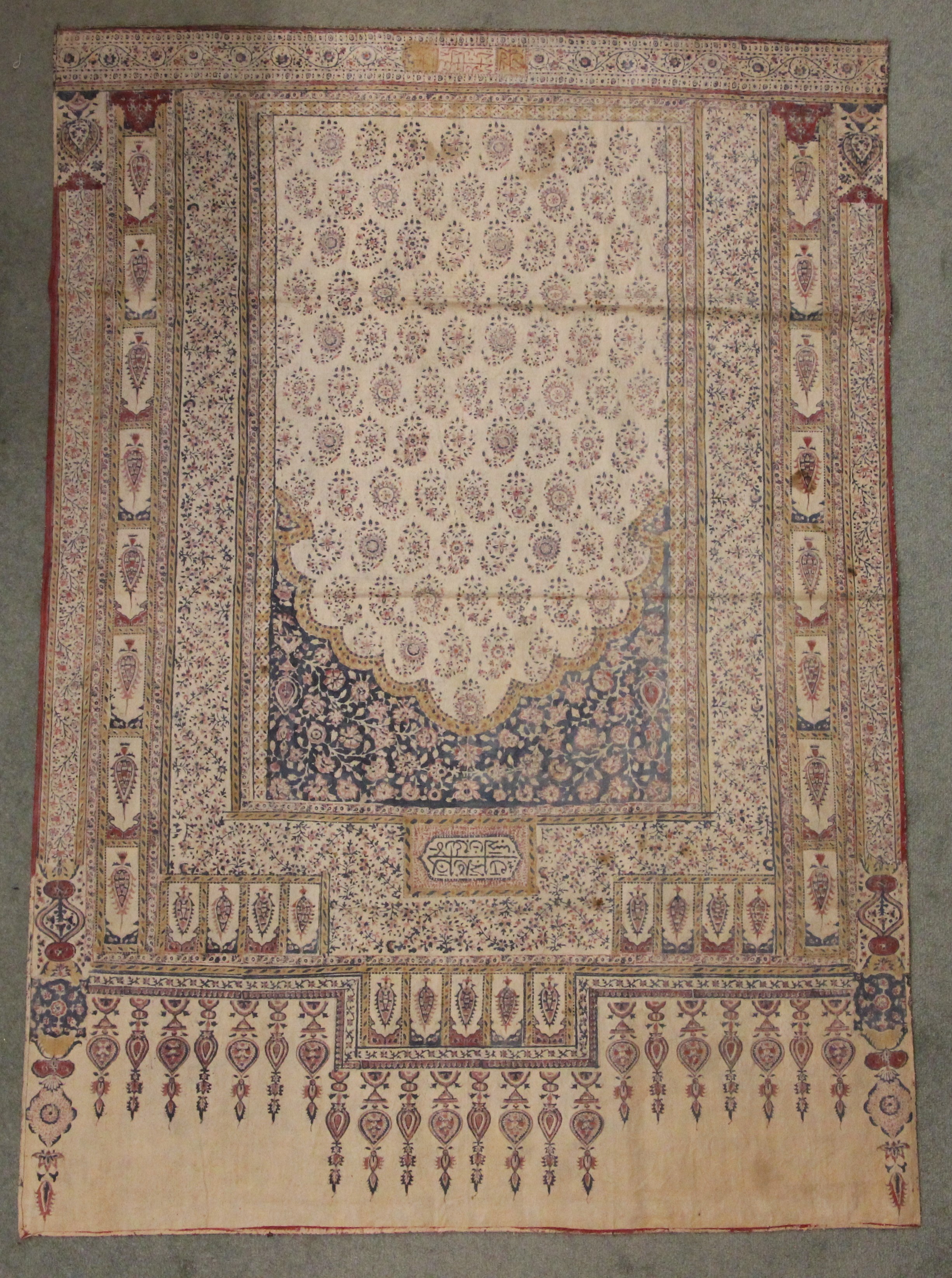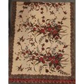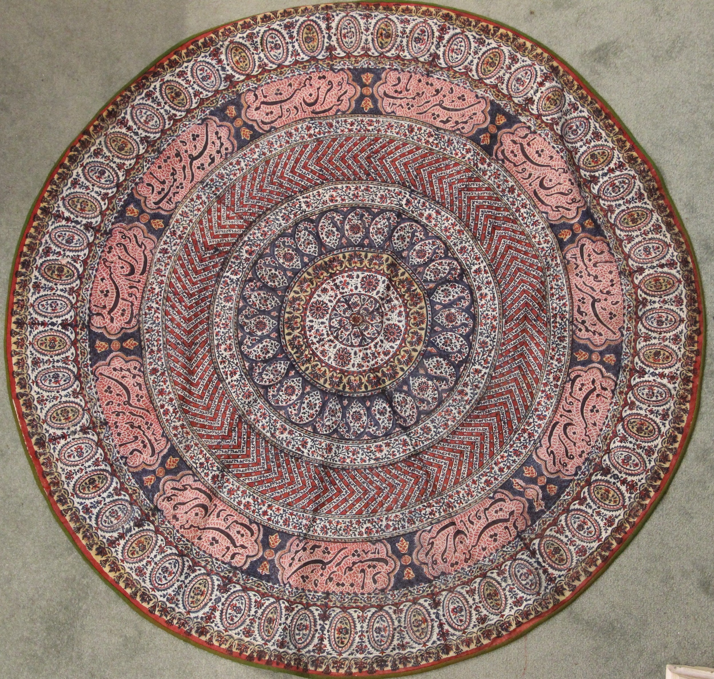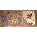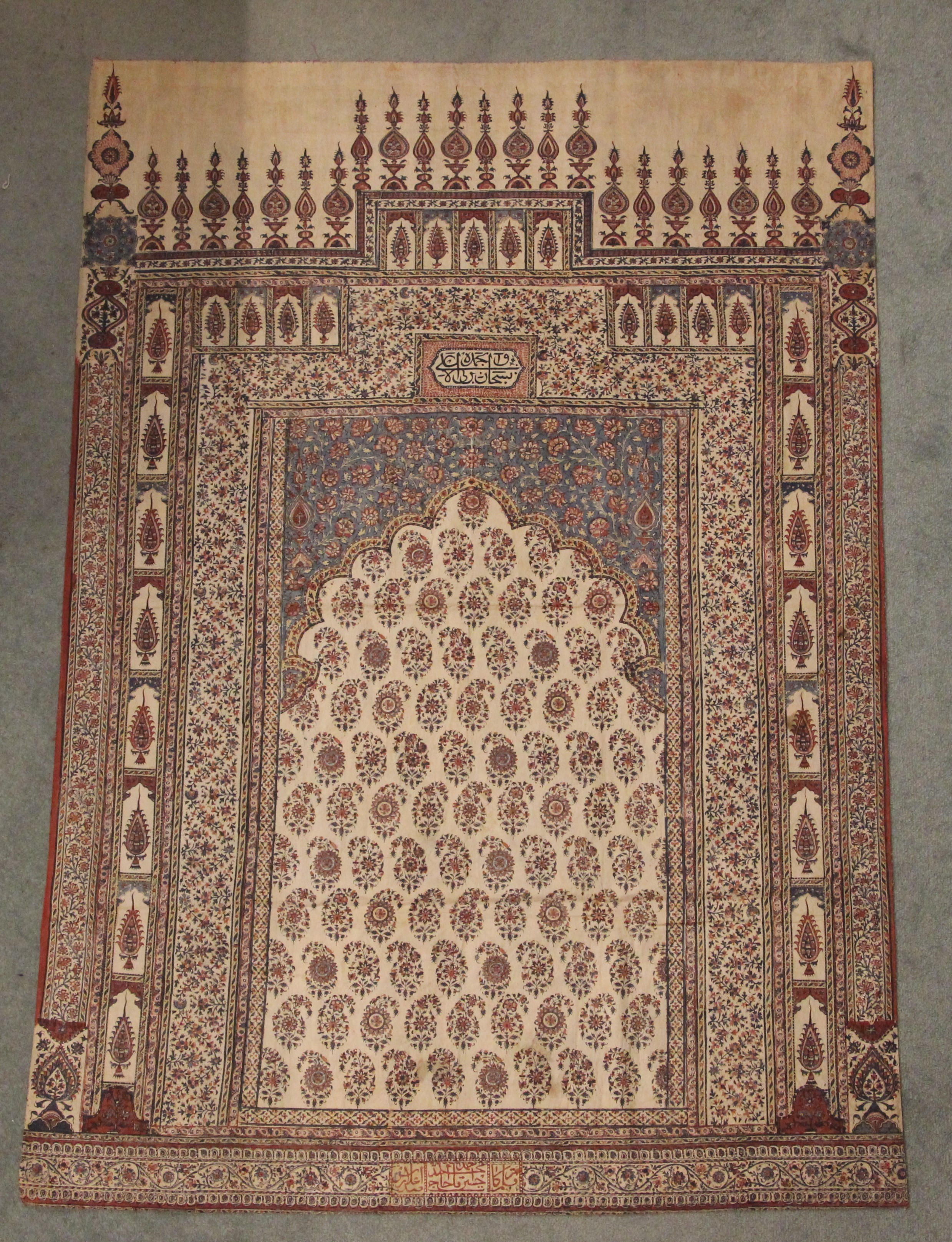 A large batik panel, Turkish 19th century, designed as a five large floral sprays in claret, scarlet and green against an ivory ground, further scattered with birds and insects 103cm x 267cm with an Indo-Persian kalamkari panel printed in a temple and paisley design, signed, 126cm x 88cm, a South East Asian Batik panel depicting two Boddhisatva, 112cm x 81cm and a circular paisley printed panel 106cm diameter (4)