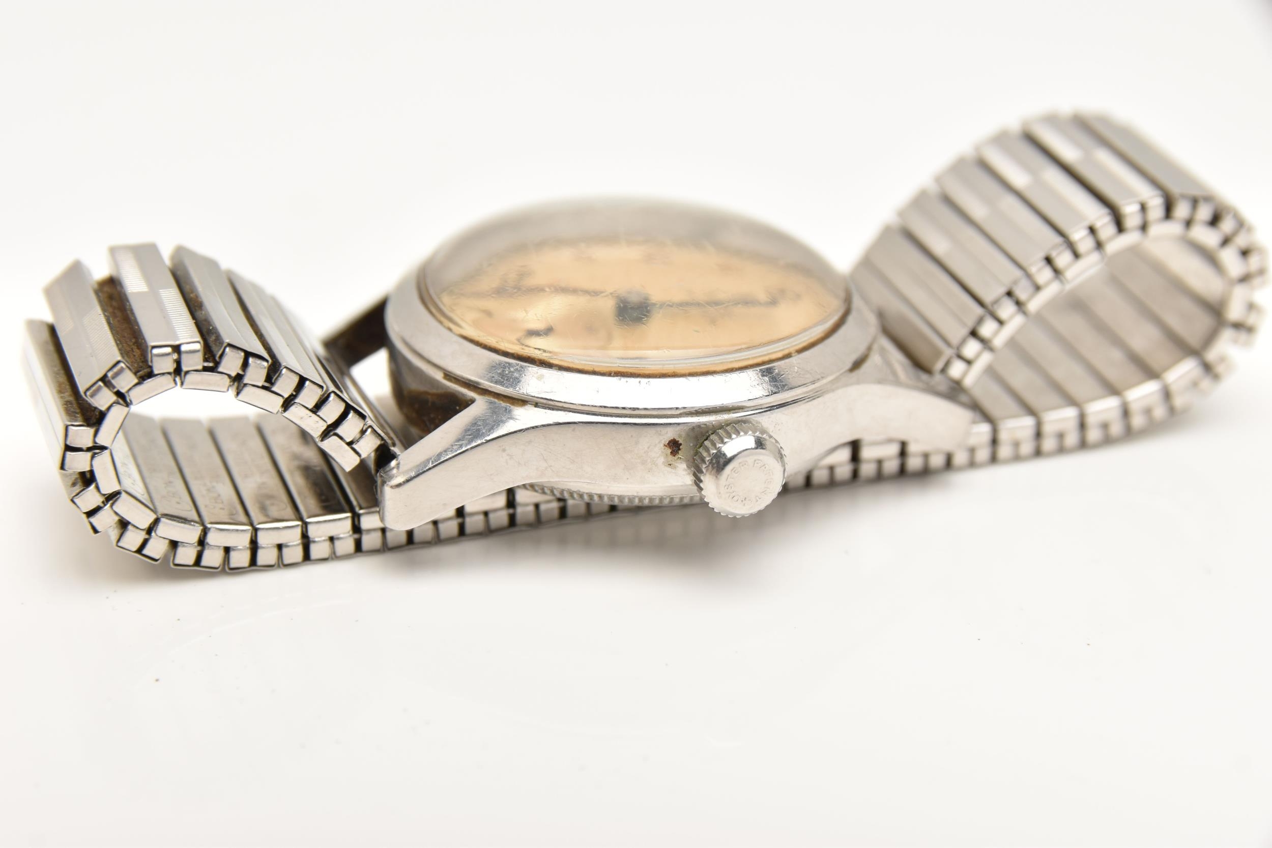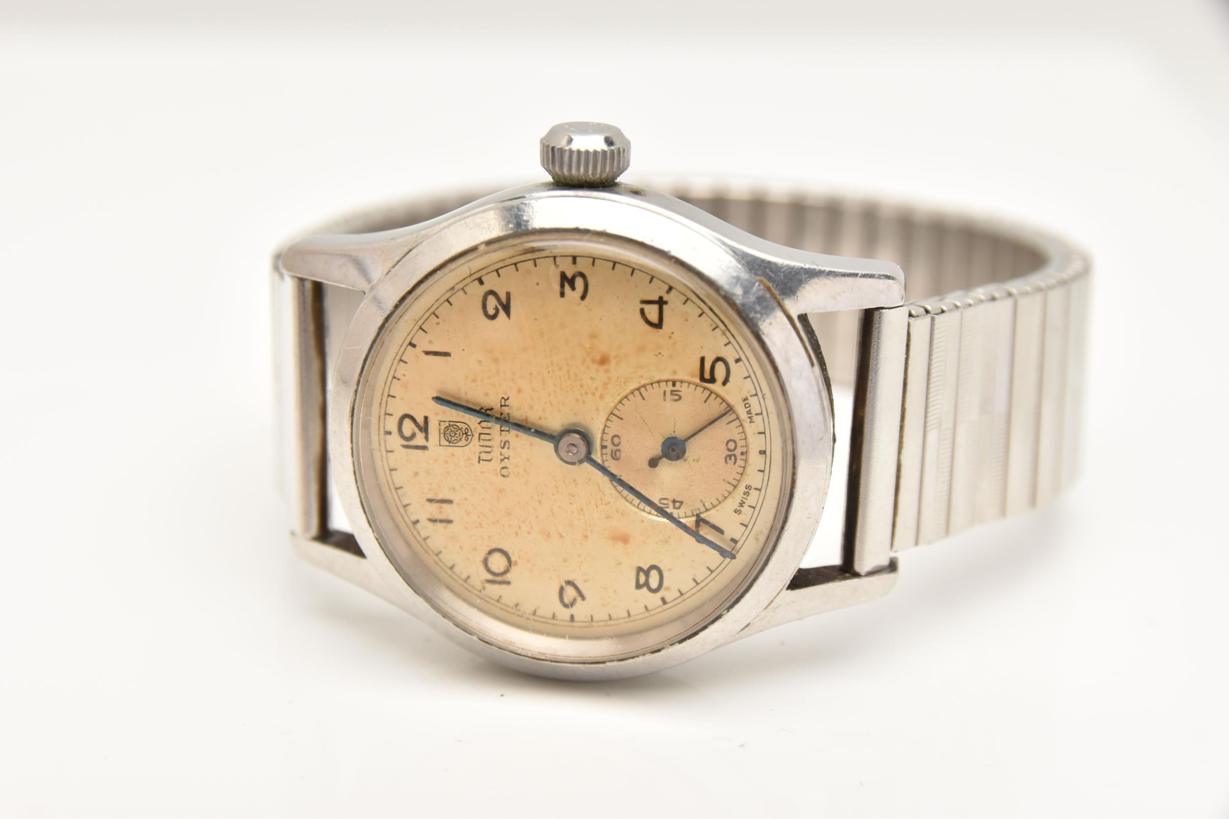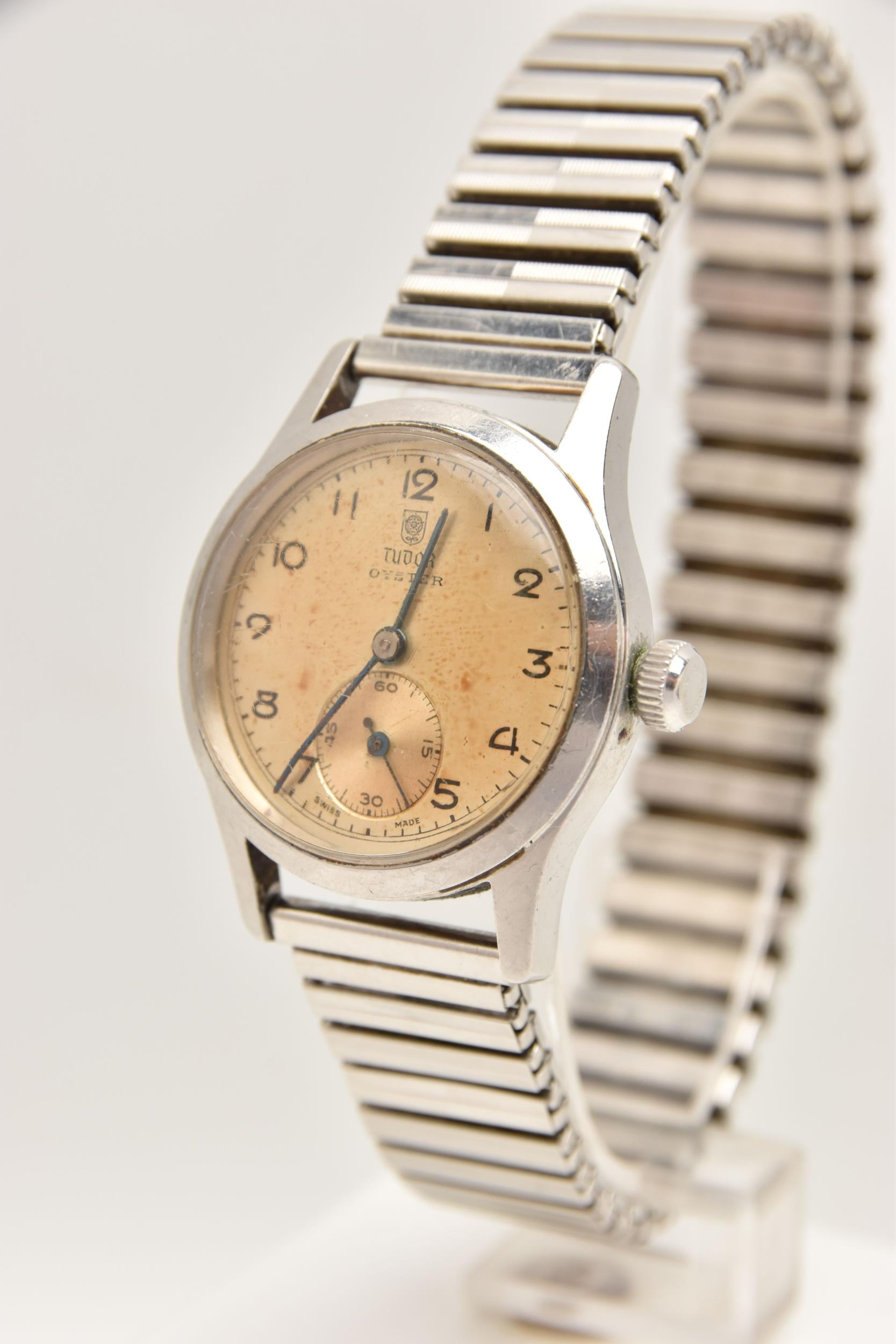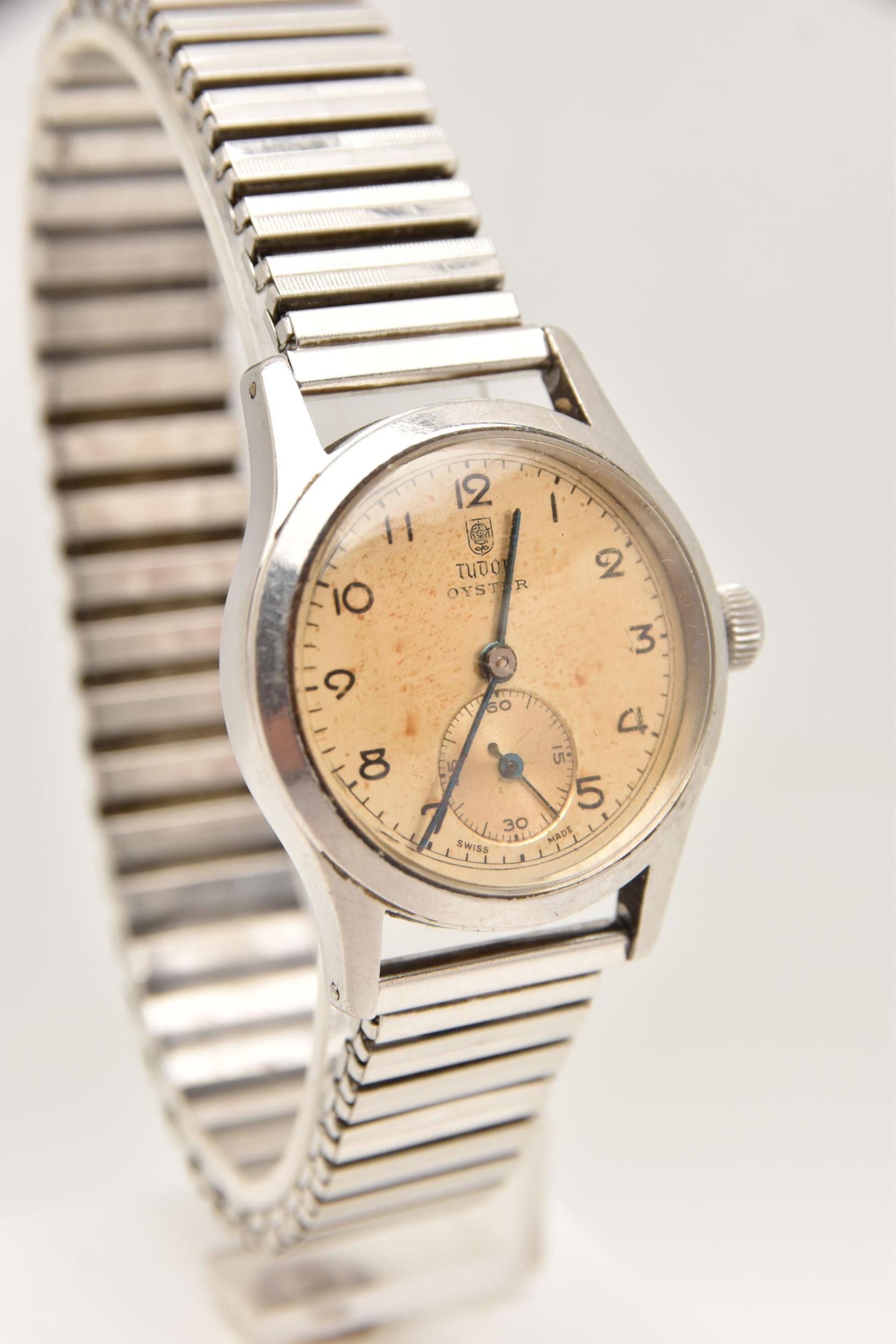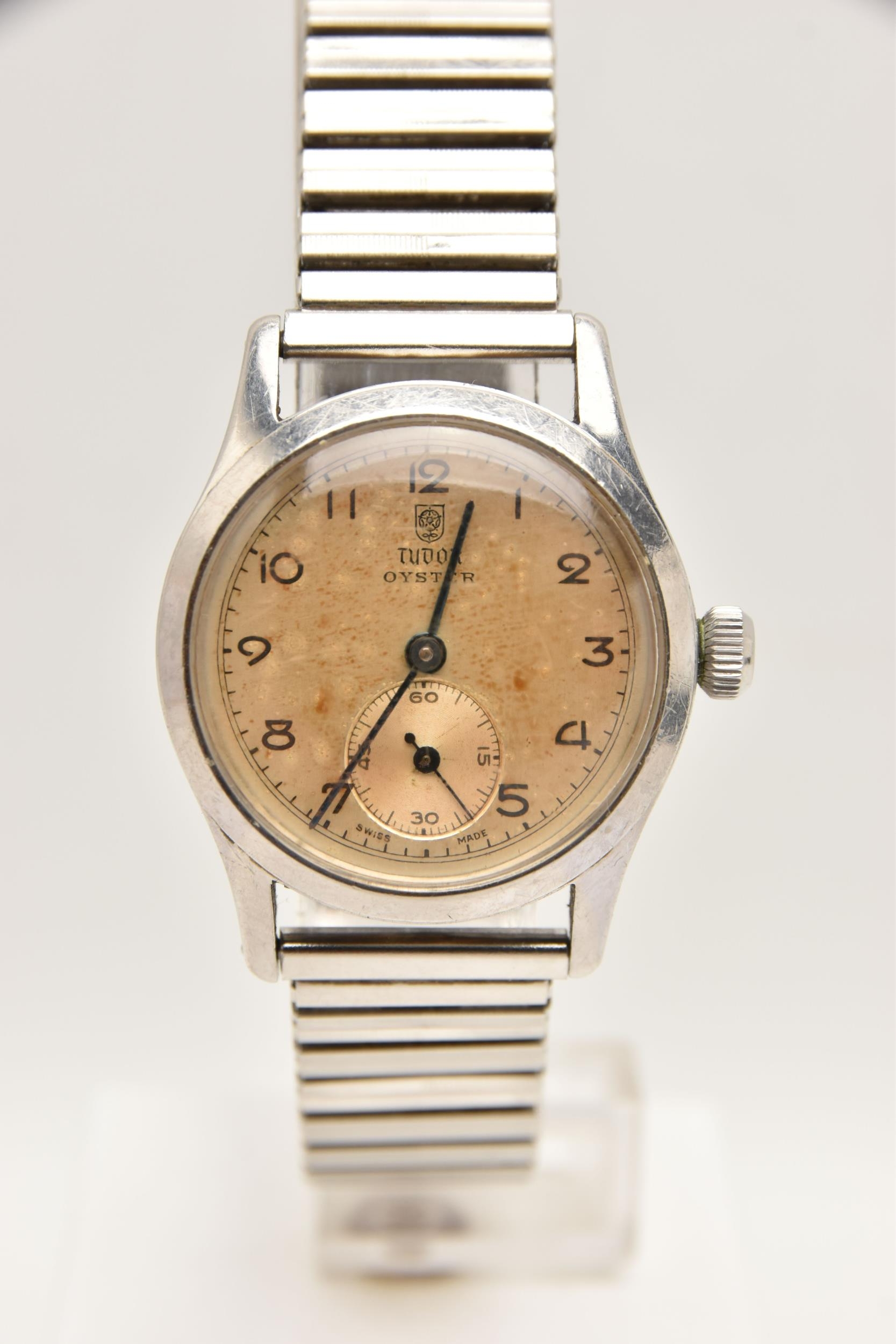 A 'TUDOR' OYSTER WRISTWATCH, hand wound movement, round dial signed 'Tudor' Oyster, Arabic numerals, subsidiary second dial at the six o'clock position, stainless steel case, approximate case width 31mm, case back numbered 5332 4453, screw case back not removed, fitted with a stretch link bracelet, (condition report: general moderate wear, watch does not wind, not currently working, we cannot guarantee the working condition of the watch)