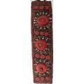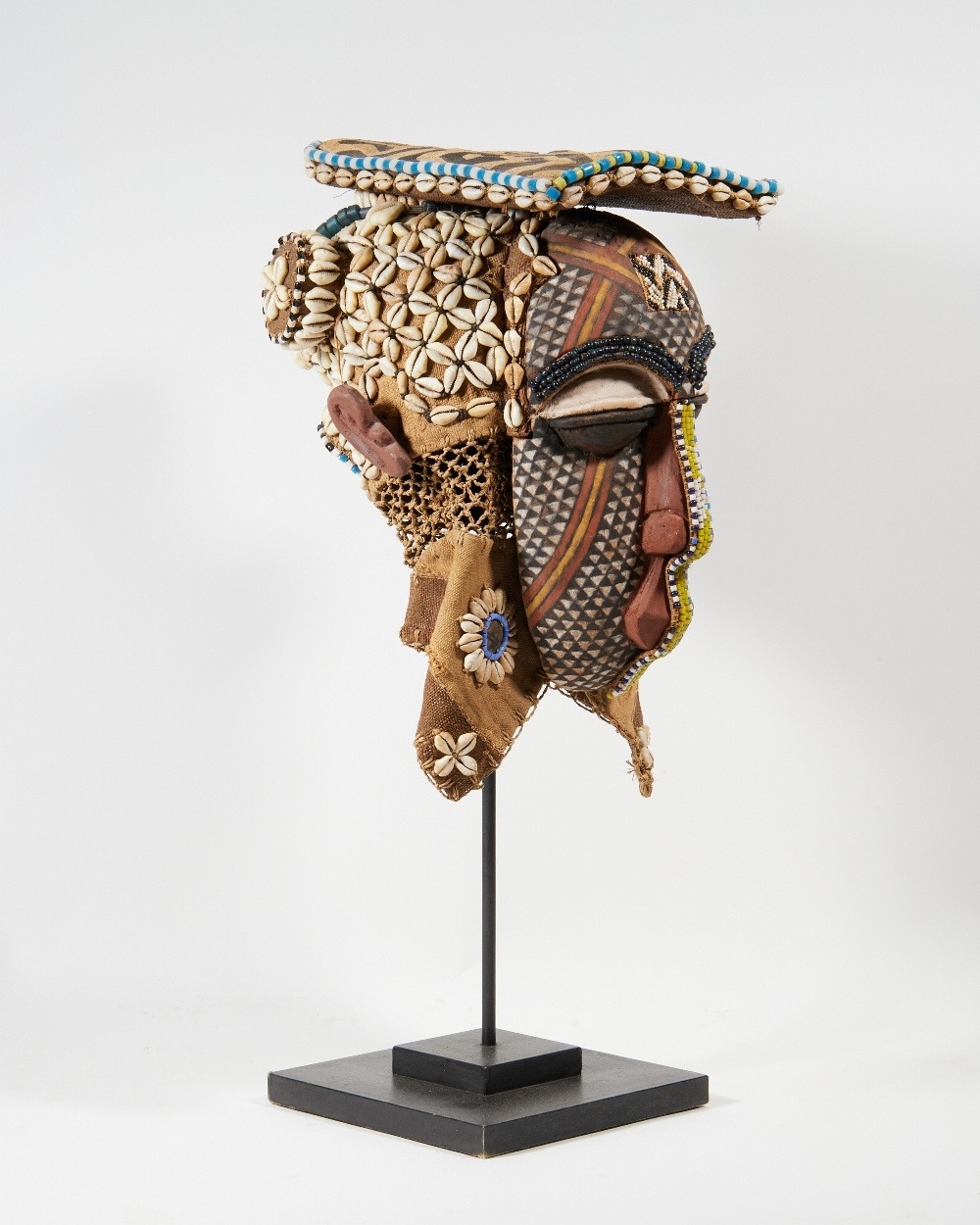 A Ngaady a Mwaash mask, Kuba, DRC, polychrome painted, the headdress with raffia weave textile, the mask with bead and cowry shell decoration, on black painted wood and metal stand, the mask approx. 36cm high, 21cm wide, 24cm deep, approx. 54cm high on stand, together with a textile panel, possibly Tibetan, the embroidered floral panel woven with coral bead roundels surrounded by small conch shells, within coral and turquoise bead borders, with leather strap for wall mounting, 130cm high, 32cm wide (2)