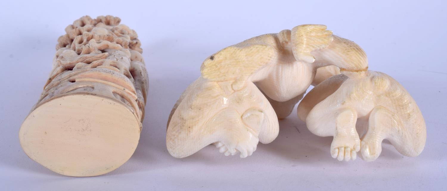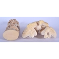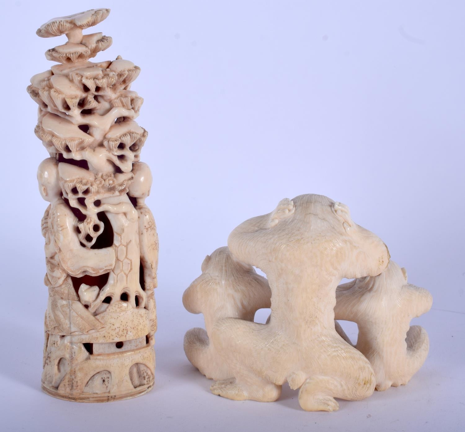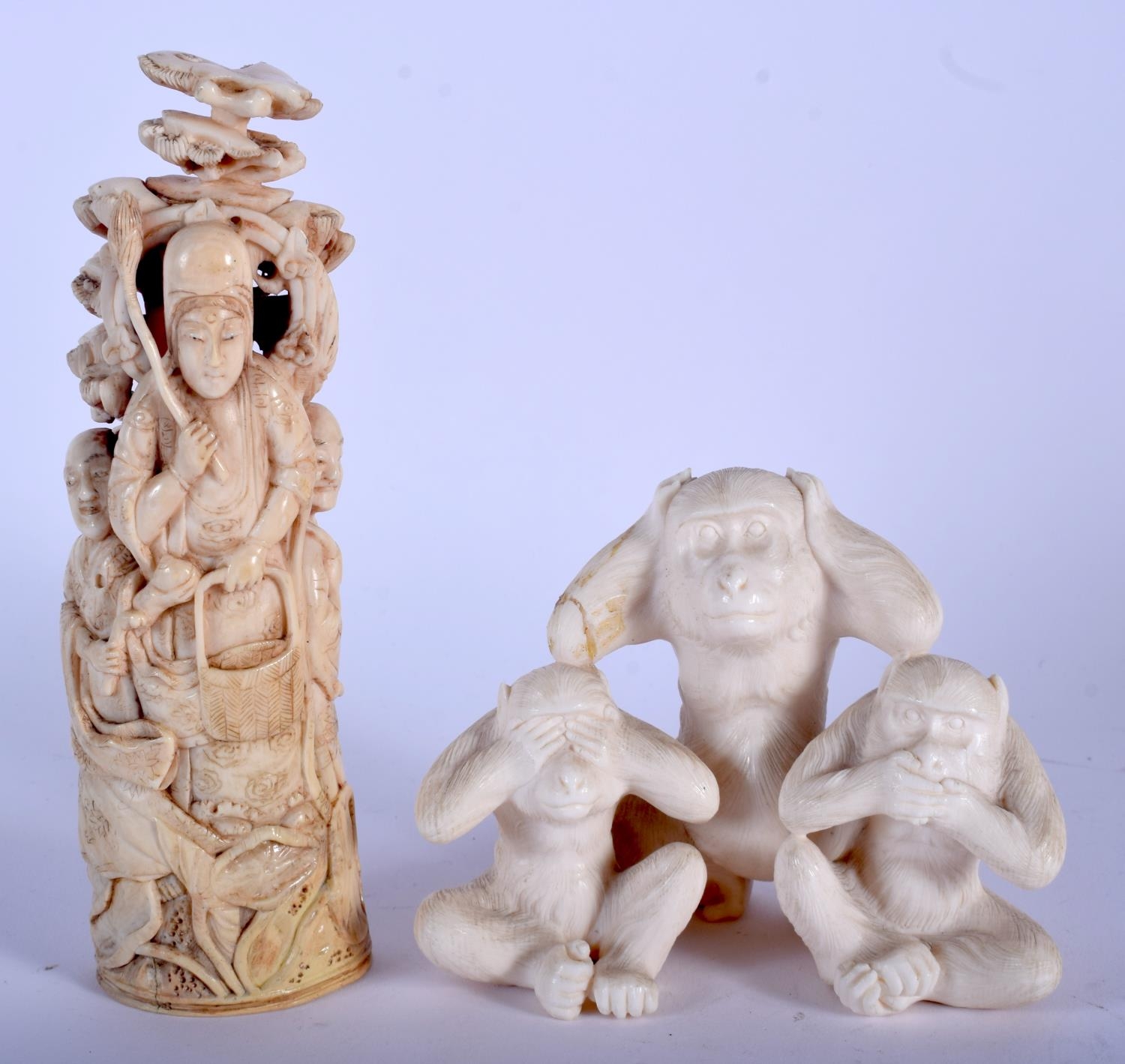 A 19TH CENTURY JAPANESE MEIJI PERIOD CARVED IVORY OKIMONO modelled as three scholars, together with a meiji period carved ivory wise monkey group. Largest 16 cm x 4 cm. (2)