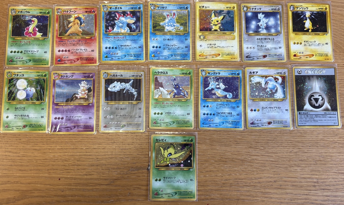 Pokemon. Range of mostly Japanese 'Gold, Silver, to a New World...' holographic rares, generally excellent, including Meganium, Typhlosion, Feraligatr, Azumarill, Pichu, Togetic, Ampharos, Jumpluff, Slowking, Steelix, Heracross, Kingdra, Lugia and Metal Energy. Plus Unumbered Promos Celebi. Qty 15. (Y)