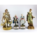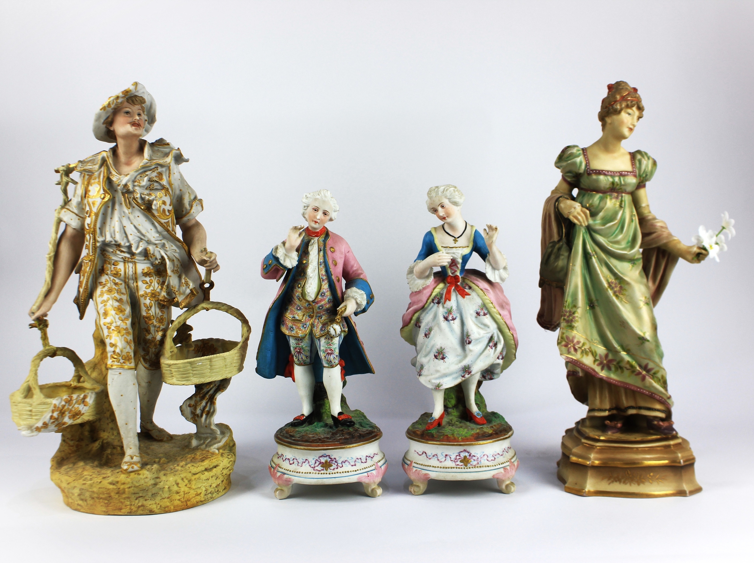 A continental porcelain female figure in Art Nouveau dress, in the manner of Royal Dux, on shaped base, impressed number 1336, together with a continental porcelain figure of a rural farmer carrying a pair of baskets, height 42cm, and a pair of continental bisque porcelain figures, of a male and female in Meissen style design, the first height 40cm (4) (AF)