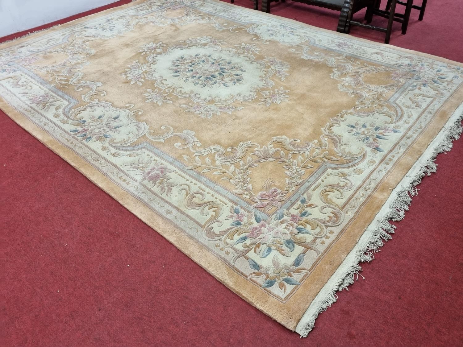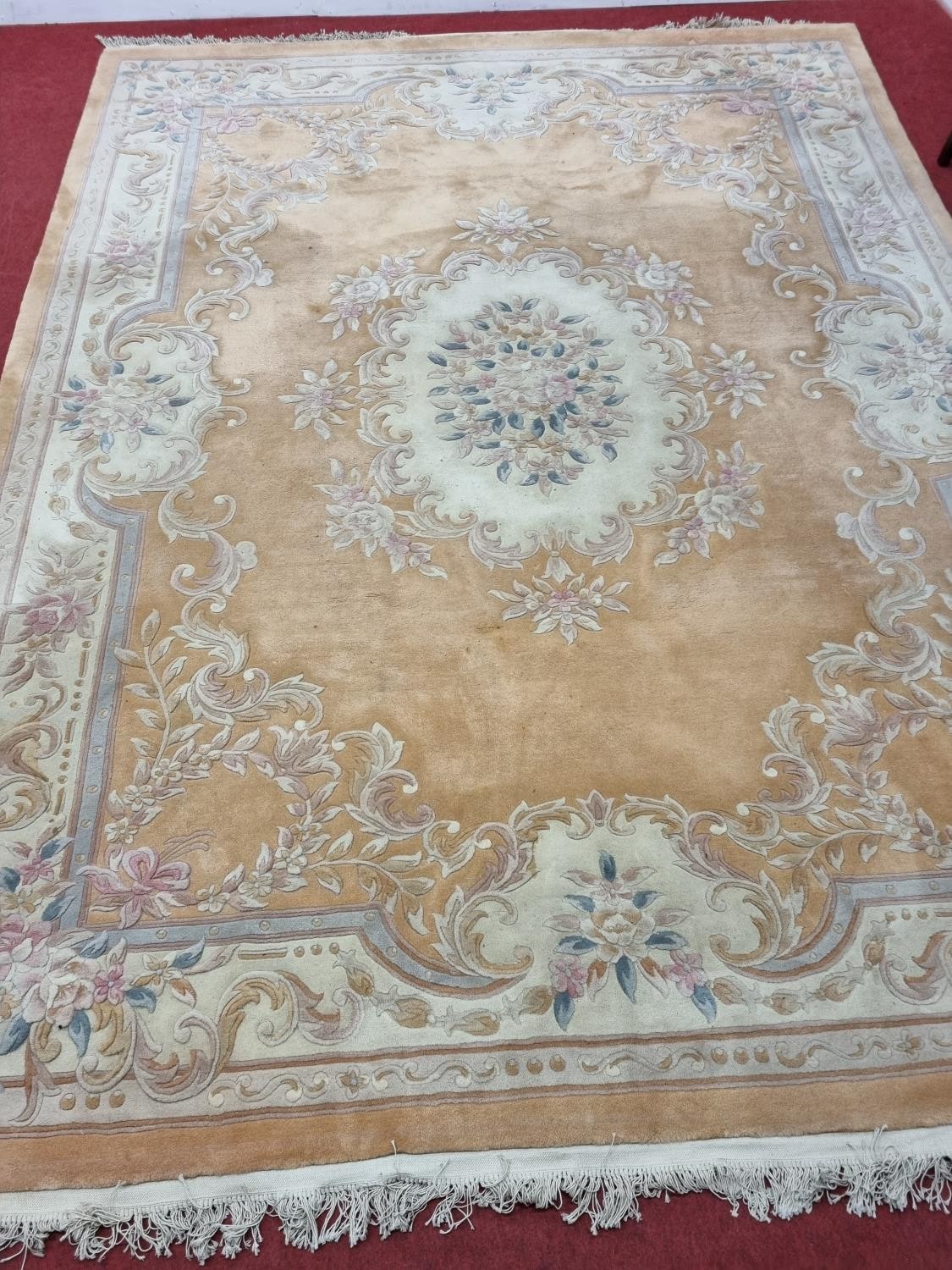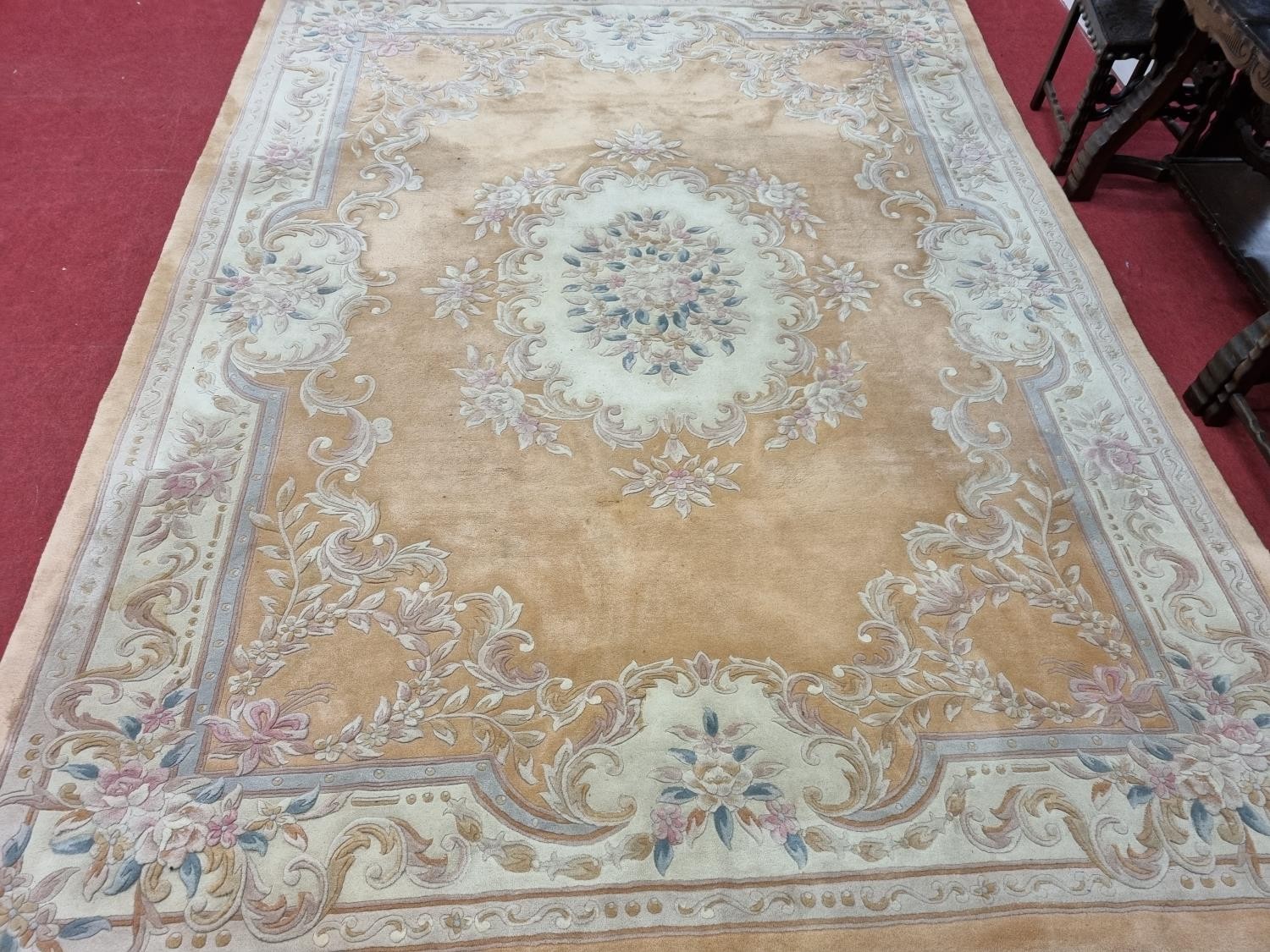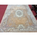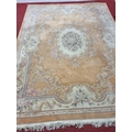 A large pink ground carpet with central floral design multi floral borders and allover decoration. 390 x 275 cm approx.