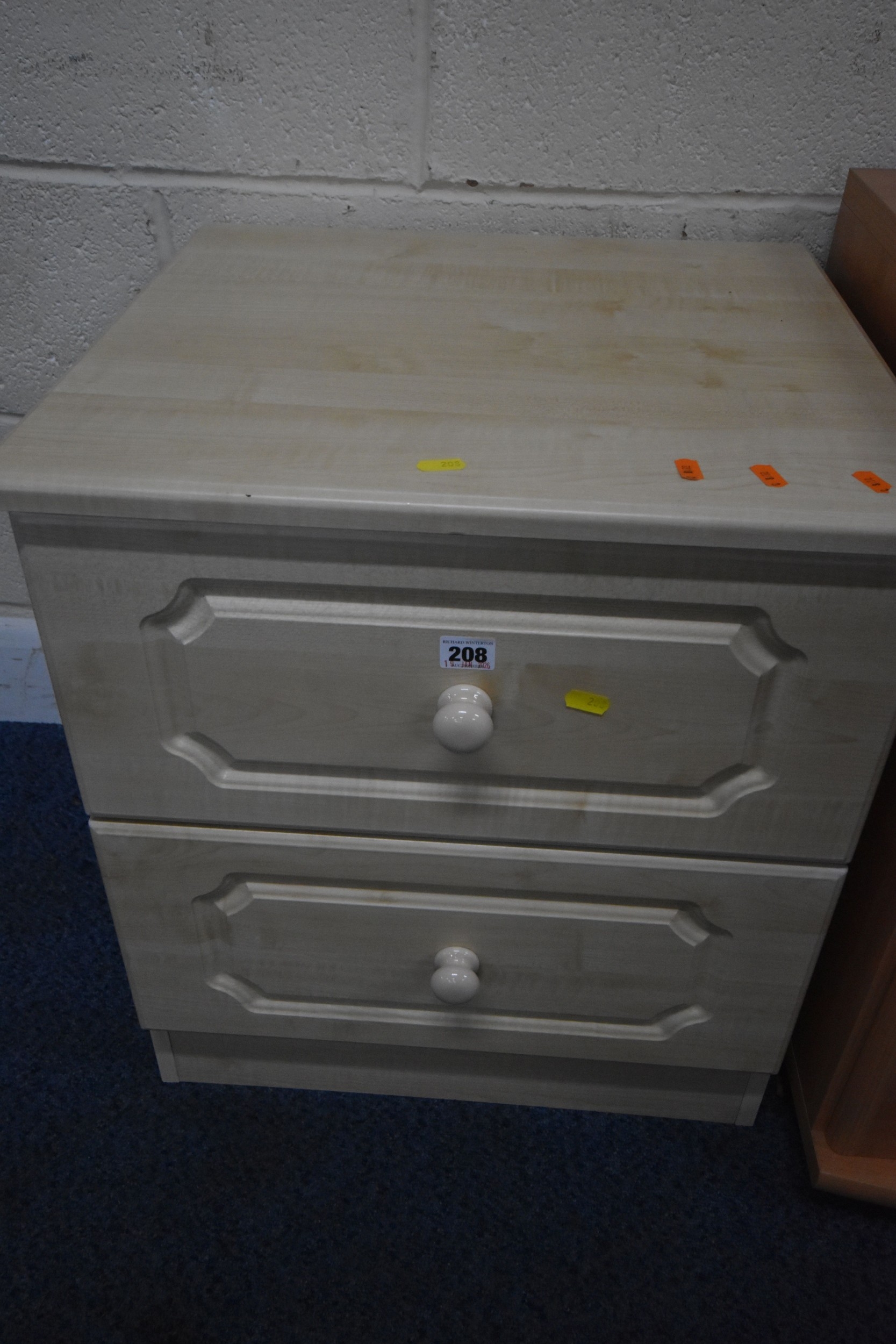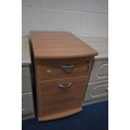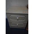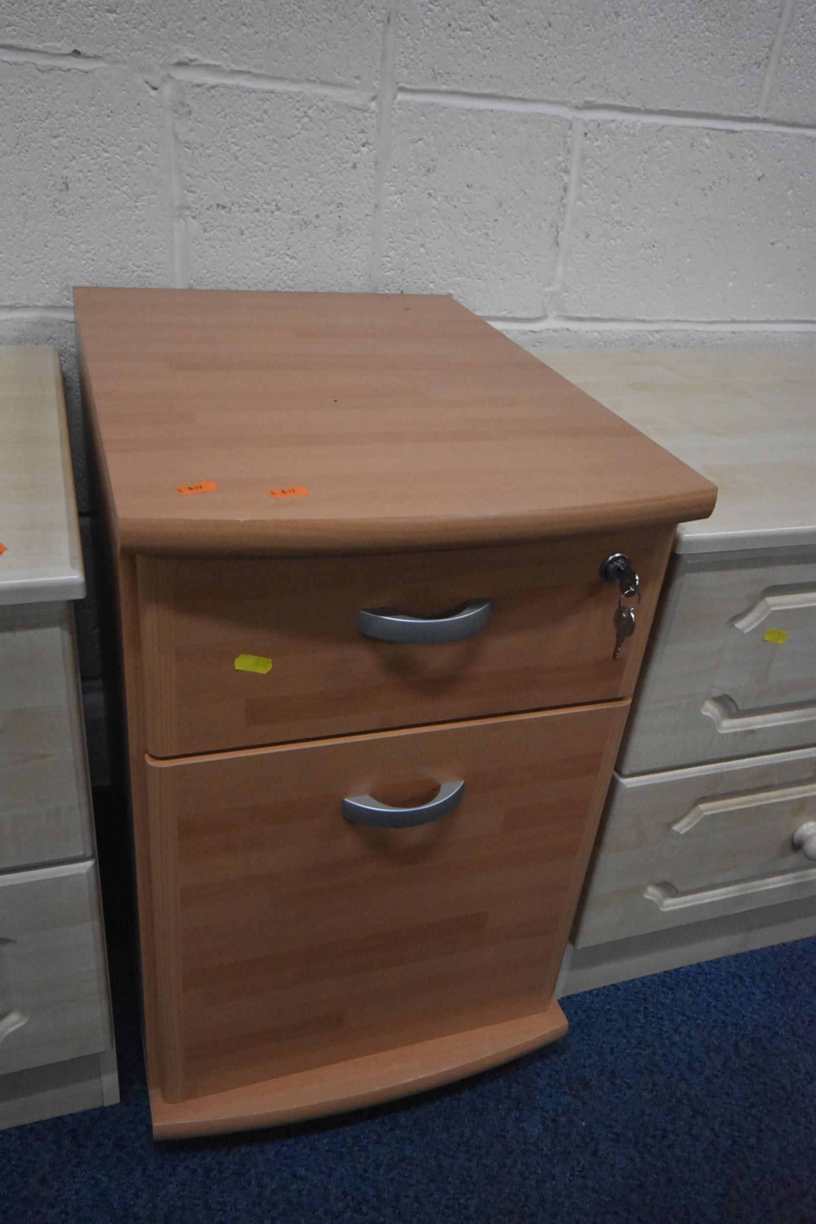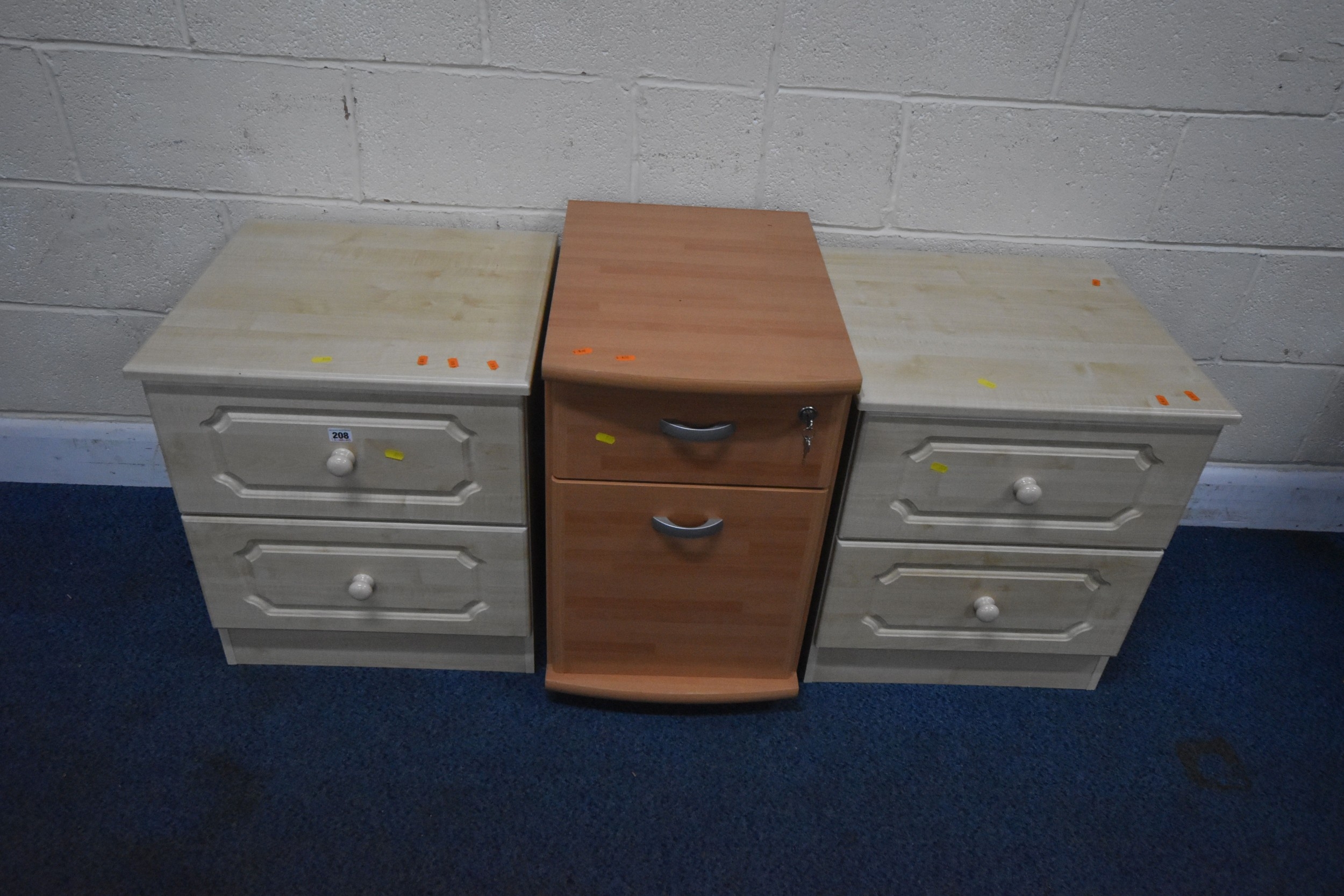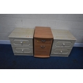 A PAIR OF MODERN TWO DRAWER BEDSIDE CHESTS, width 53cm x depth 50cm x height 59cm, along with a two drawer filing cabinet, condition report: filing cabinet with two keys, all with general signs of usage (3)