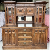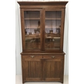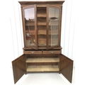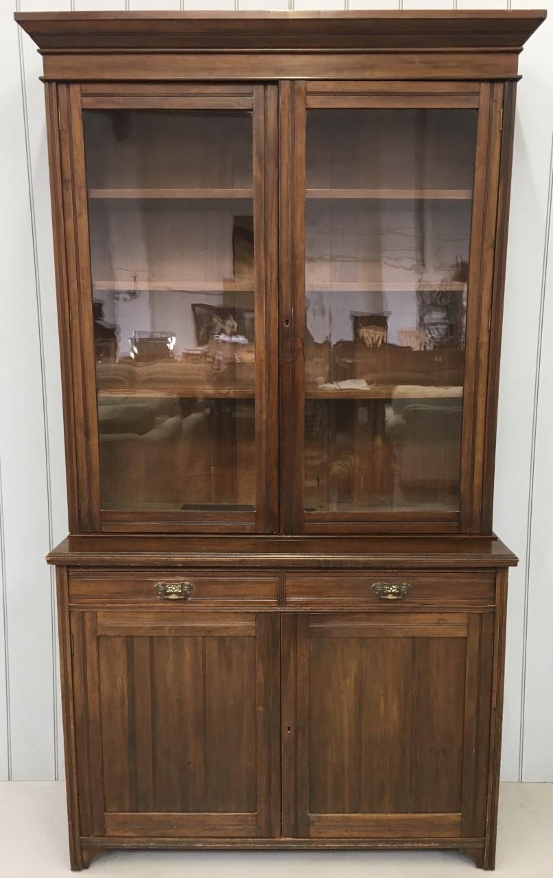 A tall, Edwardian Library Bookcase. Three-shelved, glazed cupboard over two drawers, over twin cupboard. Brass handles. No key present.