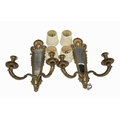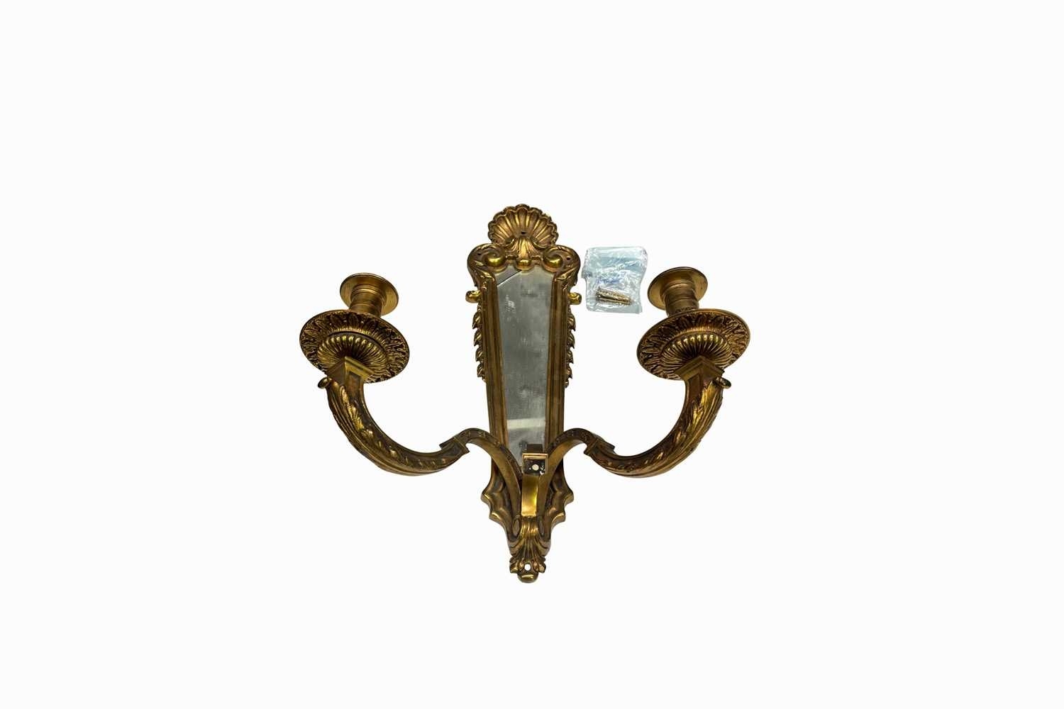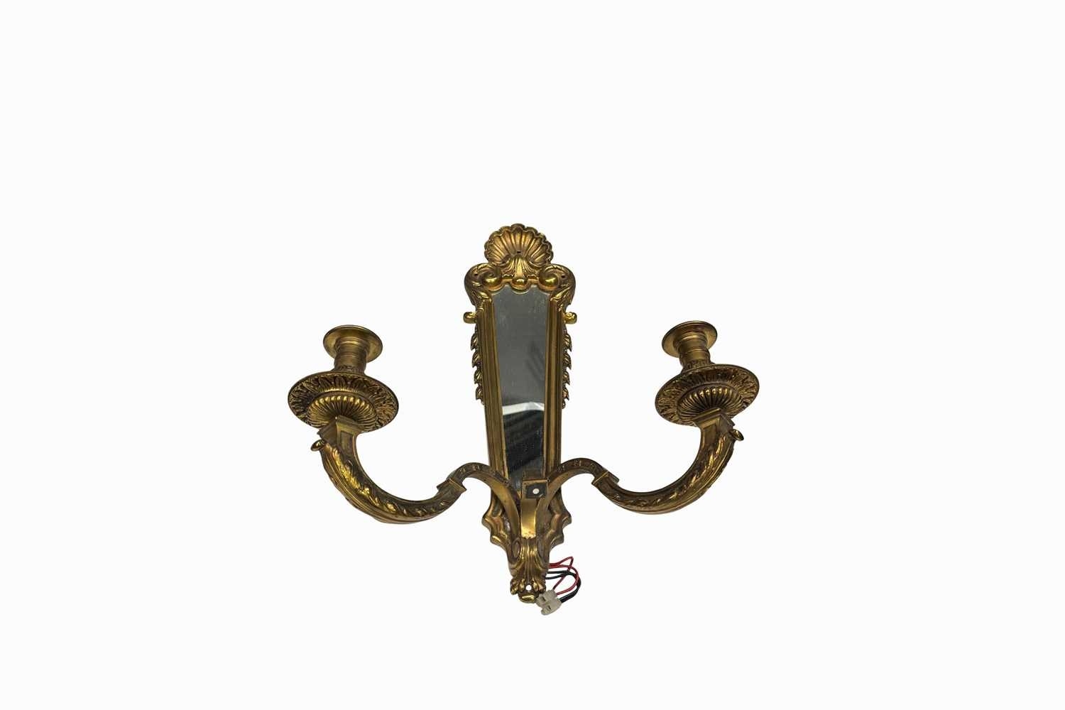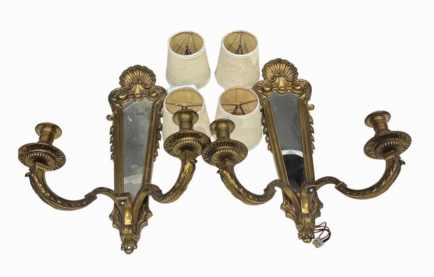 A pair of 18th century style two arm brass wall lights with framed mirror back, the mirror mounted by a clam shell with foliate and floral elements to the frame, with two ornate cast brass branches, h: 45cm, w: 31.5cm, d: 18cm (2 with shades) Provenance: from the collections of two prominent Anglo-Irish and British aristocratic families, directly descended from Lord Patrick James Stuart (1794- 1859), brother of John 2nd Marquess of Bute and great grandson of John Stuart, 3rd Earl of Bute (1713 -1792), Prime Minister to George III, resident at Cardiff Castle, Wales; Dumfries House, Scotland and Wilton Crescent, Belgravia, London