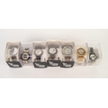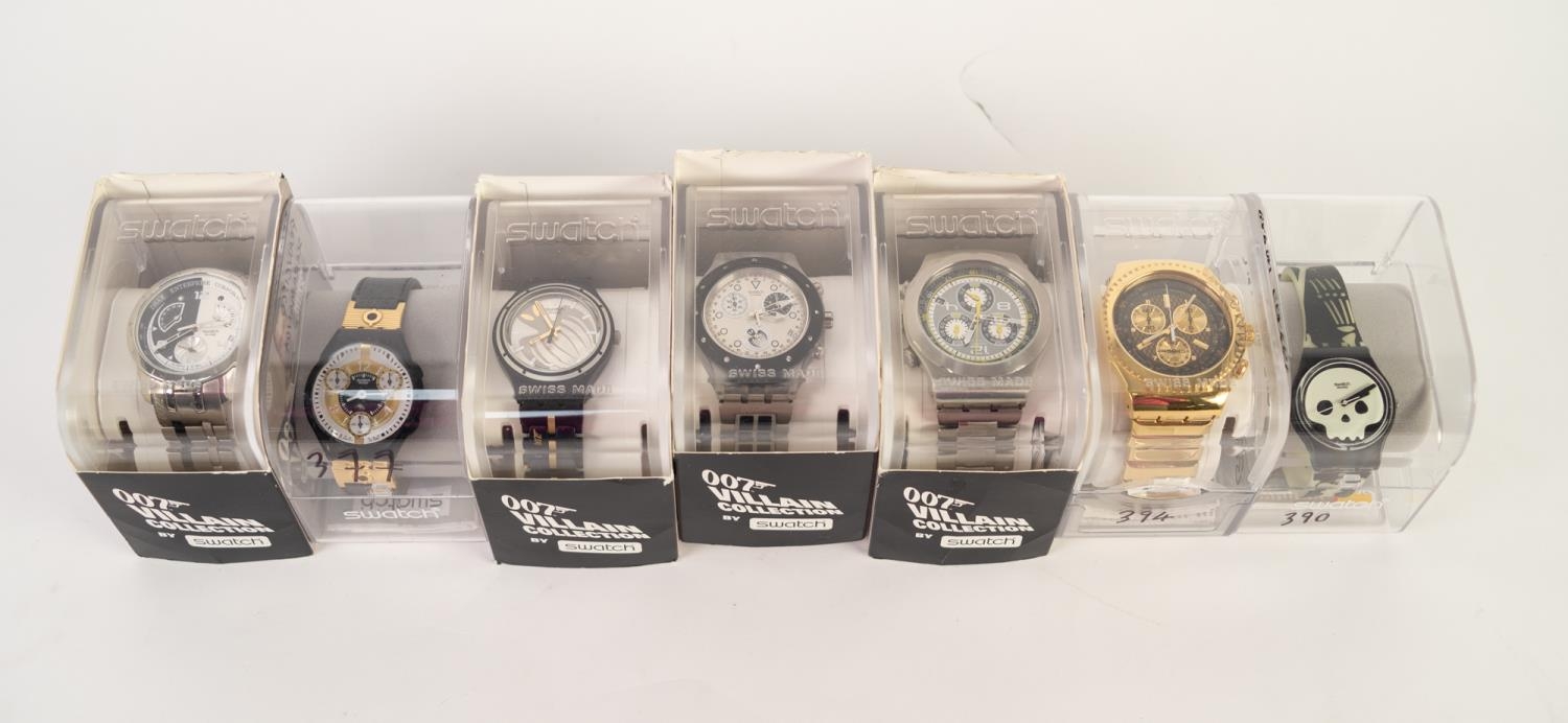 SEVEN LIMITED EDITION SWATCH ‘007 VILLAIN COLLECTION’ WRIST WATCHES, comprising: ‘HUGO DRAX’, ‘BLOFELD’, ‘JAWS’, ‘EMILIO LARGO’, all with pictorial card sleeves, ‘GOLD FINGER’, ‘BARON SAMEDI’ and ‘FRANCISCO SCARAMANGA’, all boxed and with paperwork, the last tree with names written on the Perspex boxes in black marker pen, (7)