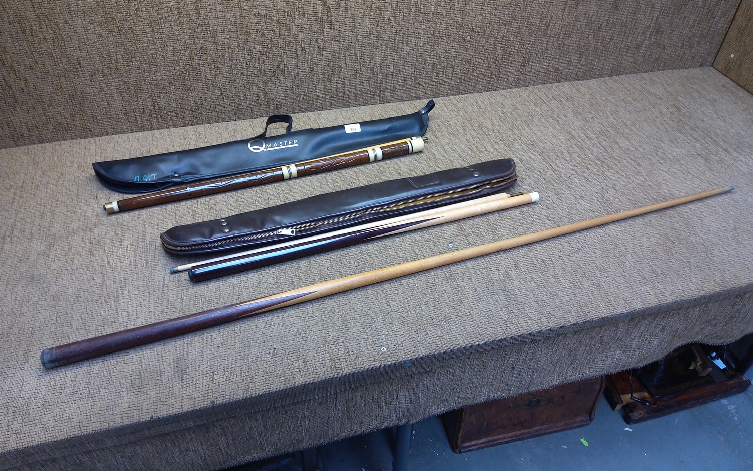 Three 1980s pool and snooker cue's including Riley Burwat Limited Accrington one piece cue.