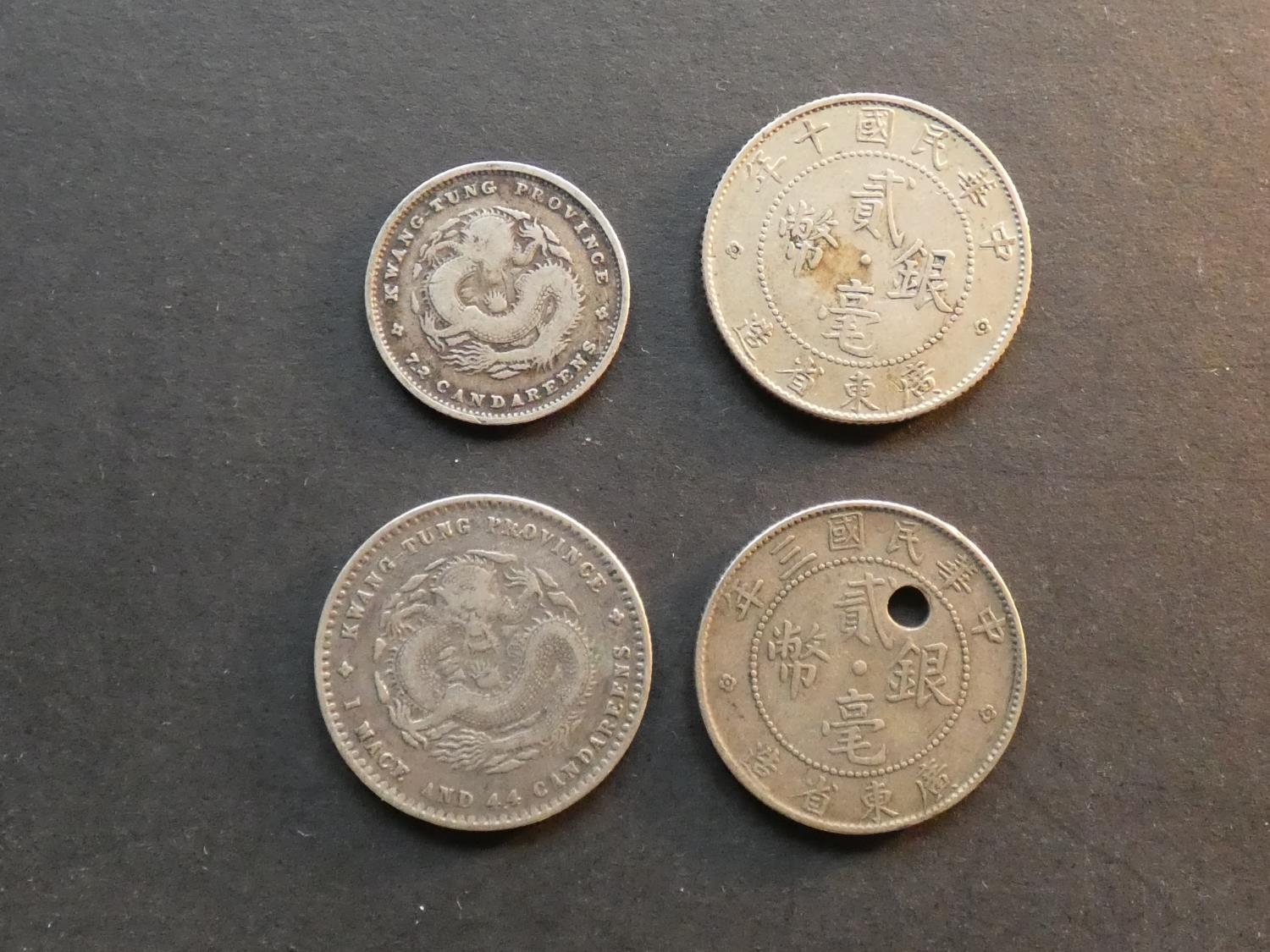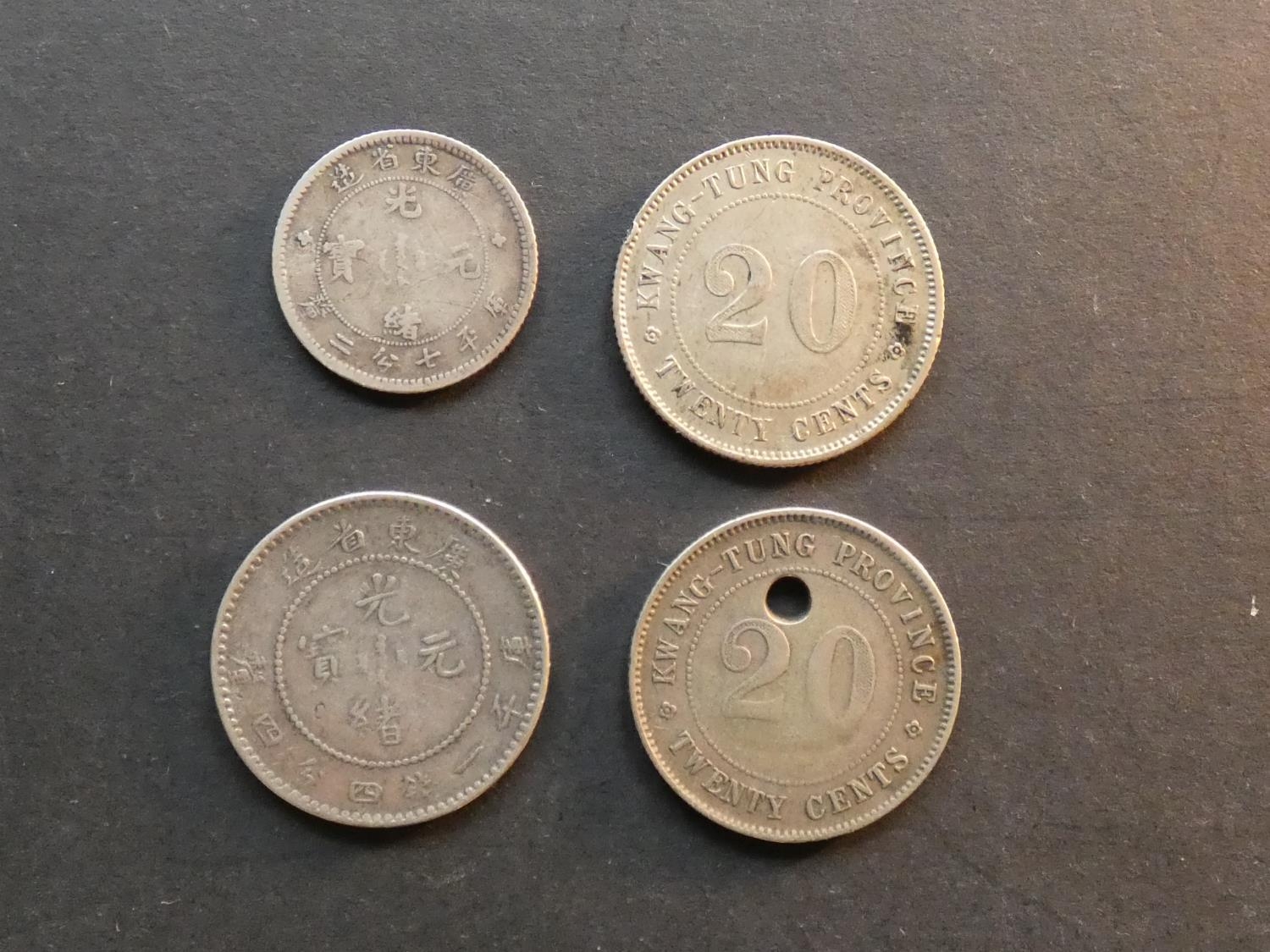 CHINA. Guangdong Province. Various, including Guangxu Eemperor (1875-1908), 10c, ND(1890-1908), Y200 & 20c, ND(1890-1908), Y201, and Republic issues; 20c, Year 10 (1921), Y423 & Year 3 (1914), Y423, holed. Mixed grades and condition, VG to F (4)